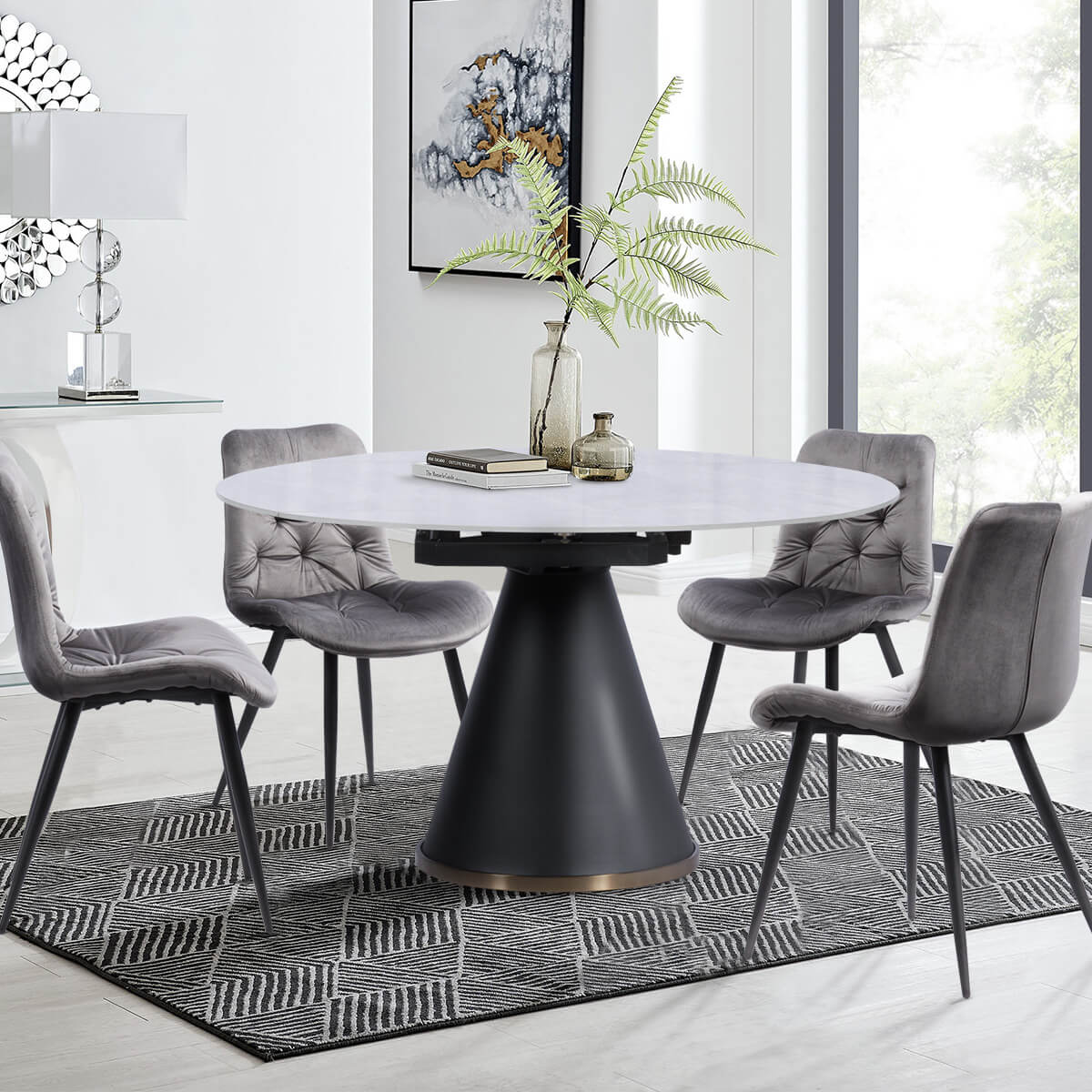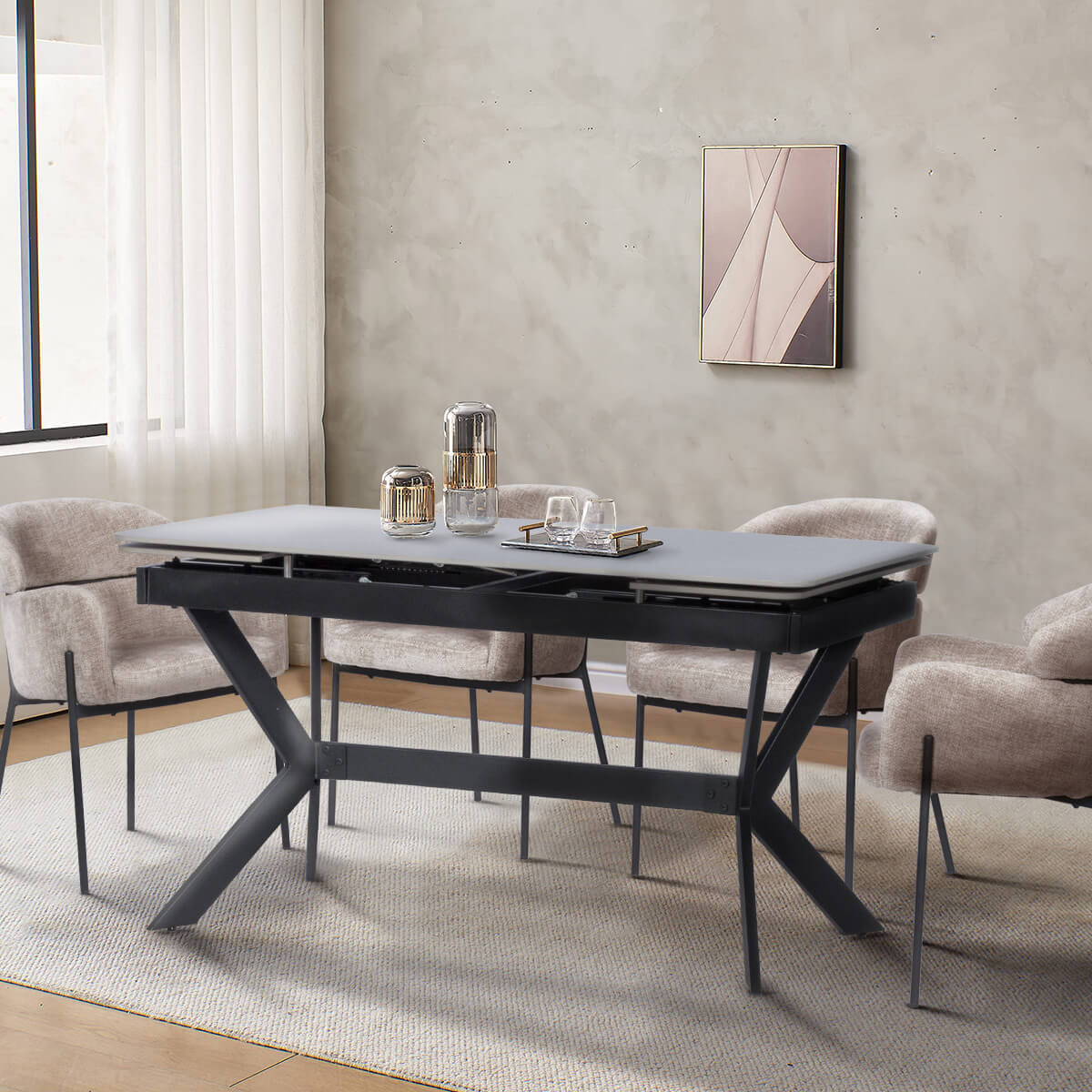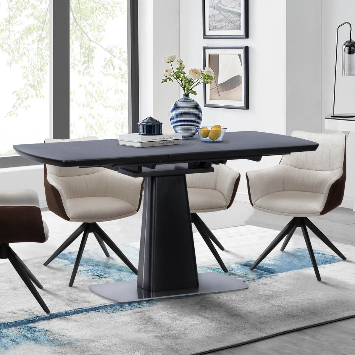 Несъмнено белият мрамор придава изящност на помещението, но какво ще кажете за сивия? С такъв ефект е керамичният плот на модел ELISTA. Разтегателен механизъм му помага да достигне дължина от 196 см, за да събере любимите ви хора около трапезата. Основата е отново нестандартна и модерна, като осигурява удобно и функционално пространство за краката.