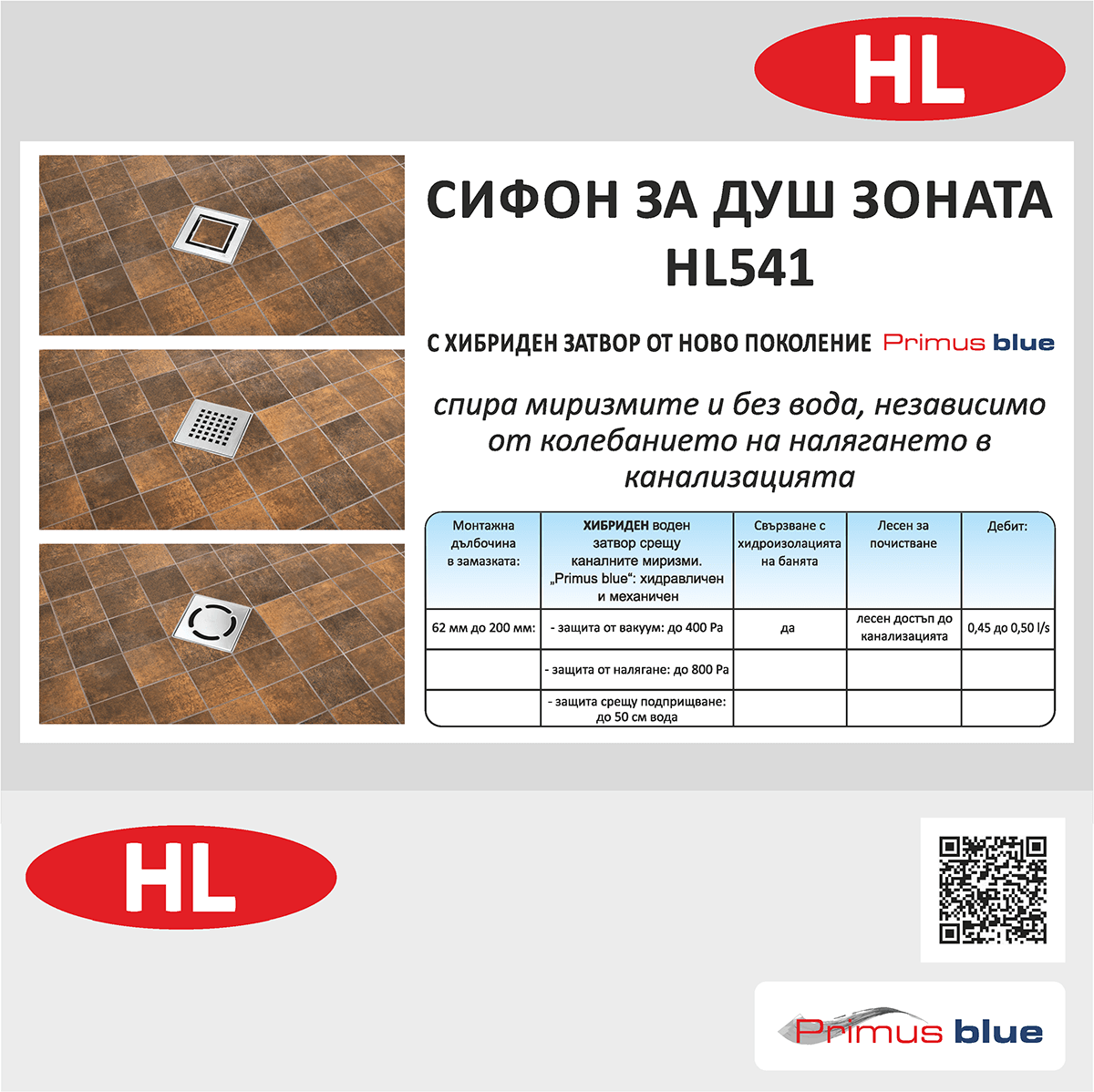 Малкият брат на вече познатия сифон за душ-пространството HL540 „Primus Drain“ впечатлява не само с всички известни досега предимства, но и със значително по-малка монтажна дълбочина (62мм!).