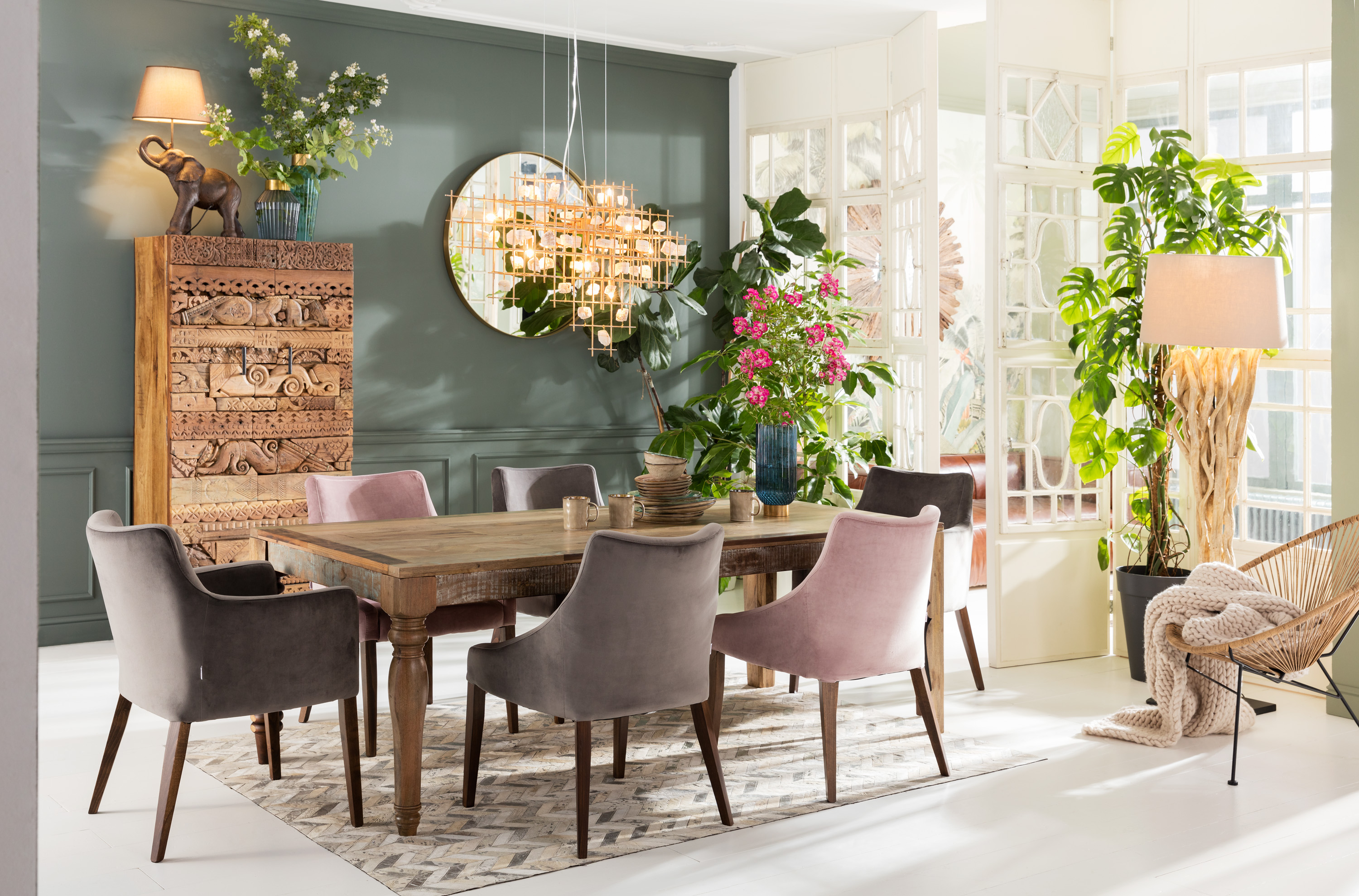 Формата на плетеното кресло наподобява небрежен шезлонг от клуб в Ибиса. Стъклените аксесоари и изчистените месингови рамки ограждащи кръглите огледала създават модерна, интригуваща двойнственост.