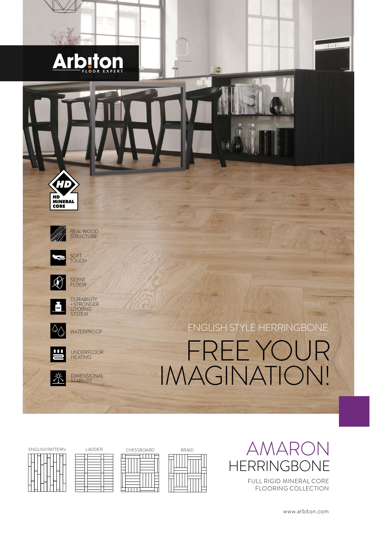 Amaron Herringbone английски стил с HD Mineral Core не е просто нова колекция за пода, тя събужда въображението ви, вдъхновява и изпълва сетивата. Класиката отново е на мода! Нова колекция, създадена, за да съчетае класическия дизайн с модерна технология. Класически английски стил - рибена кост с широка дъска, но водоустойчив и виокоизносоустойчив под за цялото пространство.