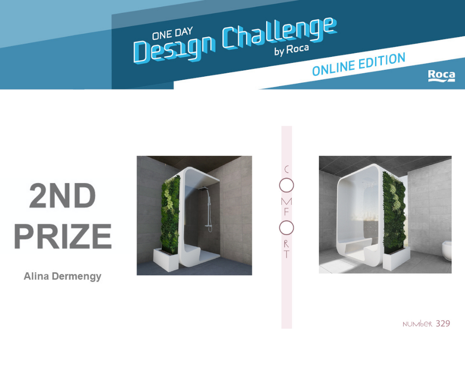 Втора награда и 1000 лв. бяха присъдени на проекта Comfort / Shower for two от Алина Дерменджи, студент в Университета по архитектура, строителство и геодезия, София. Проектът разчита на функционалност, съчетана с решение за устойчиво управление на водния ресурс.