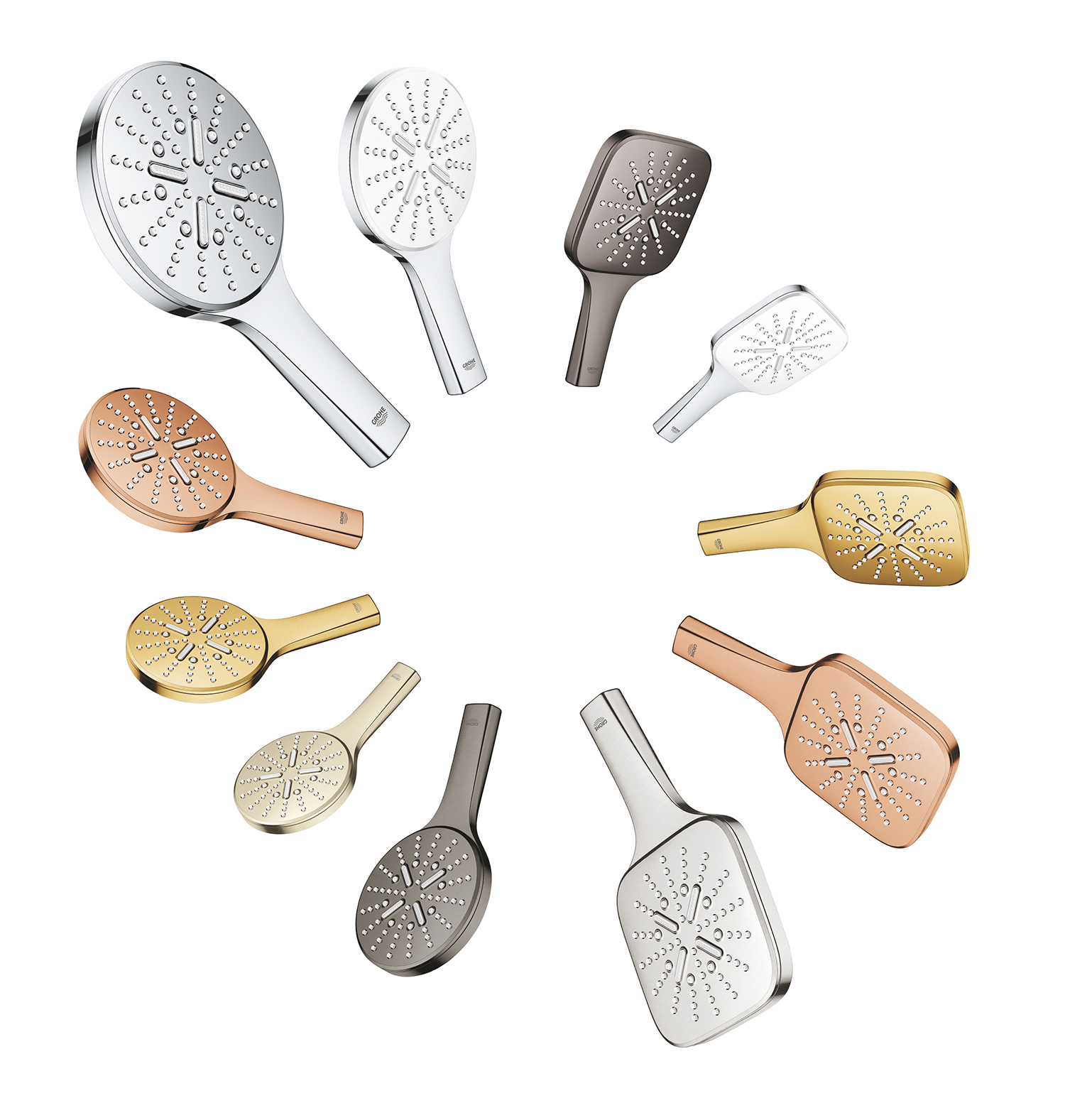 За перфектно координиран дизайн в банята, съобразен изцяло с личния вкус на потребителя, ръчните душове GROHE Rainshower SmartActive са налични в два размера – 130 mm и 150 mm, 11 цвята и кръгъл или квадратен дизайн. Това ги прави изключително подходящи за комбинация с душ пити като GROHE Rainshower 310 SmartActive или Rainshower 310 Mono, Rainshower странични дюзи, както и термостати за вграждане или иновативния контролер GROHE SmartControl.