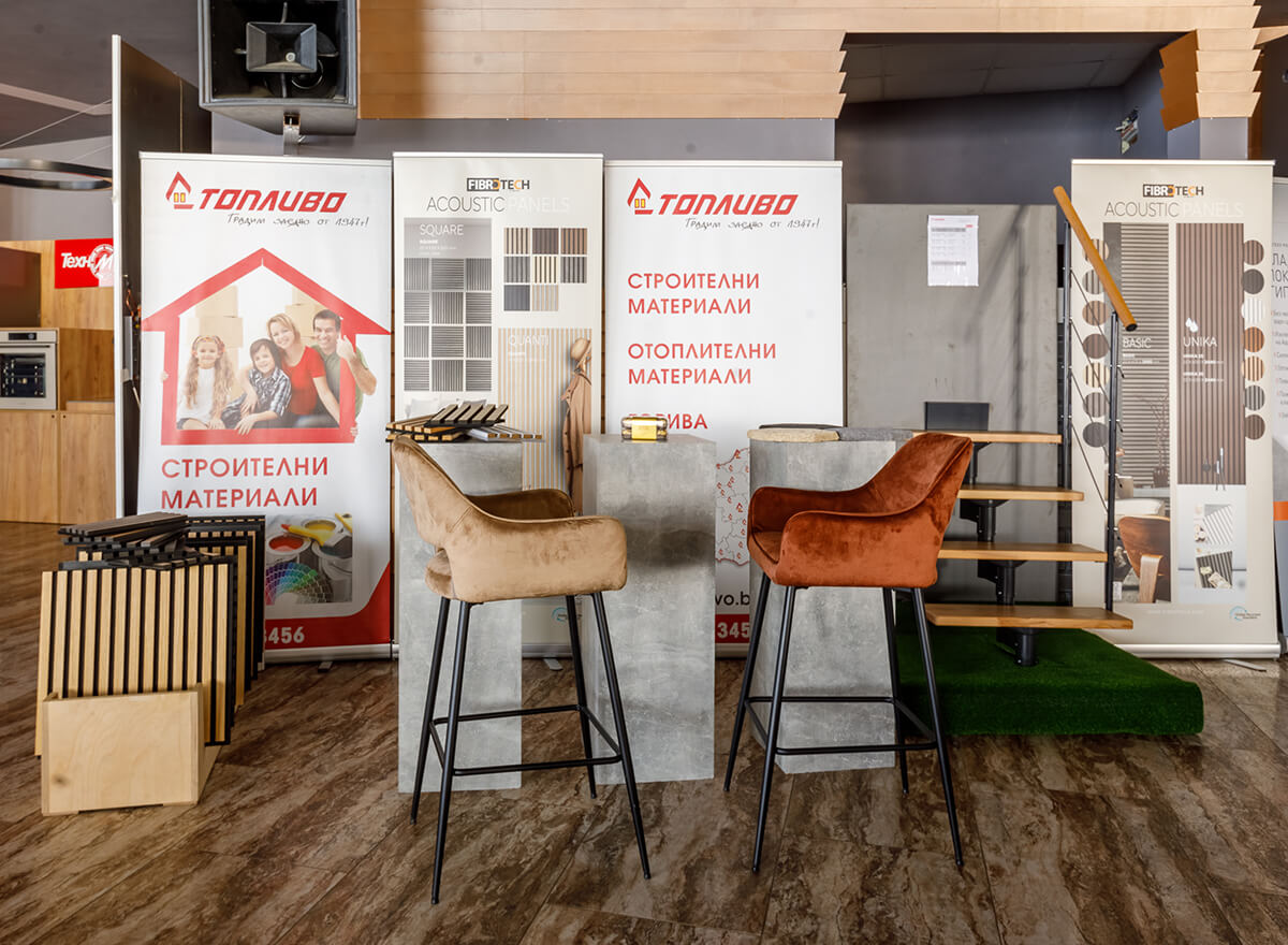 На щанда си, фирма Топливо АД представи своите Fibrotech -акустични панели с множество вариации на форми, цветове и дизайн и Dolle – световен лидер в производството на тавански , вити и модулни стълби .