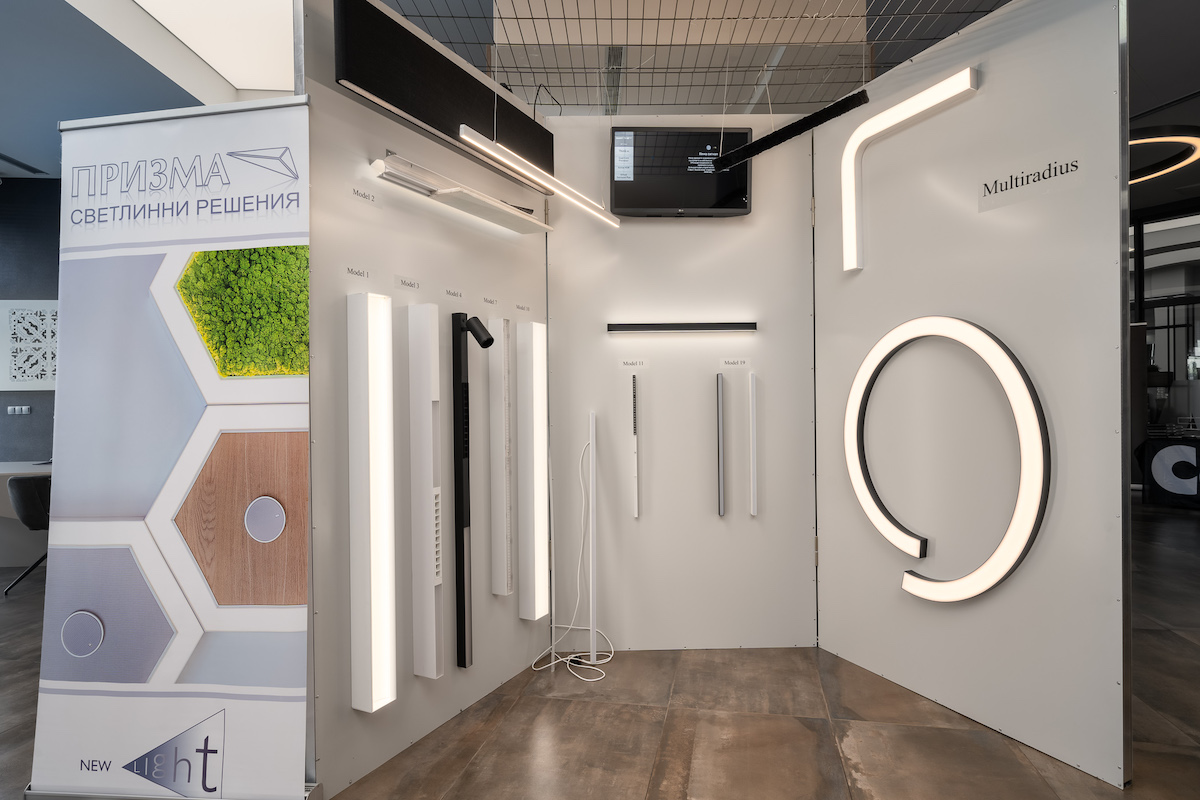 От компанията представиха новата ни система Multiradius,с която може да се правят осветителни тела със всякакви форми и дължини - Multiradius е със съвсем минимална височина от 42мм. Също така представиха и профил за фин завършек на видими ръбова на гипсокартонови тавани, чрез които ръбът на картона вече е почти невидим.