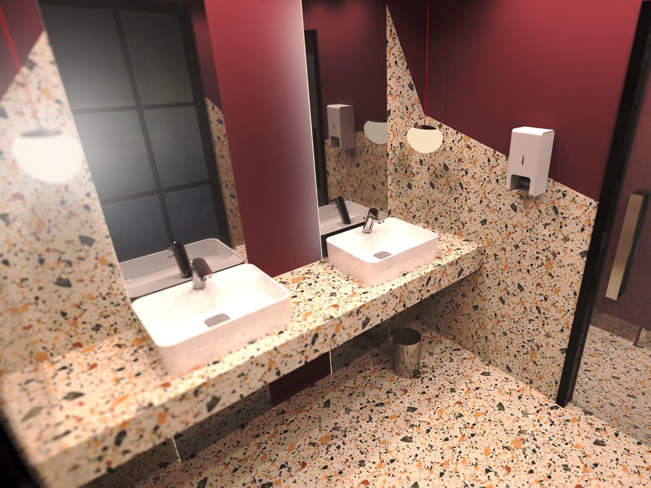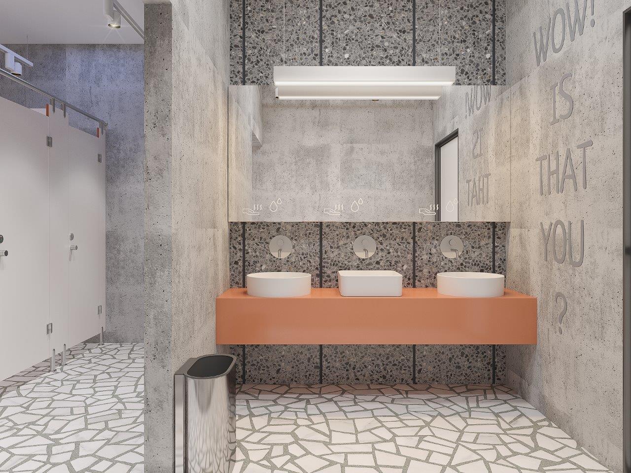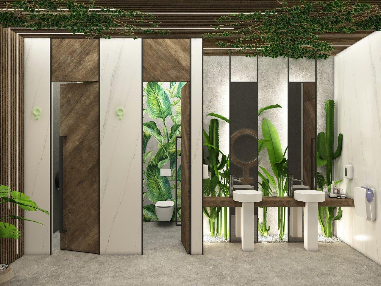 Обществените санитарни помещения се очаква да задоволят много по-широка палитра от вкусове. Това, разбира се, не прави задачата на дизайнера особено лека. Тези помещения на обществени места винаги ще бъдат предизвикателство за архитектите и дизайнерите в намирането на нови и интересни решения. Строго или фриволно, класическо или модерно, „Санитарното помещение в офиса“ е съобразено с характера на средата, понякога – и с естеството на бизнеса, но винаги - със стила времето.