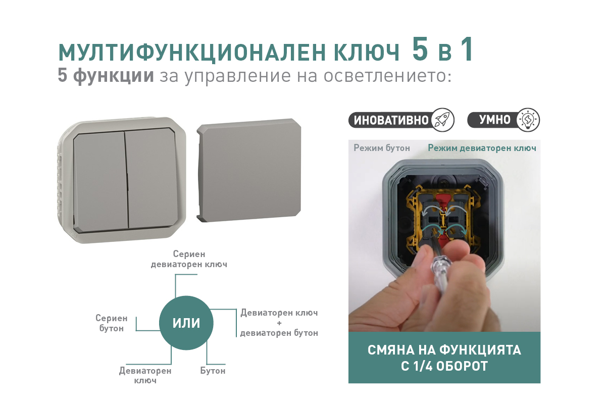Мултифункционалният ключ Plexo e съчетание от няколко функции в един модул! Отнема само едно завъртане от ¼ за преминаване от една функция към друга. Той е идеалното решение за проекти по реновиране или ново строителство благодарение на лесната си поддръжка и голяма гъвкавост!