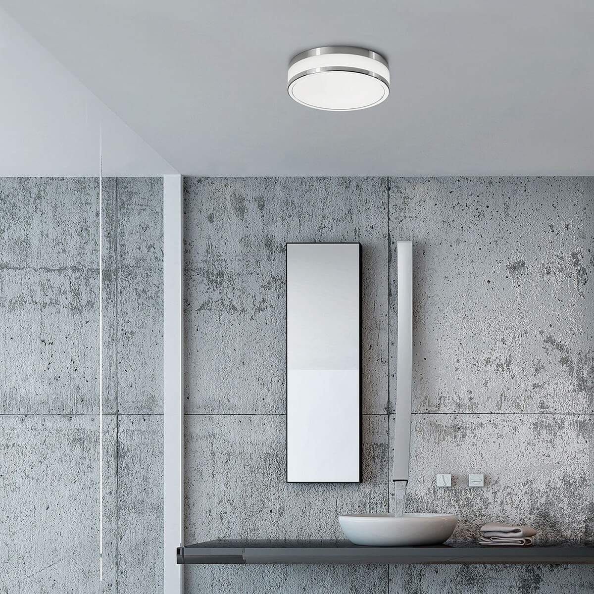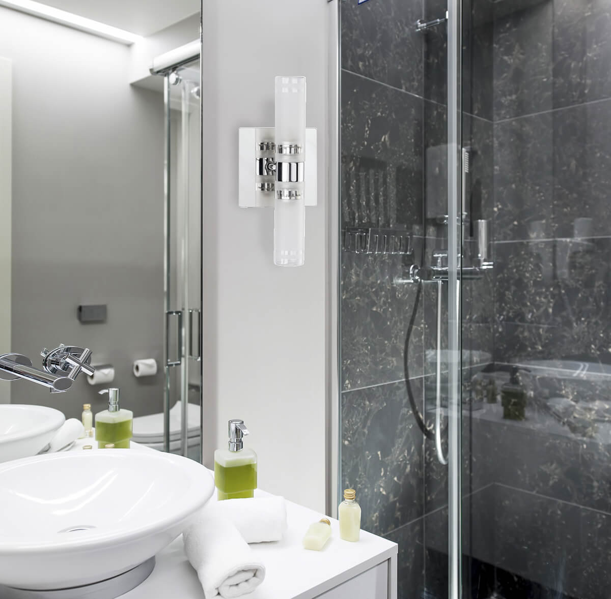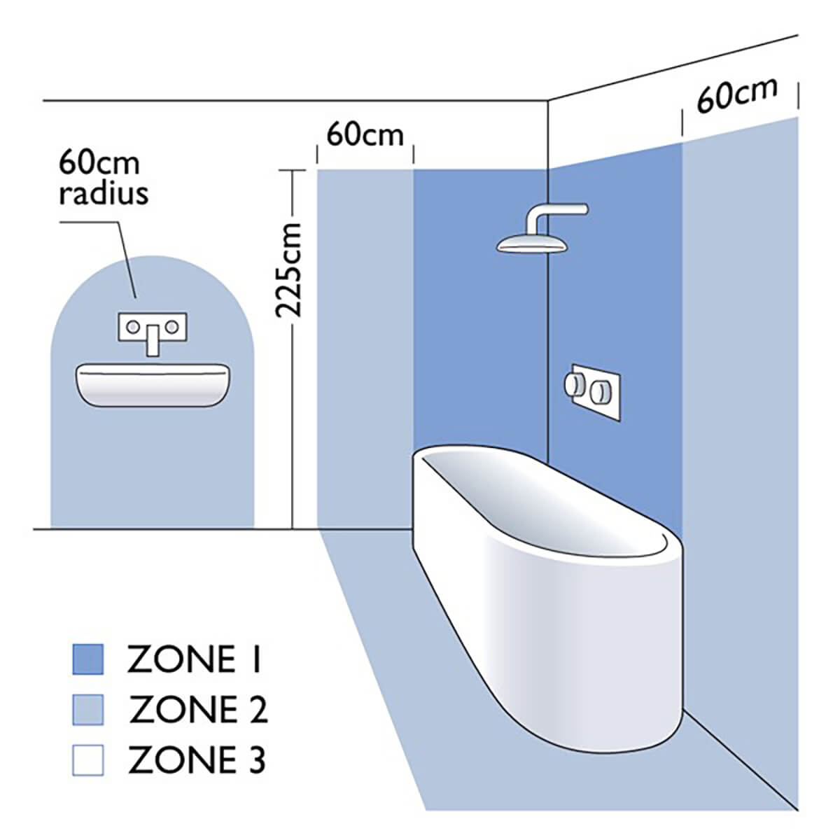Всички лампи, които поставяме в банята, трябва да имат определена степен на защита от влага и пръски вода. Индексът, с който означаваме степента на защита се нарича IP и е сертифициран от IEC 60529. IP означава International Protection. След абревиатурата IP следват две цифри – първата показва степента на защита от прах и твърди предмети, а втората от вода и течности. При производство на осветителни тела за баня, производителите осигуряват защита минимум IPX4. Колкото по-голямо е числото, толкова осветителното тяло е по-защитено. В случая „4“ означава „Защита от пръскане от всички посоки“. Въпреки това се избягва поставяне на осветителни тела над душа или ваната, където влажността е най-силна. Все пак в банята има зони, в които влагата не е толкова голяма (виж зона 2 и 3 на схемата) и там може да се използват лампи с по-ниска степен на защита. Но ако в банята при къпане се образуват пръски във всички посоки, защитата трябва да е минимум IP44.