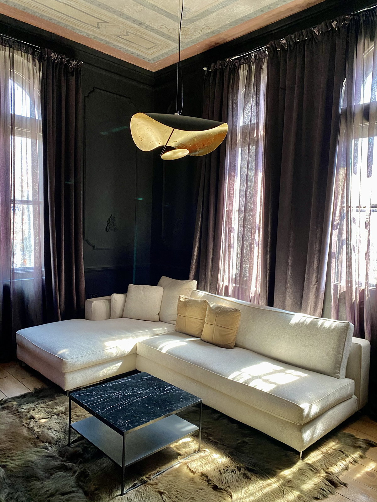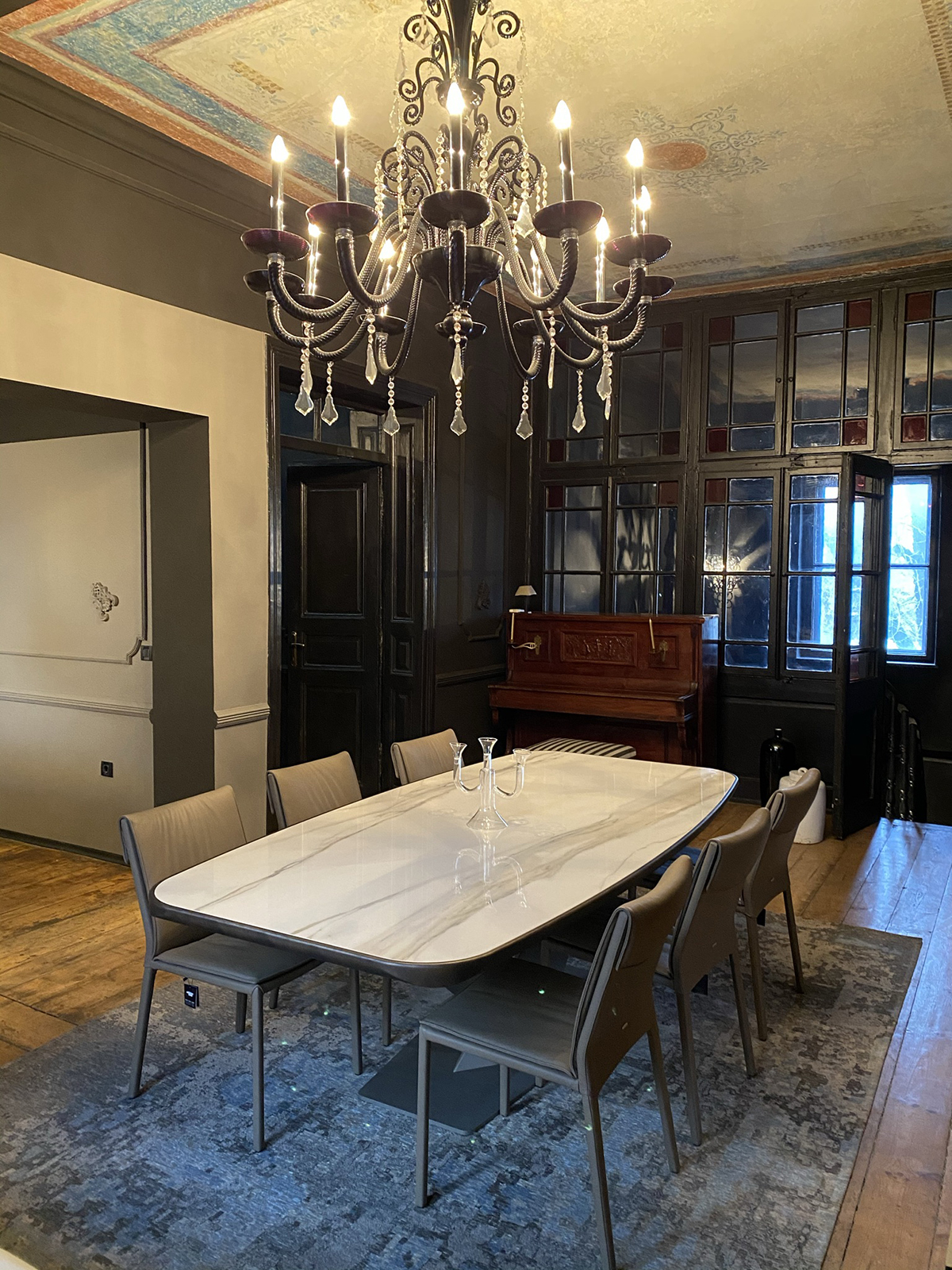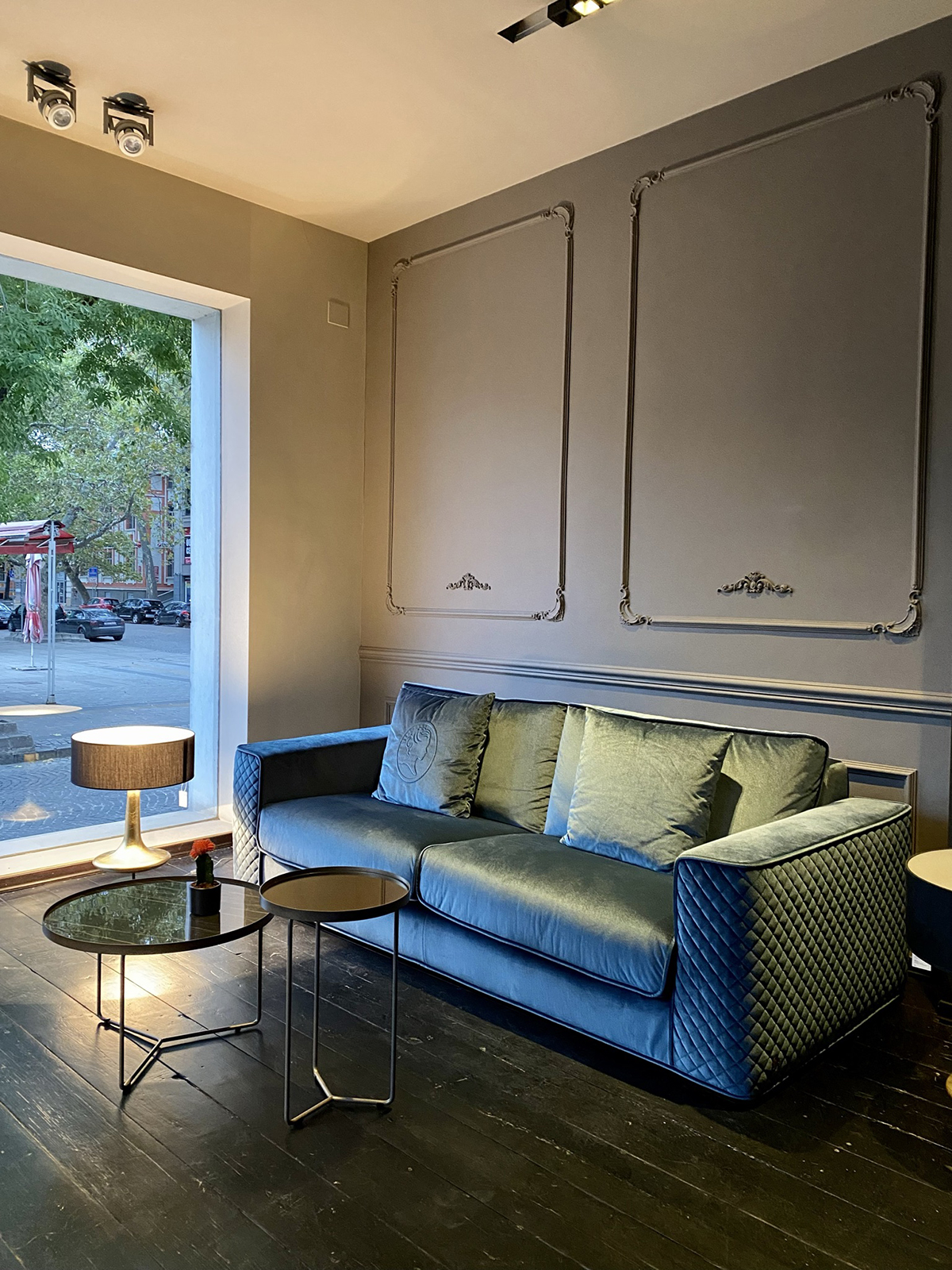 Разхождайки се из пространствата на шоурума можем да се отпуснем в комфорта и естетиката на модели дивани от водещите производители на мека мебел – Minotti, Natuzzi, Gervasoni. В едно от главните помещения като изящен акцент на великолепно изрисувания с фрески таван от 20-ти век е поставено осветително тяло на една от най-старите фабрики в света Barovier&Toso. Кристалният полилей, направен изцяло от мурано стъкло, е емблематичен модел за венецианската фабрика, създадена в далечната 1295 година. Подобни модели украсяват бутиците на световни брандове като Dolce&Gabbana и Louis Vuitton. Светлините на полилея нежно потъват в мраморния плот на трапезната маса с модерно излъчване от Cattelan Italia.