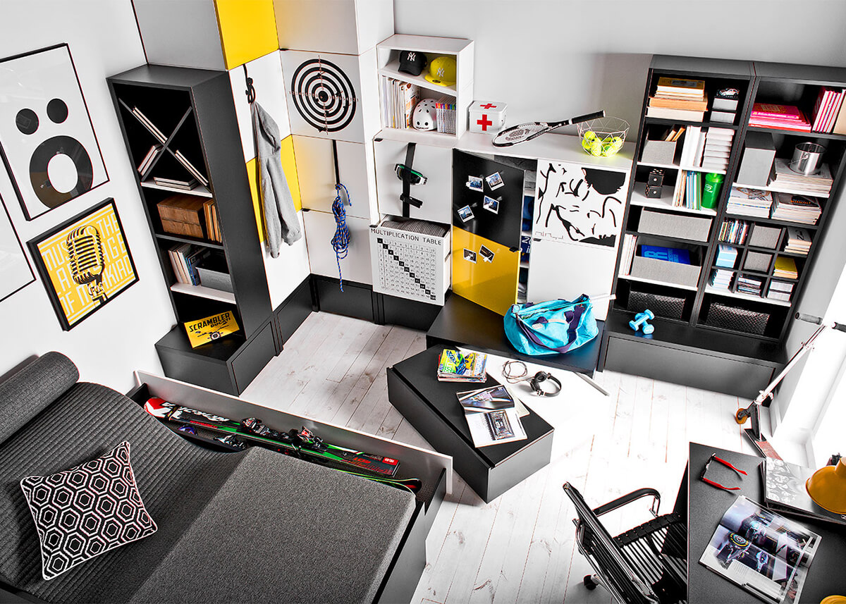 Вниманието към детайлите надхвърля естетиката. Металните дръжки с гумено покритие осигуряват безопасна и лесна употреба, а ъгловите гардероби разполагат с множество релси, регулируеми рафтове и врати, които се отварят под ъгъл, по-голям от 90°, за лесен достъп. С базовите платформи за допълнително съхранение и неутралните цветове на основите, които подхождат на всеки интериор, Young Users не оставя пренебрегнати елементи за постигане на максимална полезност и стил.