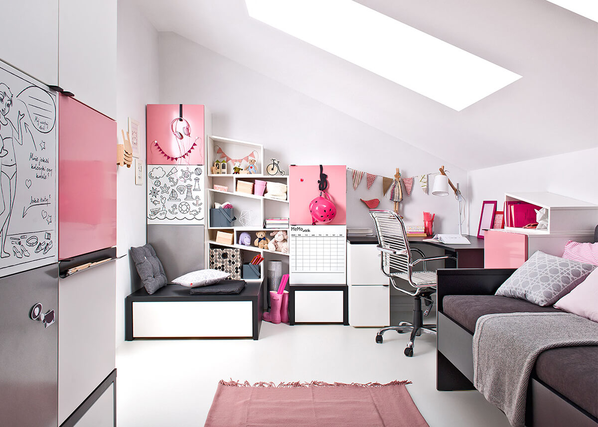Това, което наистина отличава Young Users от другите колекции, е нейната адаптивност. Модулната система е проектирана така, че да расте заедно с детето ви, с функции като регулируеми рафтове, разширяеми плотове на бюрата и преобразуващи се в дивани легла. Мебелите са лесни за пренареждане и могат да се адаптират към различни размери и форми на стаите. Освен това колекцията предлага голямо разнообразие от сменяеми метални покрития, пълнежи и органайзери, което превръща естетическите експерименти в част от ежедневието. Стаята на едно малко момиченце може да се превърне безпроблемно в ателие на моден дизайнер благодарение на креативно проектираните текстилни покрития.
