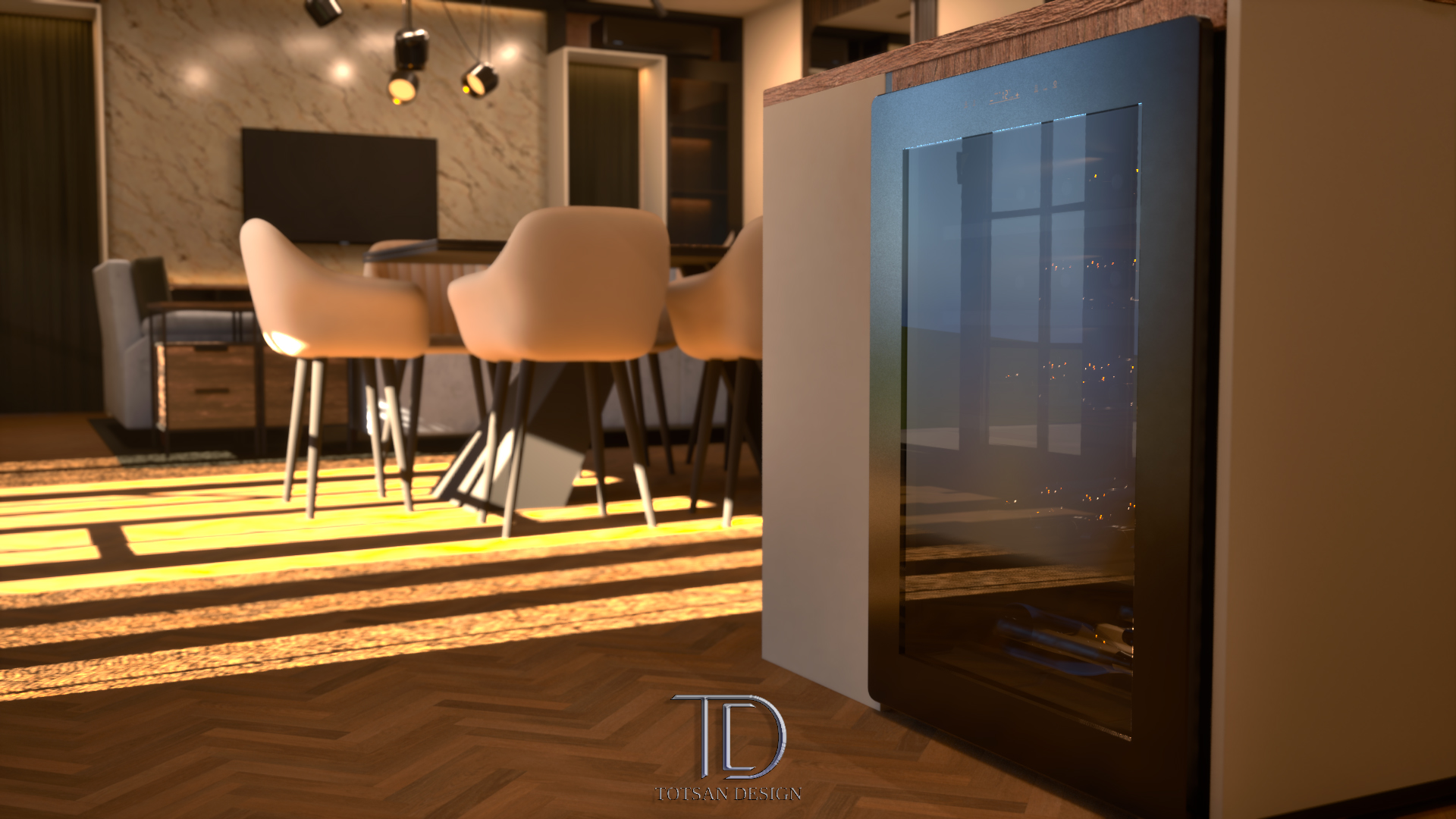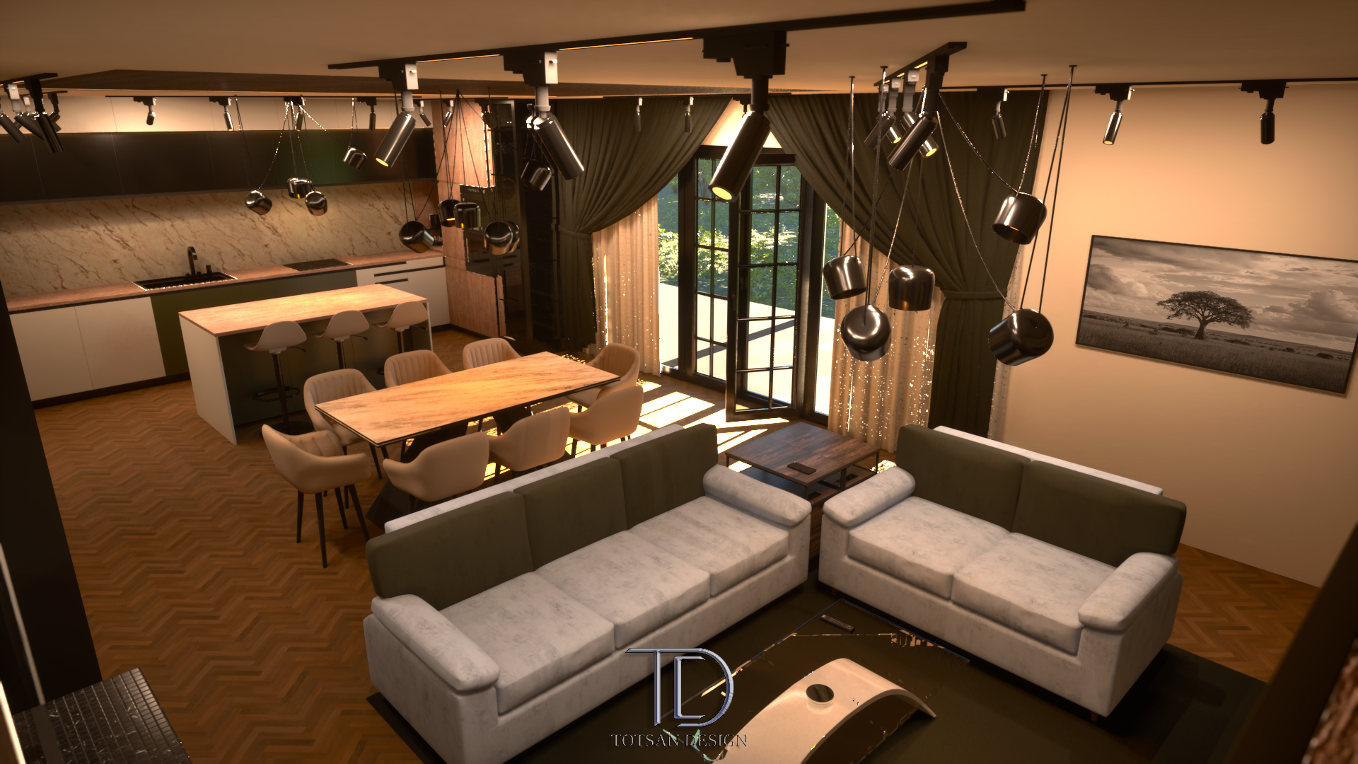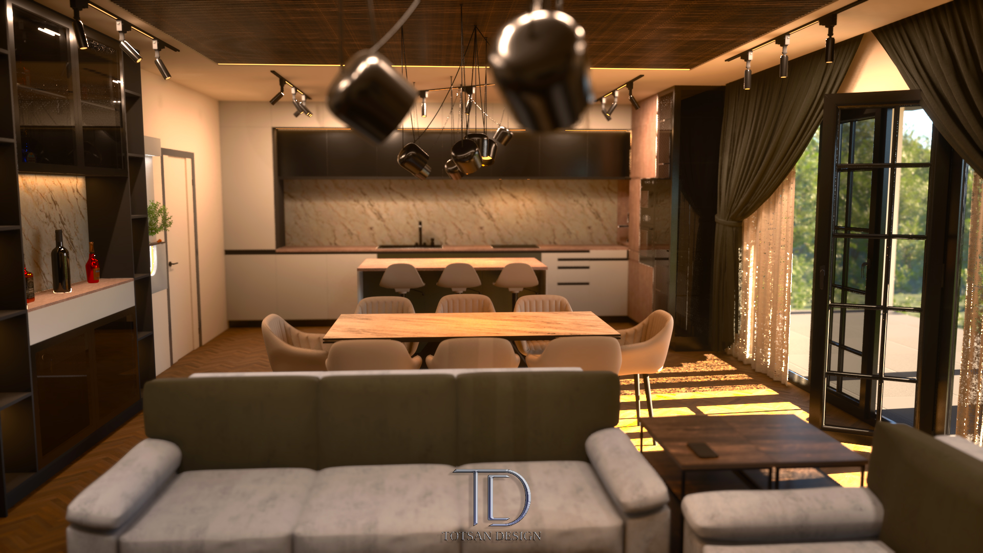 Проектът обединява кухня, трапезария и всекидневна в едно общо, флуидно пространство от 55 кв.м. Планировката осигурява логична ходова линия между зоните, като запазва усещането за простор.