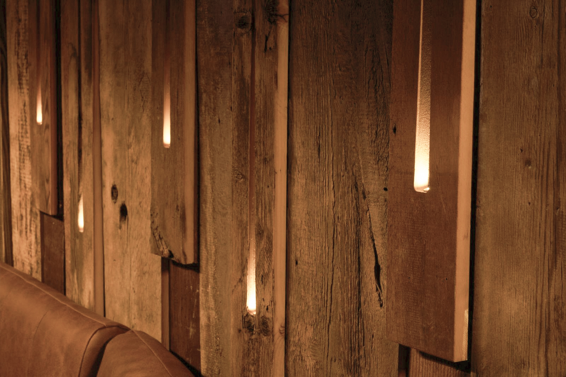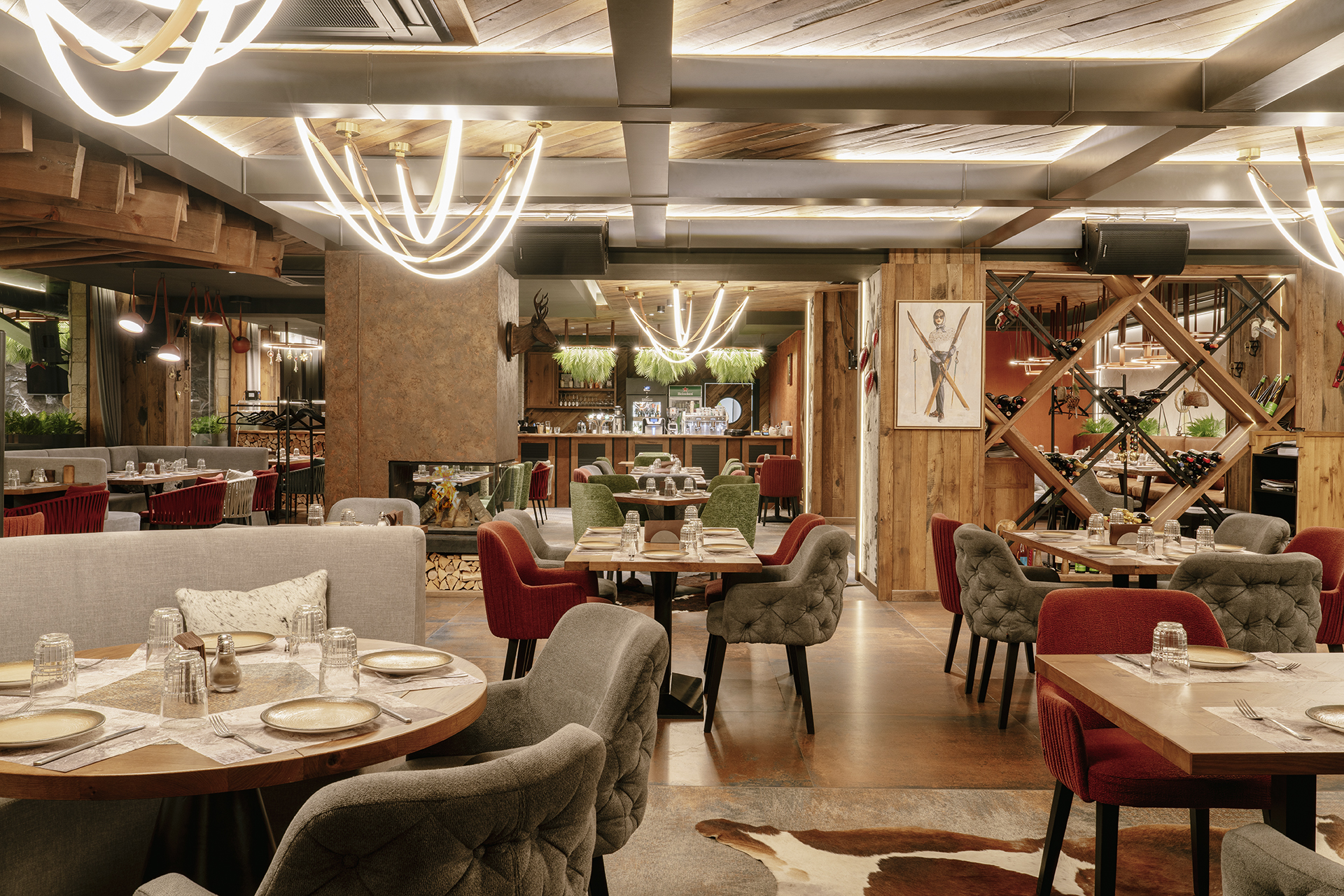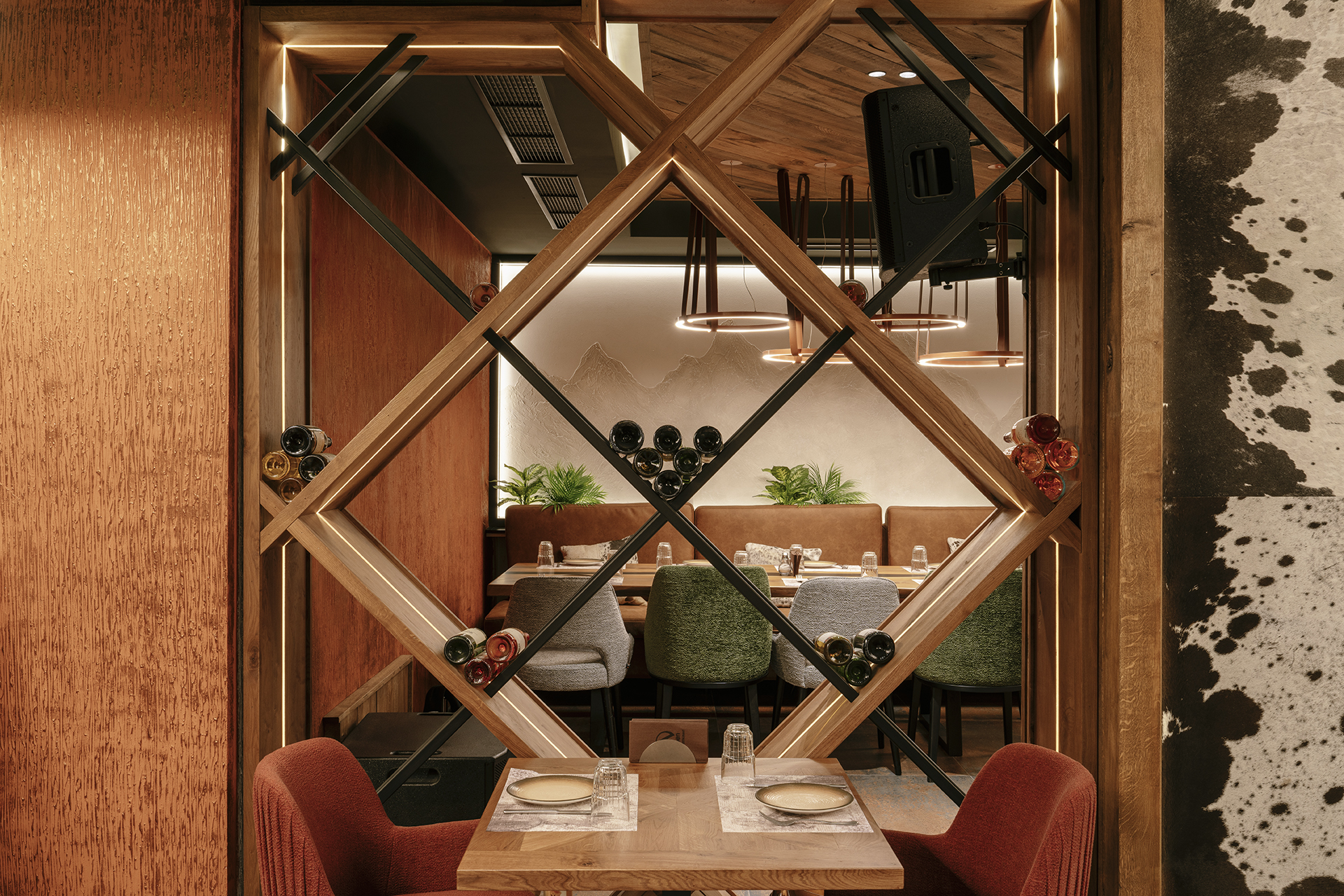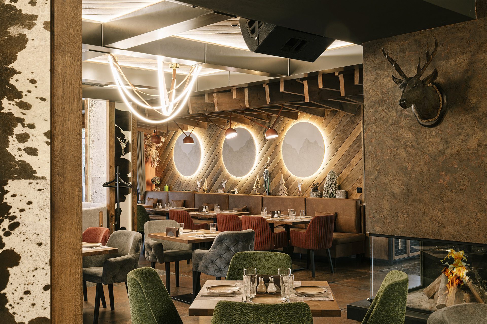 Natural materials are a key focus of the interior. Wood dominates the space through wall claddings, ceiling structures, and custom furniture, featuring pronounced texture and a warm, natural finish. It adds visual depth and creates a sense of stability and authenticity. Cowhide and cowhide-inspired motifs are used as distinctive details that clearly emphasize the mountain character of the restaurant.