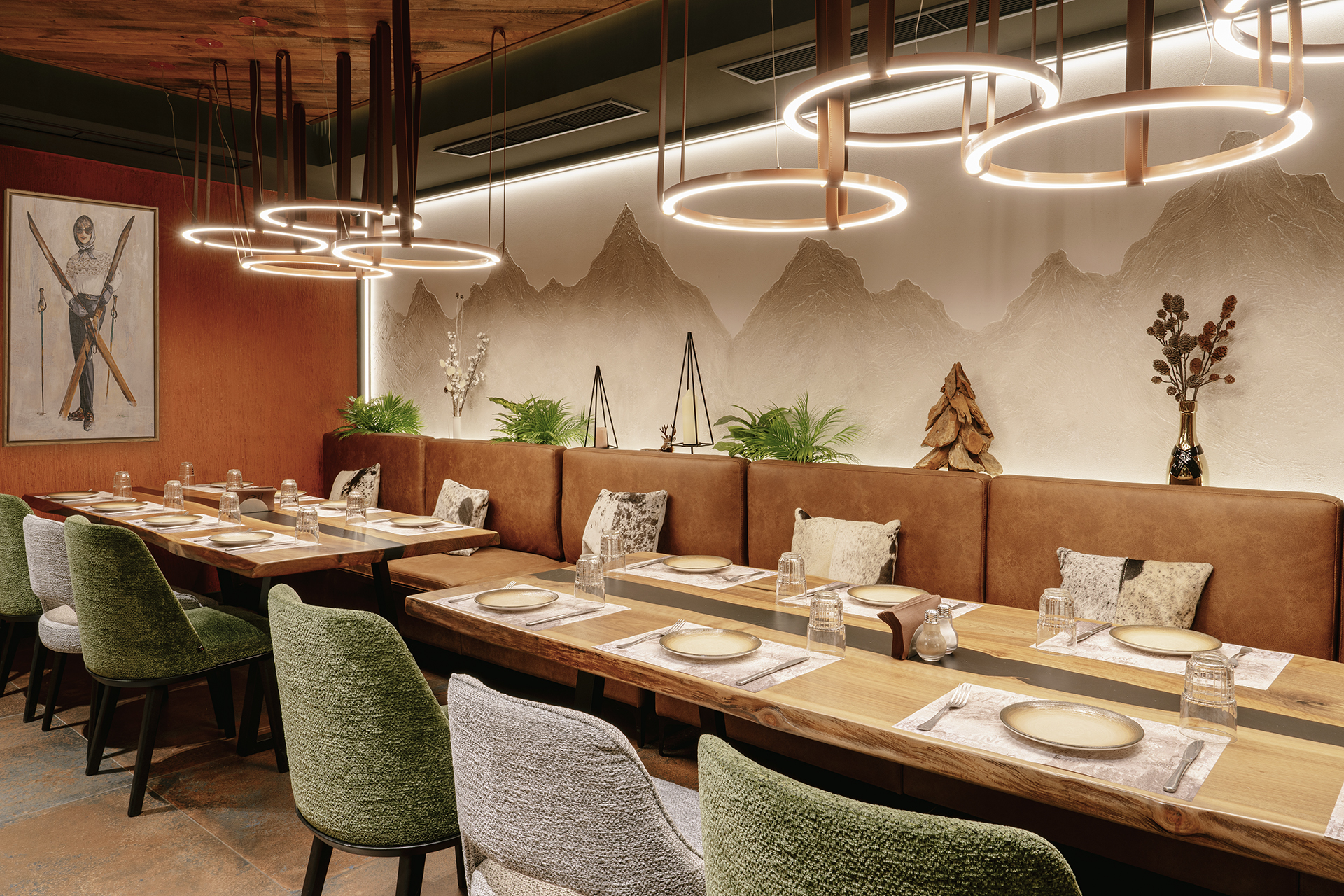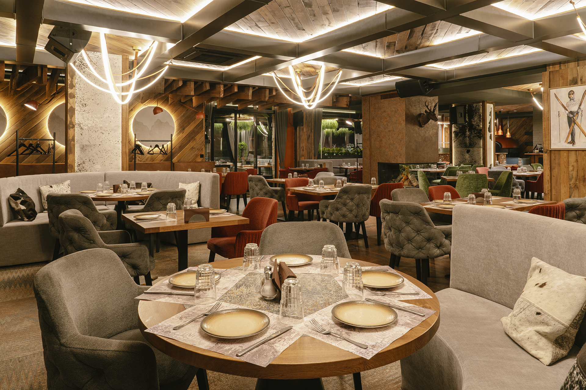 The interior concept of the restaurant is inspired by the cozy atmosphere of Alpine lodges, interpreted in a contemporary and elegant way. The leading idea was to create a space that conveys a sense of warmth, tranquility, and closeness to nature – a place where guests feel genuinely welcome.