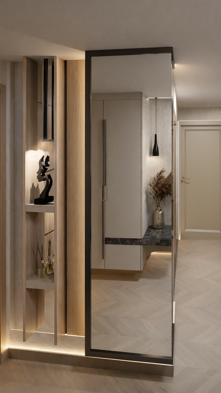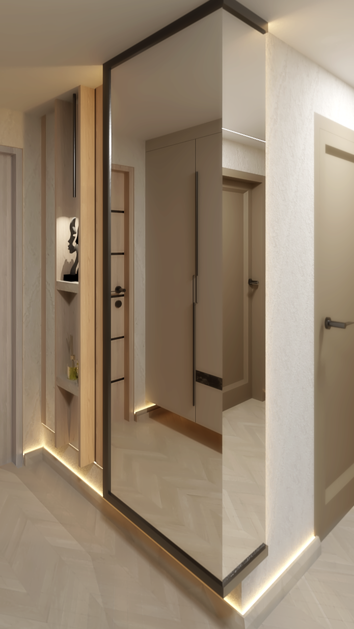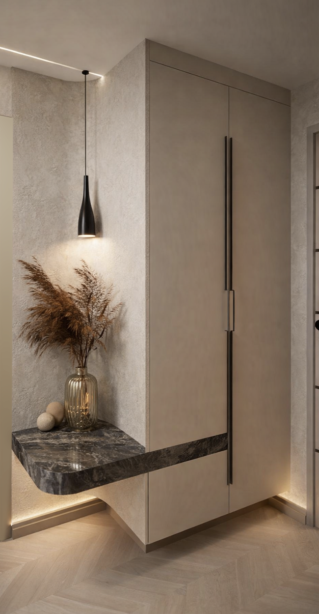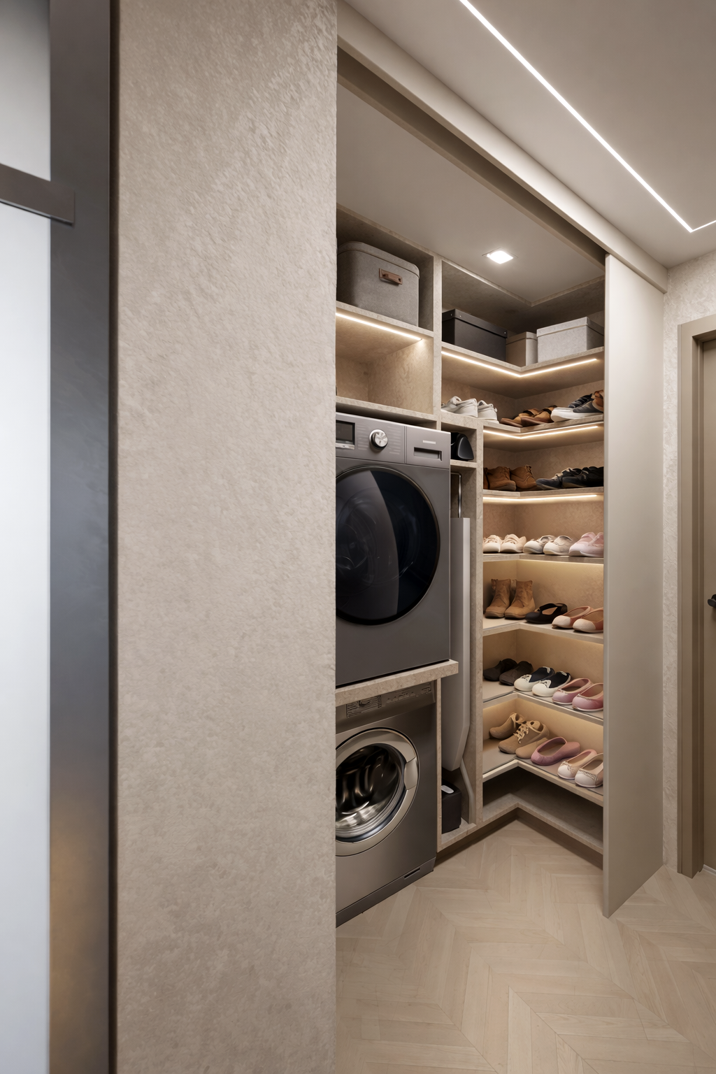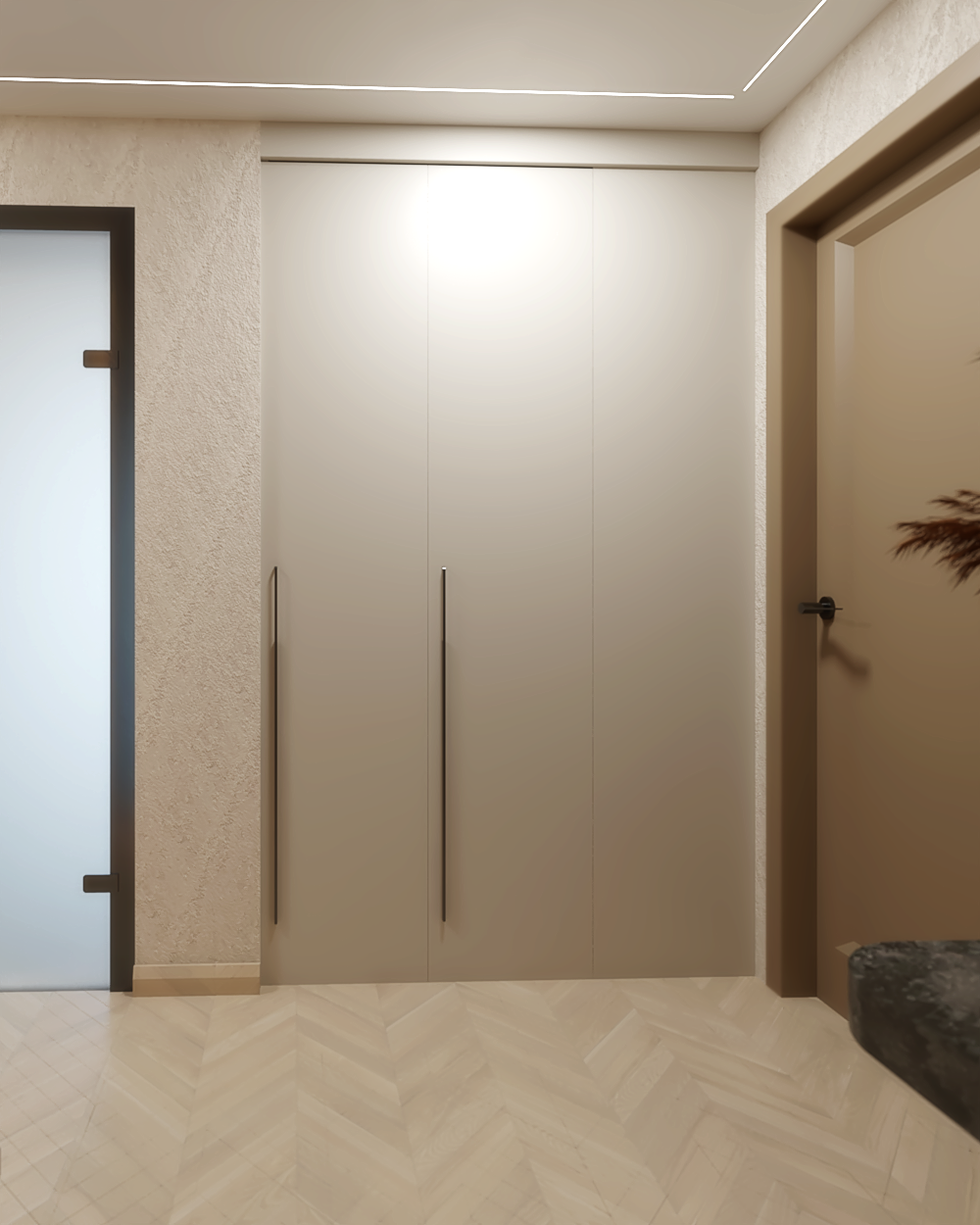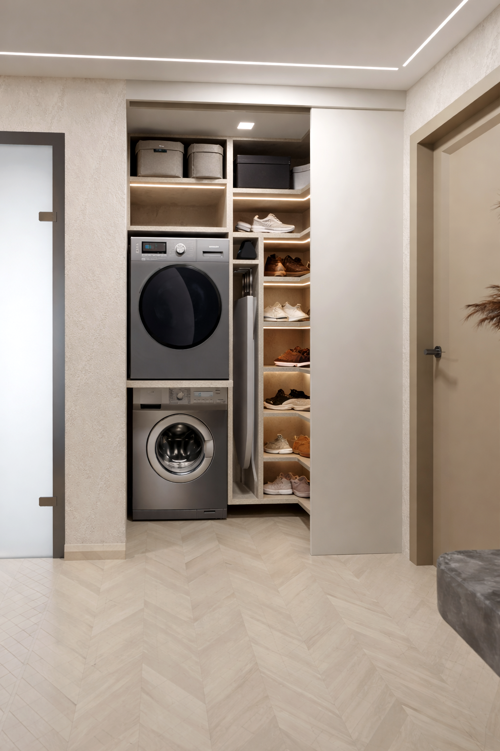 Елегантно решение за малко антре. Шкфовете са повдигнати на 25см от земята с цел почистване. Прахосмукачката-робот е скрита в единия шкаф, който е без дъно.
