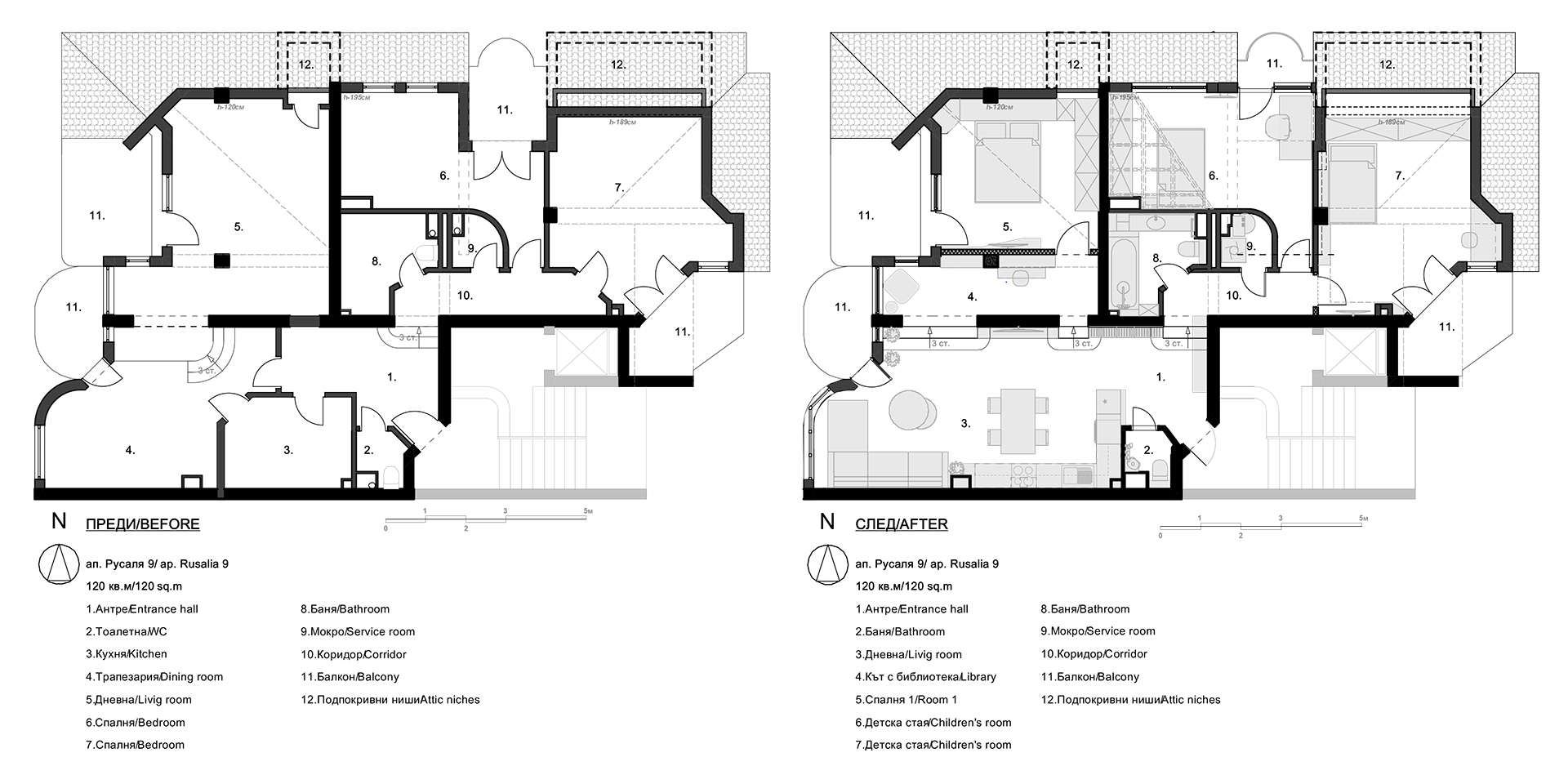 Трансформацията на мансардния апартамент на ул.Русаля в София беше архитектурно предизвикателство, заради нефункционално разпределение, множество чупки, скосявания и неизползваеми височини. Тези привидни пространствени недостатъци се превърнаха в основа на концепция и вдъхнаха неповторим характер и уют на жилището. Преосмислянето на зона „ден“ позволи обособяването на трета спалня и композиране на необичайна дневна. Превърнахме шайбата (TВ-зона) в ключов междинен елемент, който организира пространството и насочва движението между активната обща зона и по-интимния библиотечен кът на второ ниво. Вертикалната динамика е подчертана от единна композиция от стъпала, мебели и активен цвят, които създават усещане за дълбочина и сценография. Идеята за активния цвят е основна и в детските стаи, разгръщайки пространствени сценарии за сън, игра и учене чрез ясно зониране и скрити обеми за съхранение. В по-високата част на момчешката стая реализираме „мецанин“ от дървена конструкция – забавна зона за игра. В спалните наклоните на покрива са интегрирани в мебели по дизайн, превръщайки ограниченията в активен участник в дизайна и усвоявайки всяка начупена ниша в допълнителна складова площ. Едната баня реализираме в по-нежни тонове с естествено звучене – в хармония с родителската спалня, а малката баня за бърз душ е решена по-дръзко и изненадващо в съвременен стил. Заедно с наситените цветове в помещенията, се откроява и дървото, което хармонизира и затопля атмосферата. Задачата за ап.Русаля 9 със своите специфики и дефекти ни предостави възможност да създадем уникален интериорен проект, носещ в себе си както практичност и функционалност, така и изненадващ и запомнящ се характер.