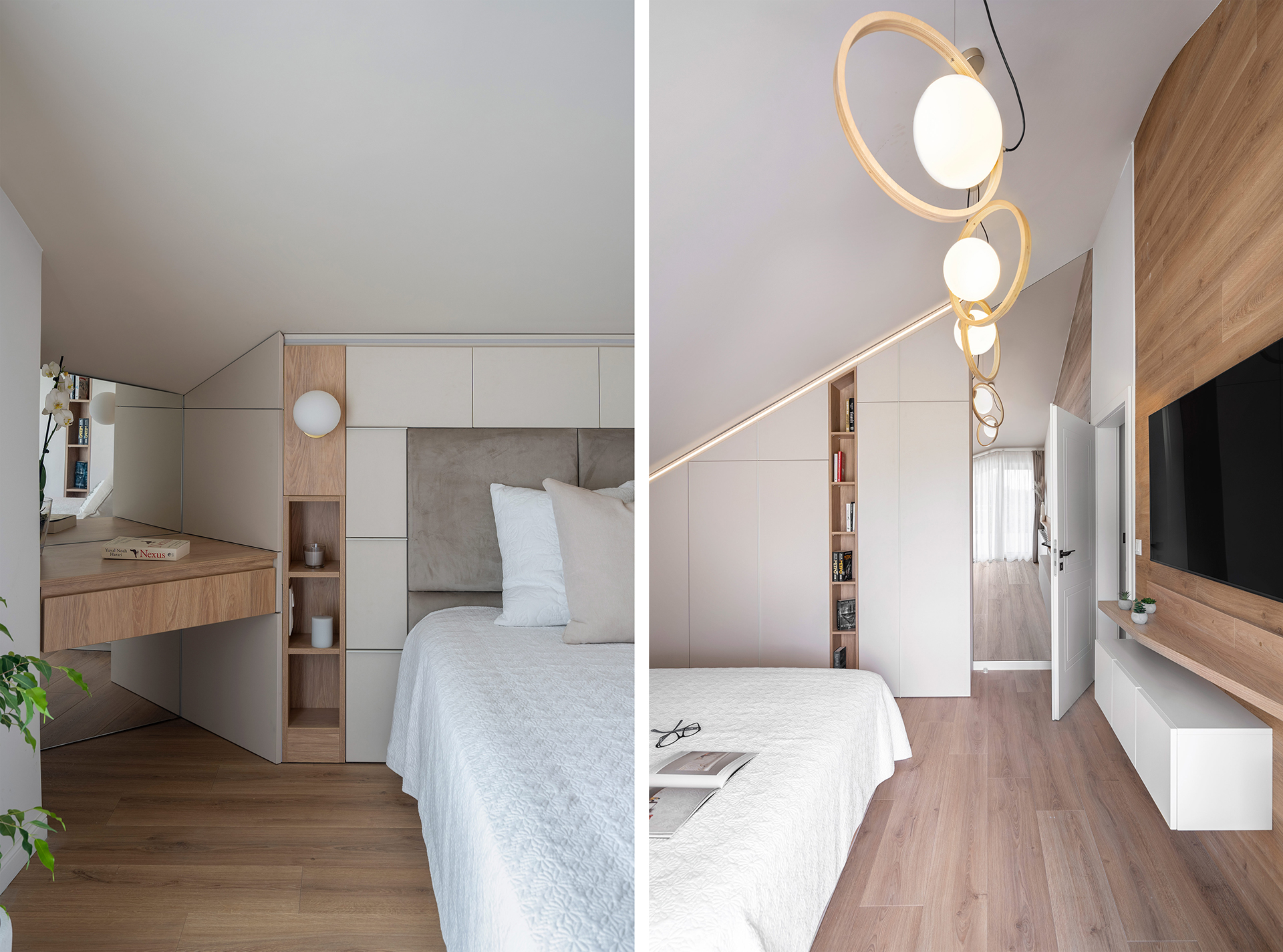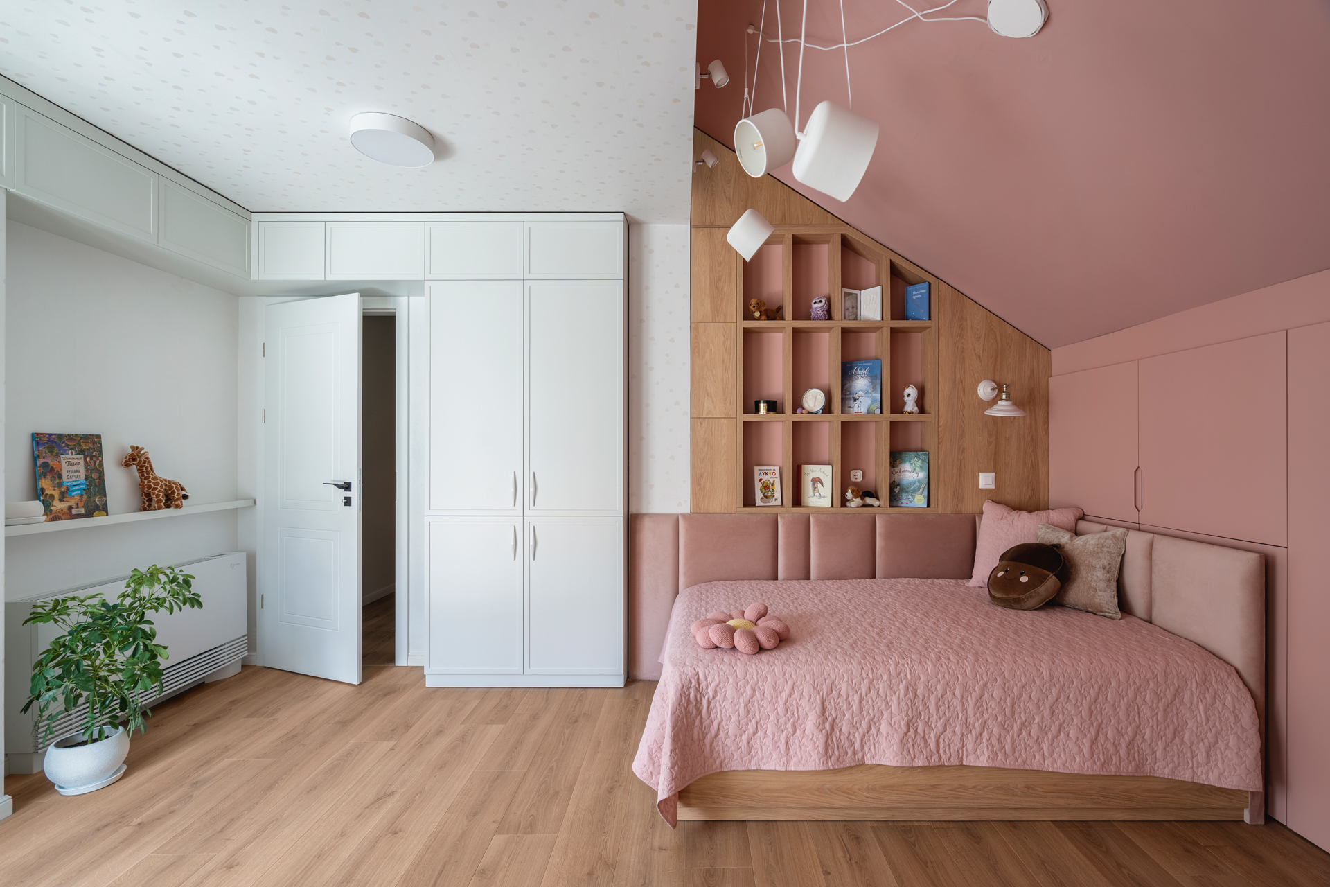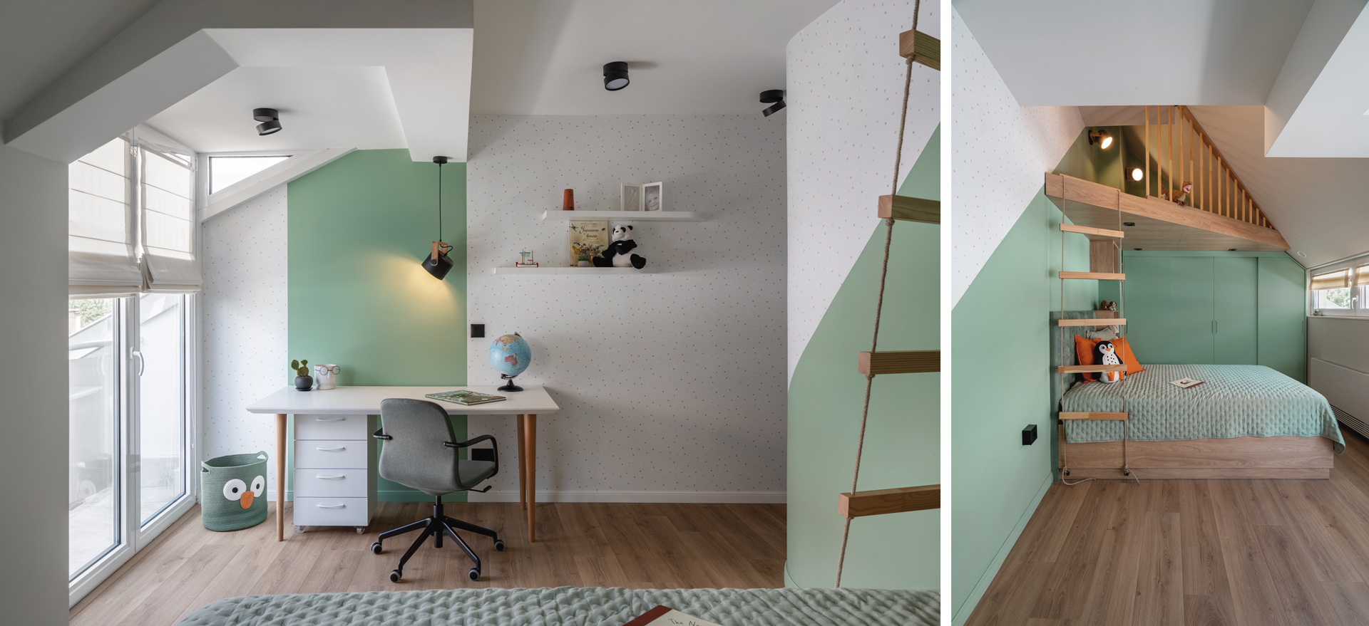 The transformation of the attic apartment on Rusalya Street in Sofia presented an architectural challenge due to its inefficient layout, numerous angles, sloping ceilings, and unusable heights. These apparent limitations became the foundation of the design concept, giving the home a distinctive character and sense of warmth. Reorganizing the daytime living zone allowed for the creation of a third bedroom and an unconventional living space. The TV unit was conceived as a key transitional element that structures the interior and guides movement between the active shared area and the more intimate library nook on the second level. Vertical dynamics are emphasized through a cohesive composition of steps, custom furniture, and a bold accent color, creating depth and a scenographic effect. The use of an active color is also central to the children’s rooms, shaping clear zones for sleeping, playing, and studying, supported by concealed storage. In the boy’s room, a wooden mezzanine structure introduces an elevated play area. In the bedrooms, the roof slopes are integrated into custom-designed furniture, turning constraints into active design features and maximizing storage in every niche. One bathroom is designed in soft, natural tones in harmony with the parents’ bedroom, while the smaller bathroom for quick showers is executed in a bolder contemporary style. Wood, combined with saturated colors, plays a key role in warming and balancing the interior. The specific challenges of Apartment Rusalya 9 enabled the creation of a unique interior that combines functionality with a memorable and expressive character.