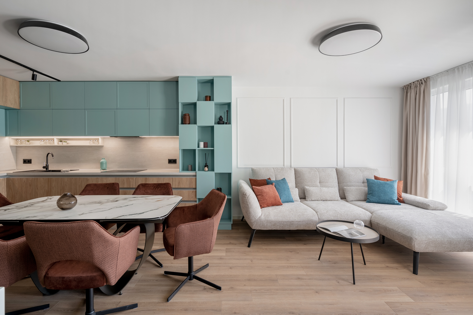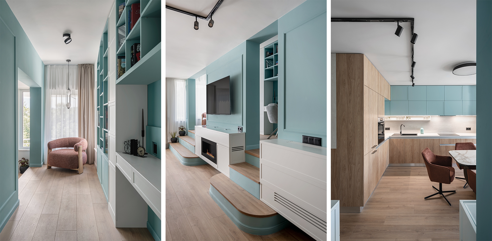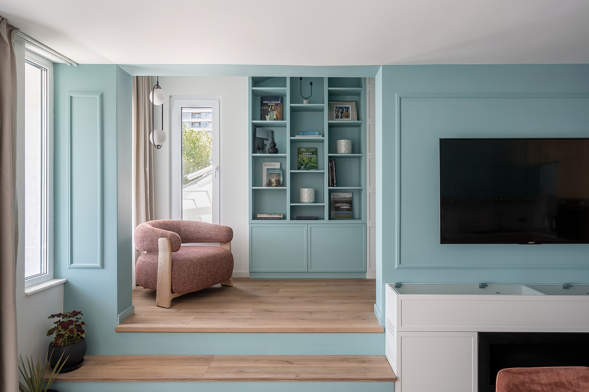 The transformation of the attic apartment on Rusalya Street in Sofia presented an architectural challenge due to its inefficient layout, numerous angles, sloping ceilings, and unusable heights. These apparent limitations became the foundation of the design concept, giving the home a distinctive character and sense of warmth. Reorganizing the daytime living zone allowed for the creation of a third bedroom and an unconventional living space. The TV unit was conceived as a key transitional element that structures the interior and guides movement between the active shared area and the more intimate library nook on the second level. Vertical dynamics are emphasized through a cohesive composition of steps, custom furniture, and a bold accent color, creating depth and a scenographic effect. The use of an active color is also central to the children’s rooms, shaping clear zones for sleeping, playing, and studying, supported by concealed storage. In the boy’s room, a wooden mezzanine structure introduces an elevated play area. In the bedrooms, the roof slopes are integrated into custom-designed furniture, turning constraints into active design features and maximizing storage in every niche. One bathroom is designed in soft, natural tones in harmony with the parents’ bedroom, while the smaller bathroom for quick showers is executed in a bolder contemporary style. Wood, combined with saturated colors, plays a key role in warming and balancing the interior. The specific challenges of Apartment Rusalya 9 enabled the creation of a unique interior that combines functionality with a memorable and expressive character.