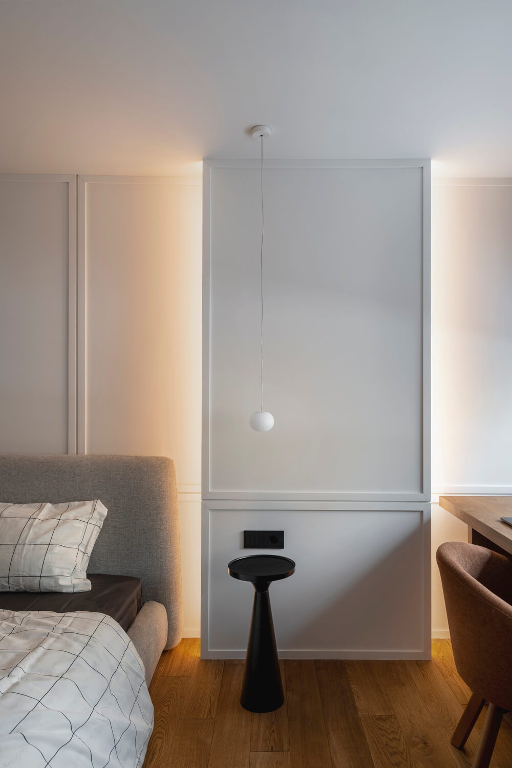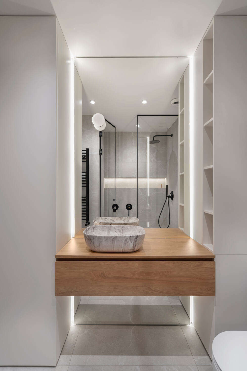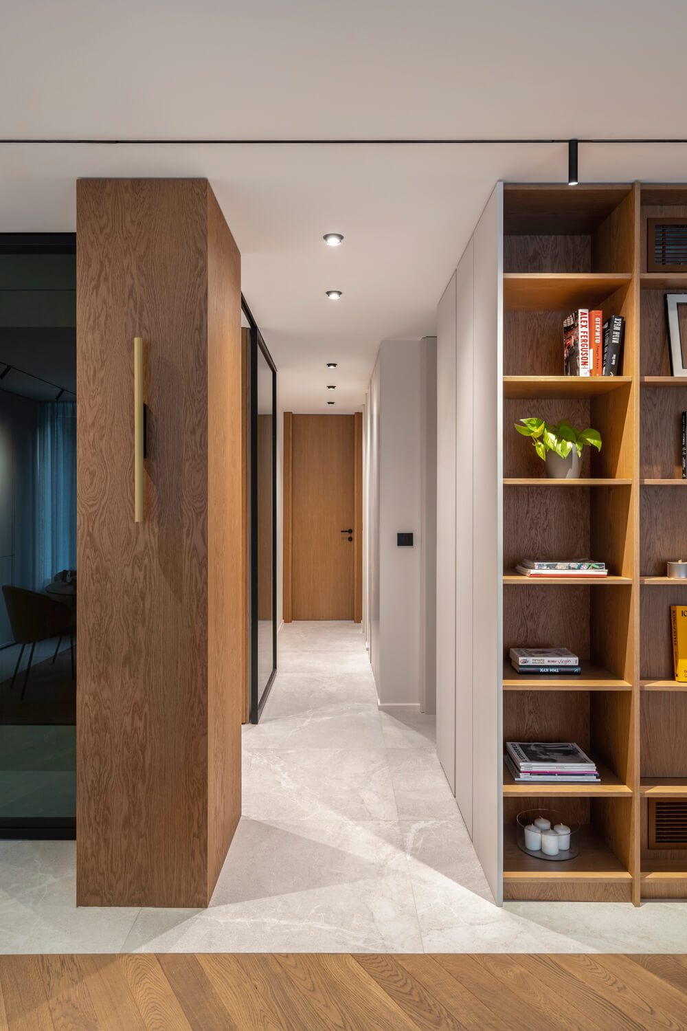The corridor is finished entirely in white, with discreetly integrated laundry and storage spaces, transforming the narrow passage into a bright and functional area. The bedrooms are minimalist and serene, with floor-to-ceiling wood veneer doors serving as a visual accent and integrated work areas. The bathrooms follow the same design language, featuring light surfaces, large mirrors, and carefully designed indirect lighting that enhances the overall atmosphere.