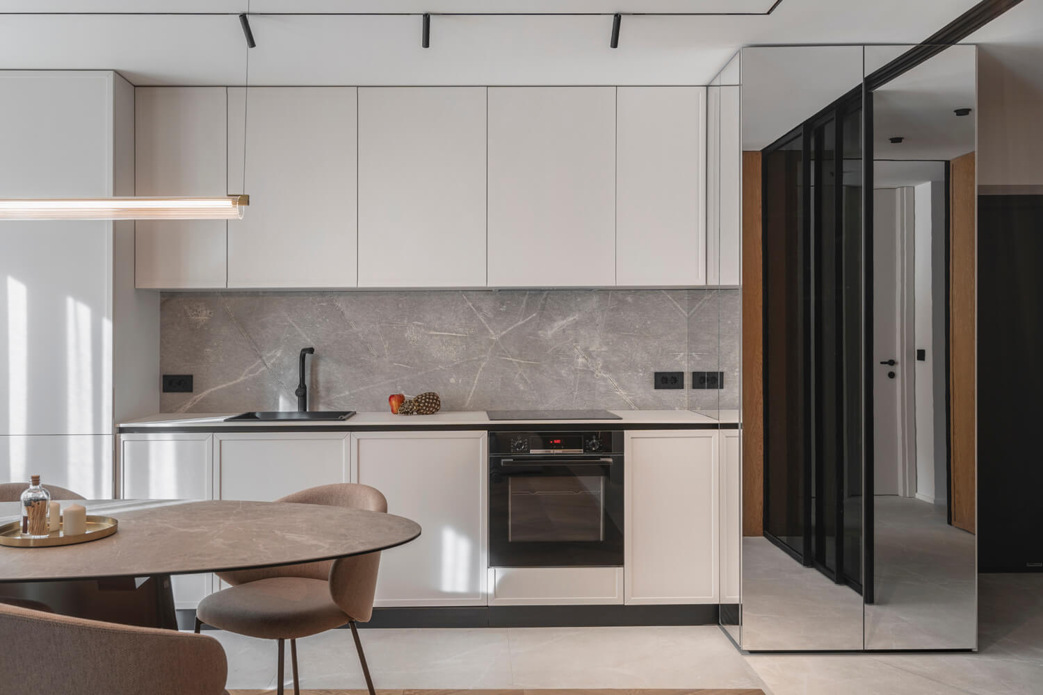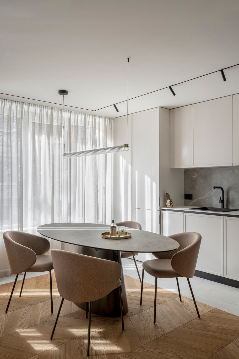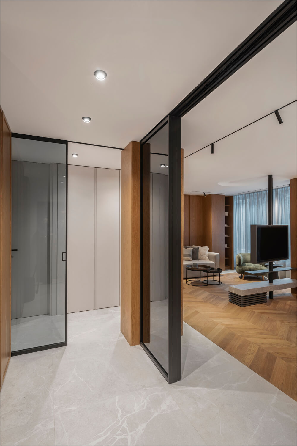 The corridor is finished entirely in white, with discreetly integrated laundry and storage spaces, transforming the narrow passage into a bright and functional area. The bedrooms are minimalist and serene, with floor-to-ceiling wood veneer doors serving as a visual accent and integrated work areas. The bathrooms follow the same design language, featuring light surfaces, large mirrors, and carefully designed indirect lighting that enhances the overall atmosphere.