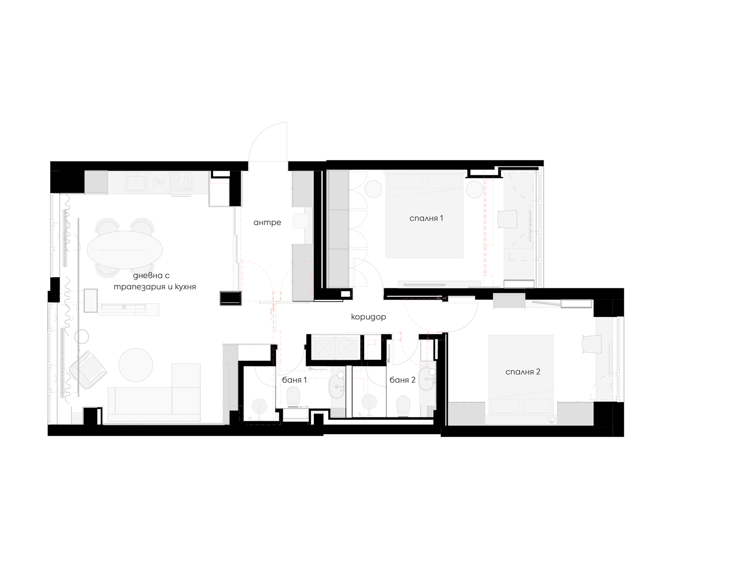 The apartment is located in the Oborishte district of Sofia and represents a complete transformation of an old, dark one-bedroom dwelling into a bright, functional home with two bedrooms and two bathrooms, positioned in the high-end market segment. The apartment has a total area of 100 sq m. The main design concept focuses on maximizing spatial efficiency and natural light through a clear layout and a carefully selected material palette.