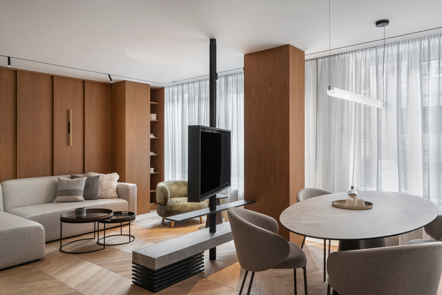 Оригинален акцент е телевизорът, скулптурно интегриран между хола и трапезарията чрез въртяща се стойка, позволяваща гъвкаво използване. Колоните и комините в жилището са превърнати в активни интериорни елементи, интегрирани в мебели, ламперии или подчертани с дърво и огледала. Отраженията на светлина и образи визуално разширяват иначе компактната дневна зона.