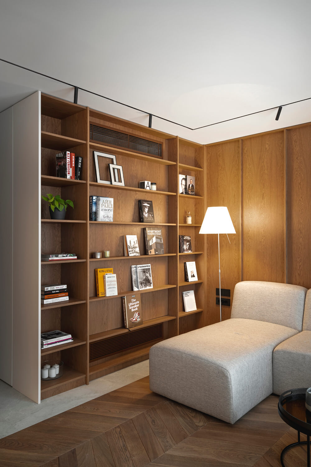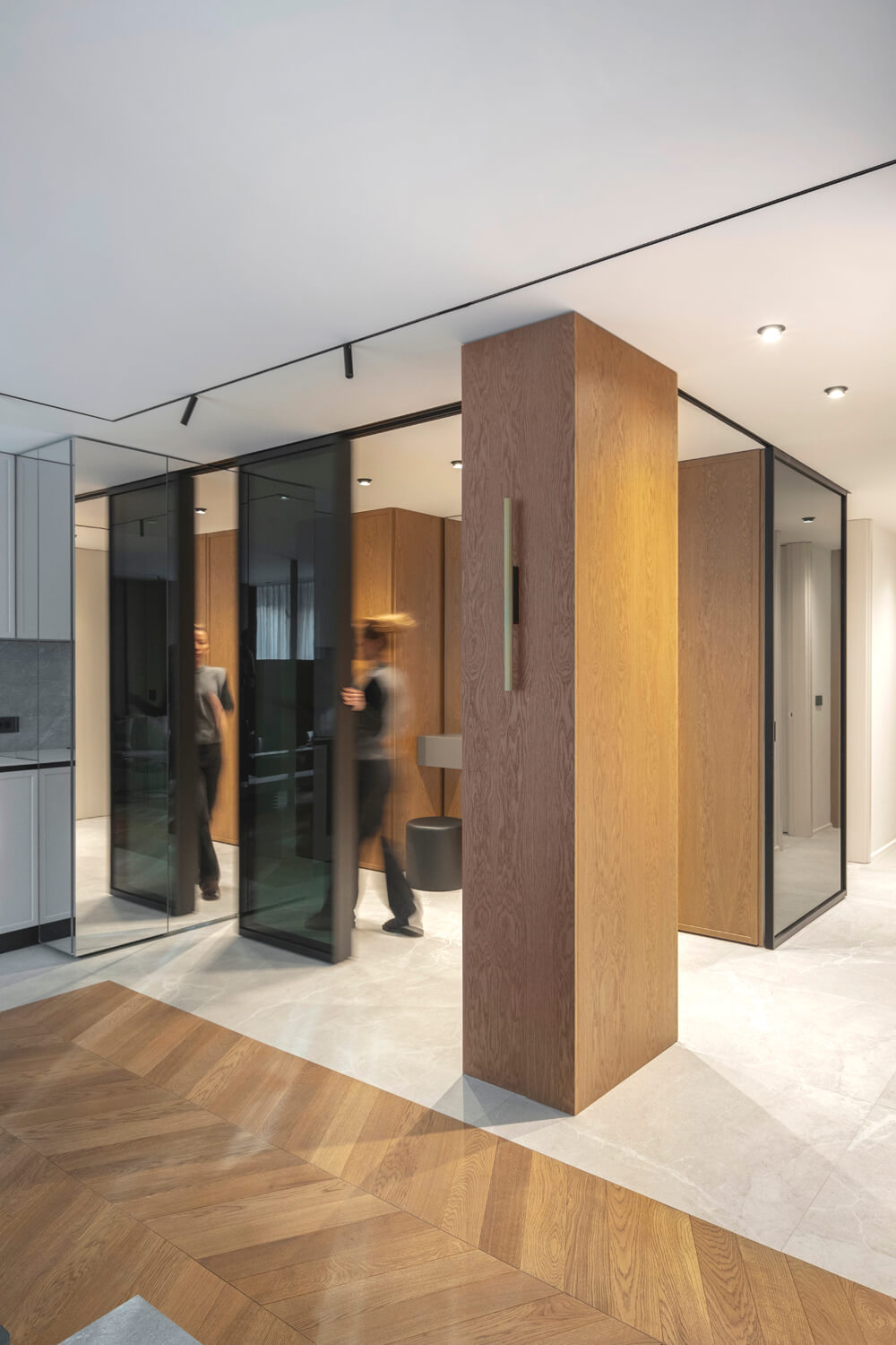 The entrance hall introduces the character of the interior through warm wood veneer finishes. Sliding glass partitions allow daylight to penetrate deep into the space, visually connecting the entrance with the open-plan living area. The living room, dining area, and kitchen are designed in a minimalist style, featuring smoked oak veneer in wall paneling, built-in furniture, and herringbone parquet flooring. Upholstered furniture in earthy tones, combined with wall-mounted and freestanding lighting, creates a calm and welcoming atmosphere.