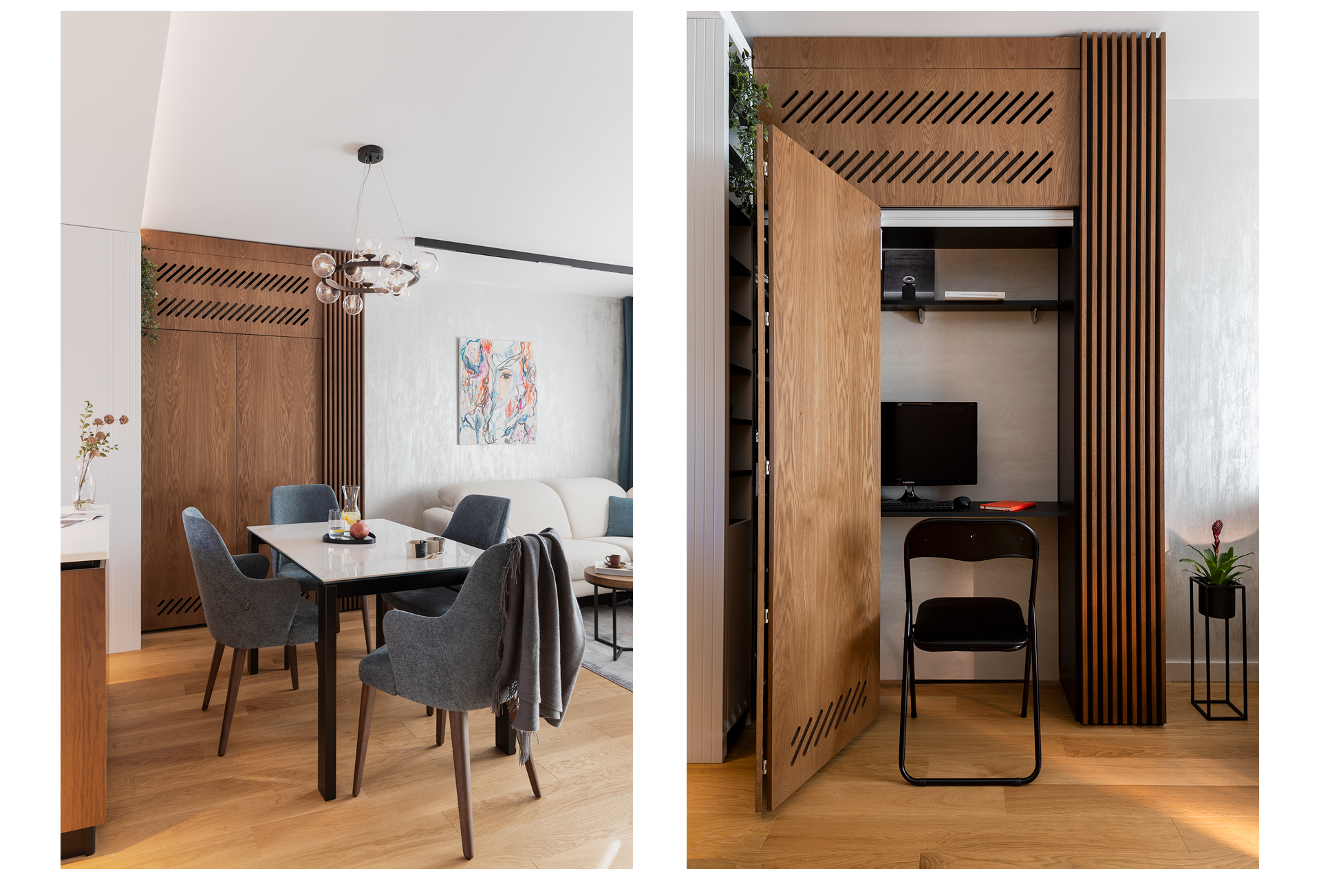 The entrance hall offers elegance and a sense of spaciousness through mirrored elements, with the washing machine and dryer hidden in the built-in wardrobe. The living room features a comfortable wide sofa in light aqua clean fabric with a sleep function. The chimney and gas boiler are concealed within the kitchen cabinetry, which transitions into shelving and a storage unit hiding a workspace and the air conditioner.