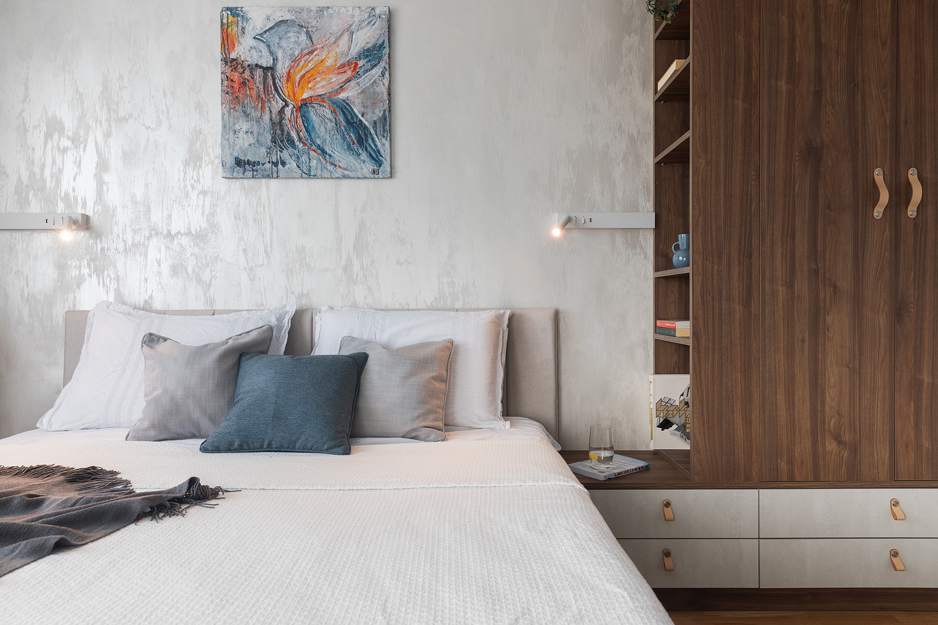 В спалнята има тапицирано легло, достатъчно мебели за съхранение и един плот, който може променя функцията си във времето (чекмеджетата под него са на колелца) - да бъде тоалетка, работно място, а след време на негово място да се появи бебешка кошара. В банята сгъваемите паравани пестят място, голямото огледало разширява визуално пространството, а черните смесители добавят стил.
