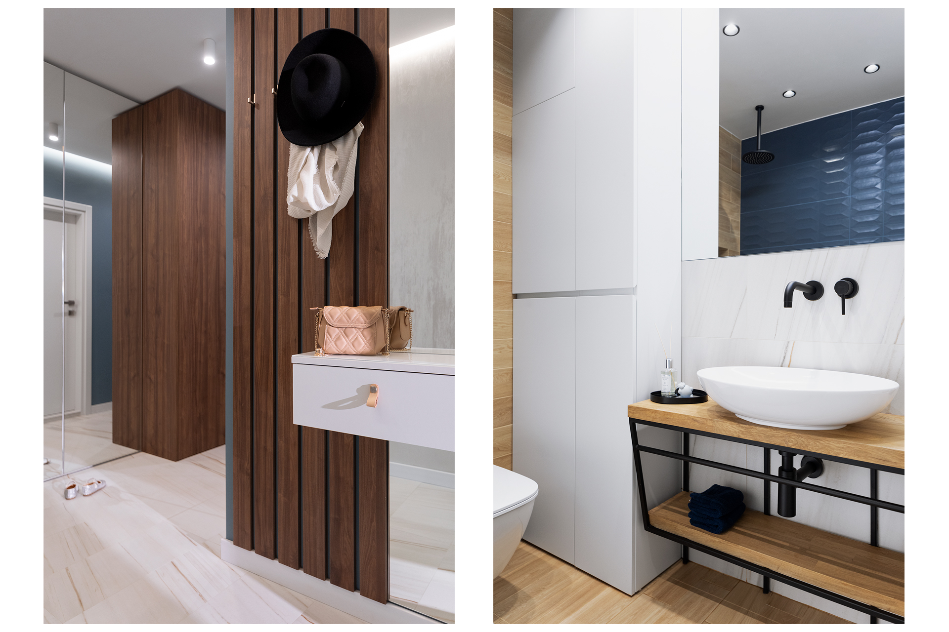 Wood is present throughout the interior – three-layer parquet, veneered MDF, wood-decor chipboard, solid wood surfaces, and wood-effect porcelain tiles. Plaster with silver threads and washable blue paint enhance the atmosphere. Stone appears in the sintered kitchen countertops, the heat-resistant Calacatta dining tabletop, and the Lasa porcelain tiles. Mirrored surfaces, glass cabinets, black metal details, and leather handles add character. Lighting is planned to illuminate each area evenly, while abstract paintings and delicate sculptures serve as artistic accents.