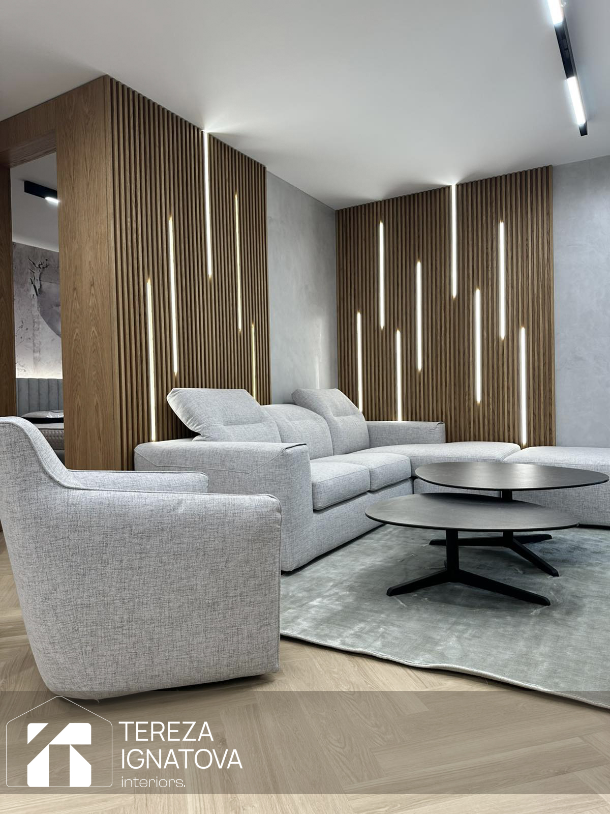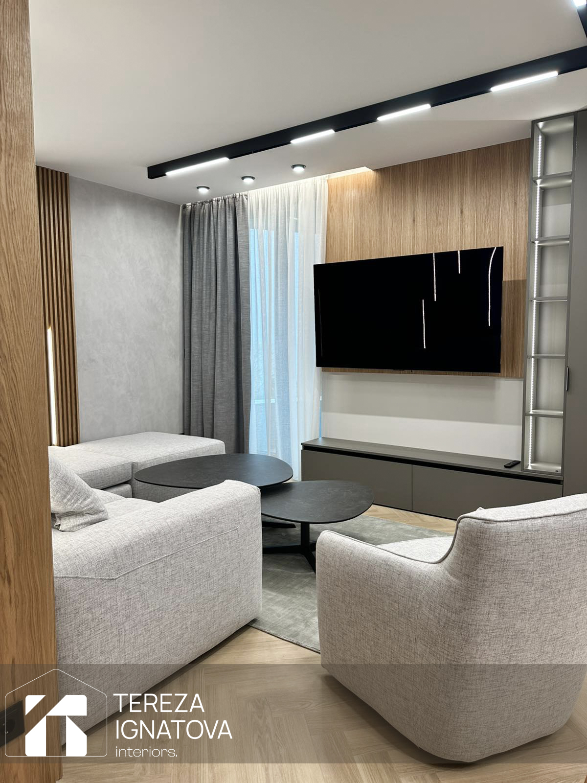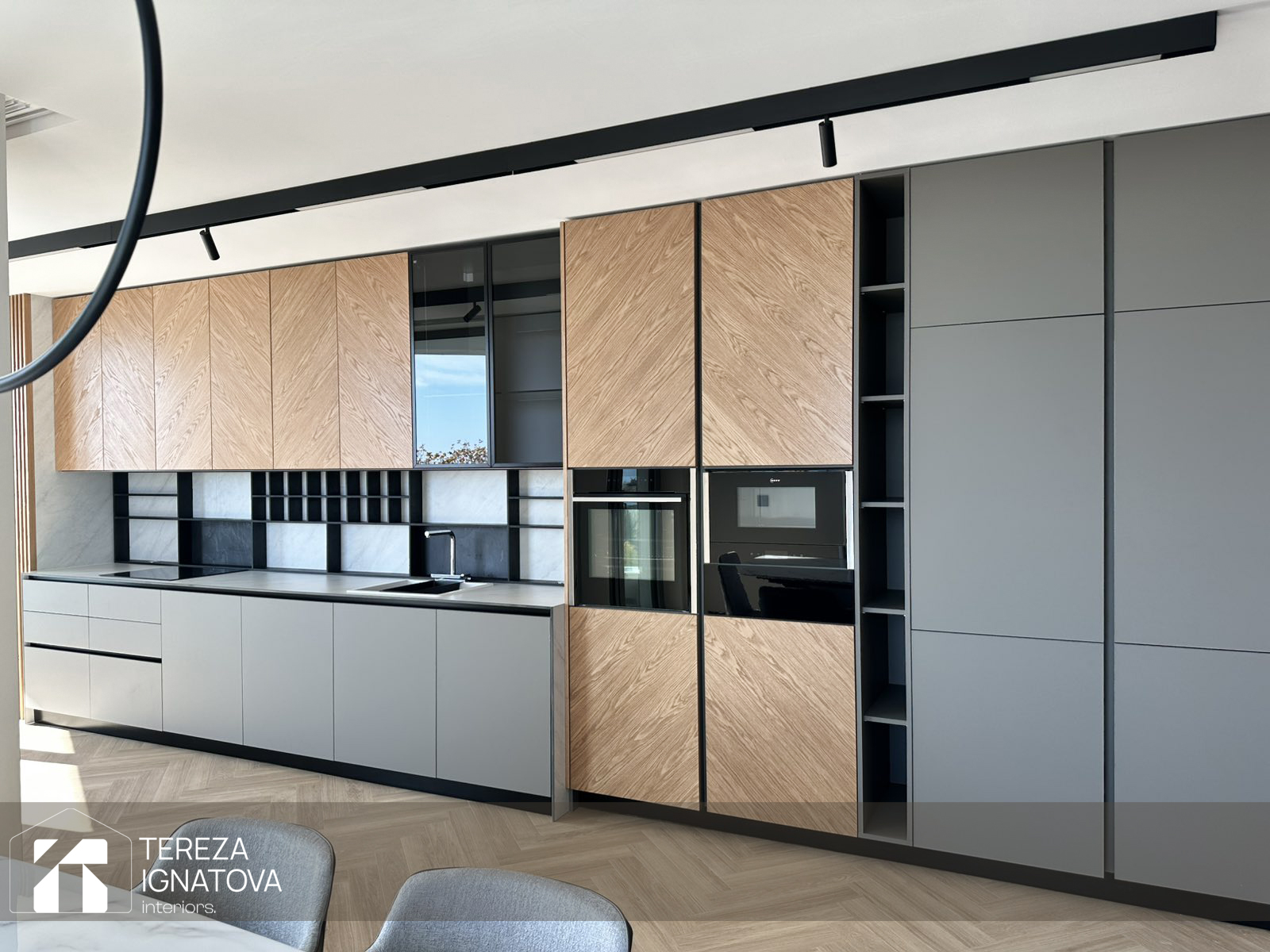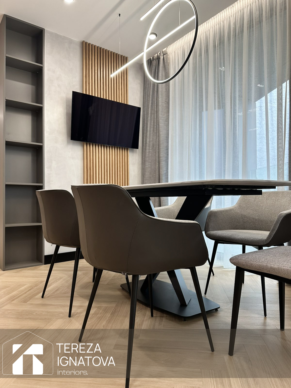 Залагайки на топъл естествен фурнир, в съчетание с разнообразие от сиви нюанси в интериора, черни метални акценти и строго съвременен, изчистен дизайн, днес този исторически за студиото проект, е вече реалност.