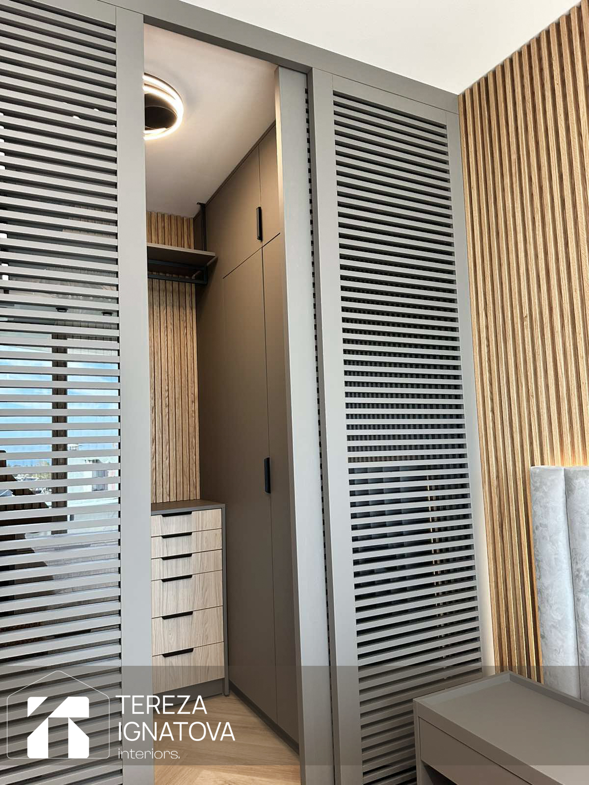 Оригиналното разпределение на апартамента беше в категория "тристаен", но клиентите решиха да се лишат от втората спалня, която за тях бе ненужна, за сметка на гардеробна и по-просторна дневна.