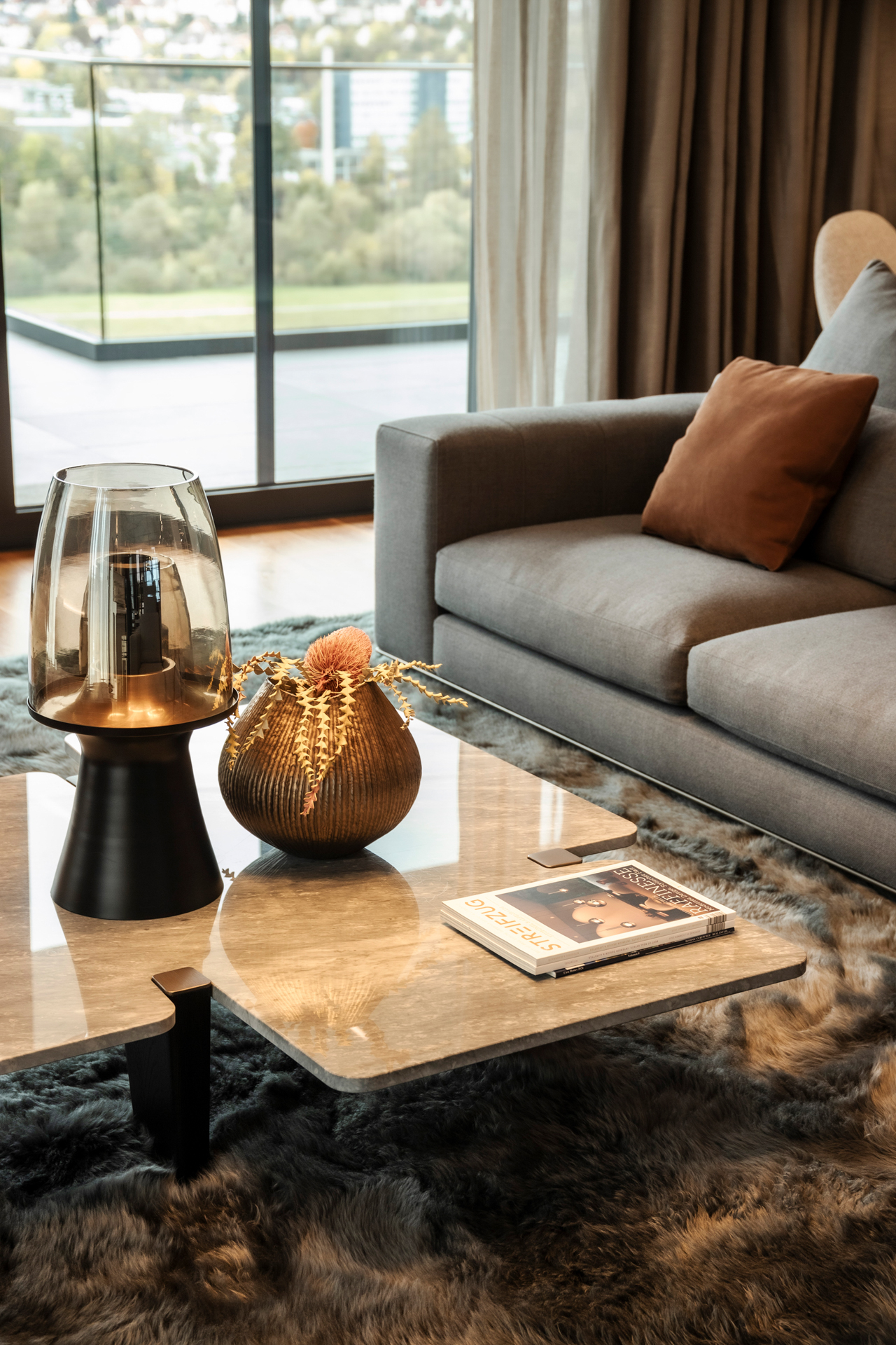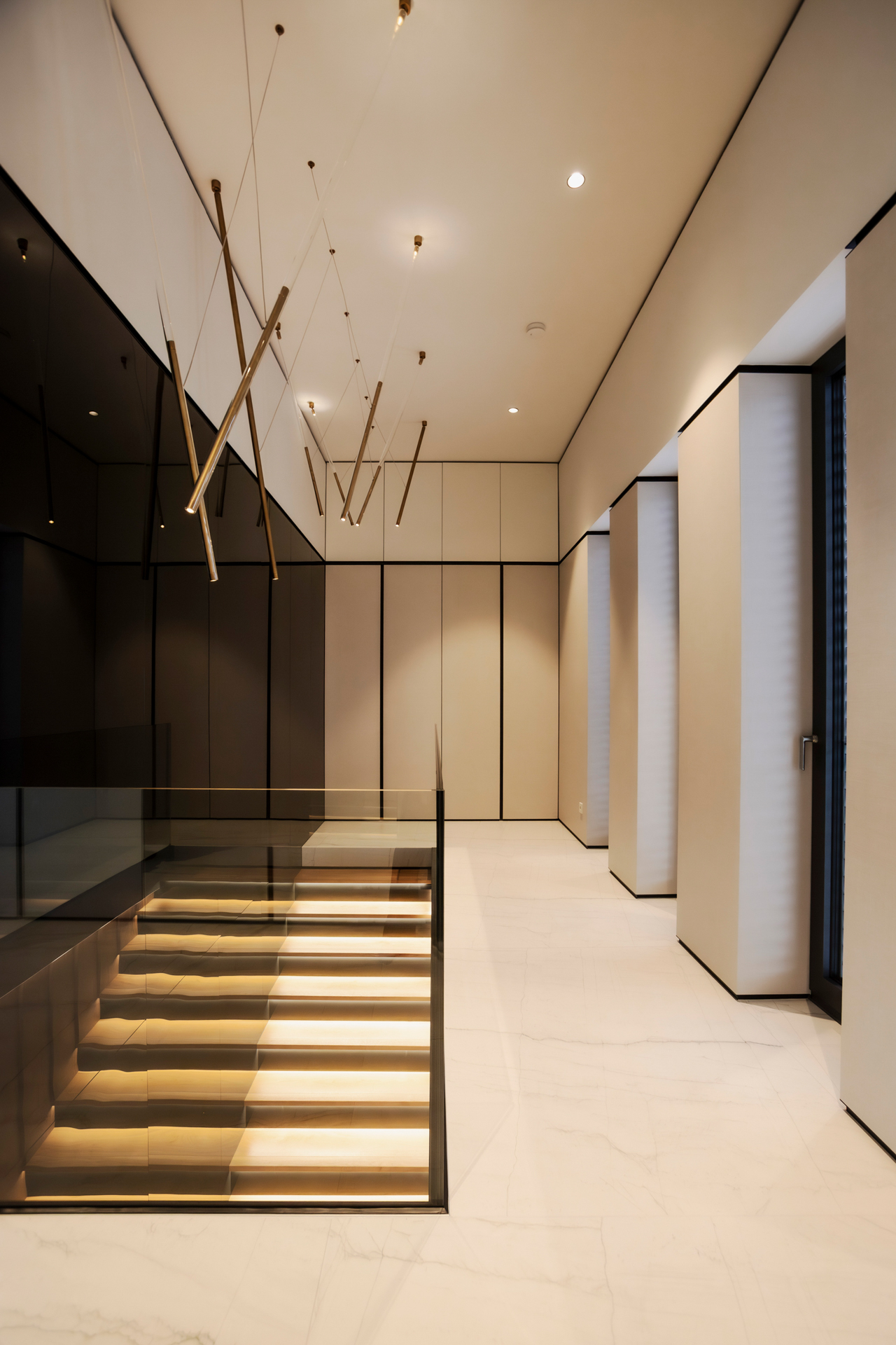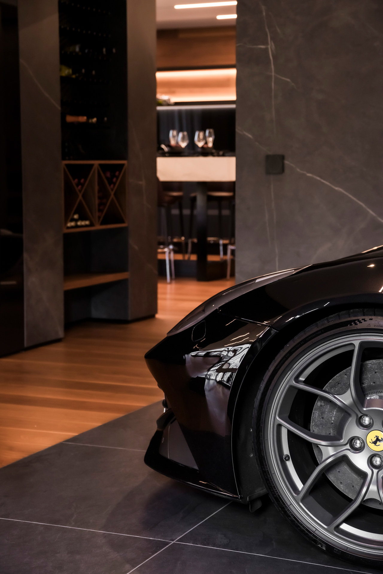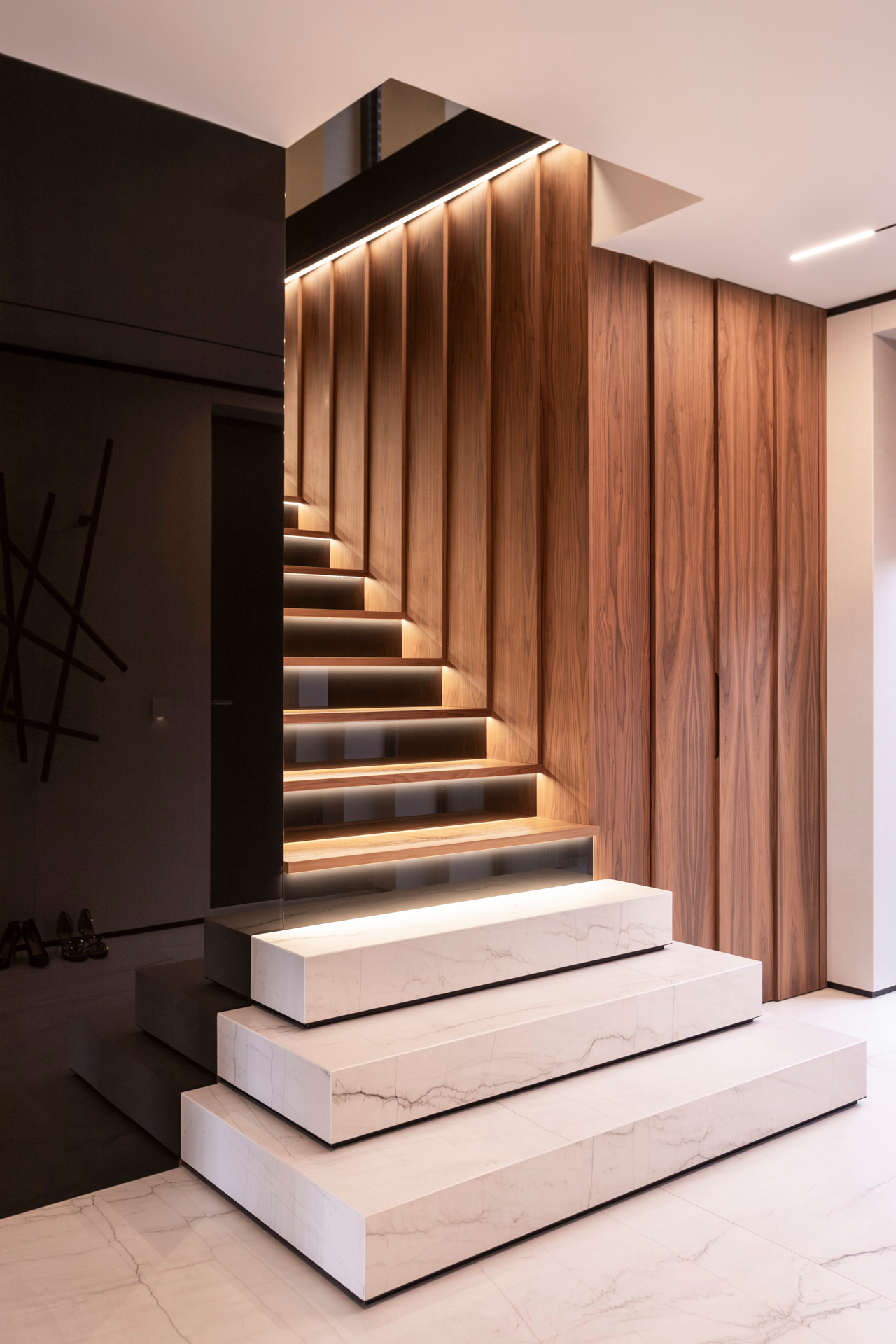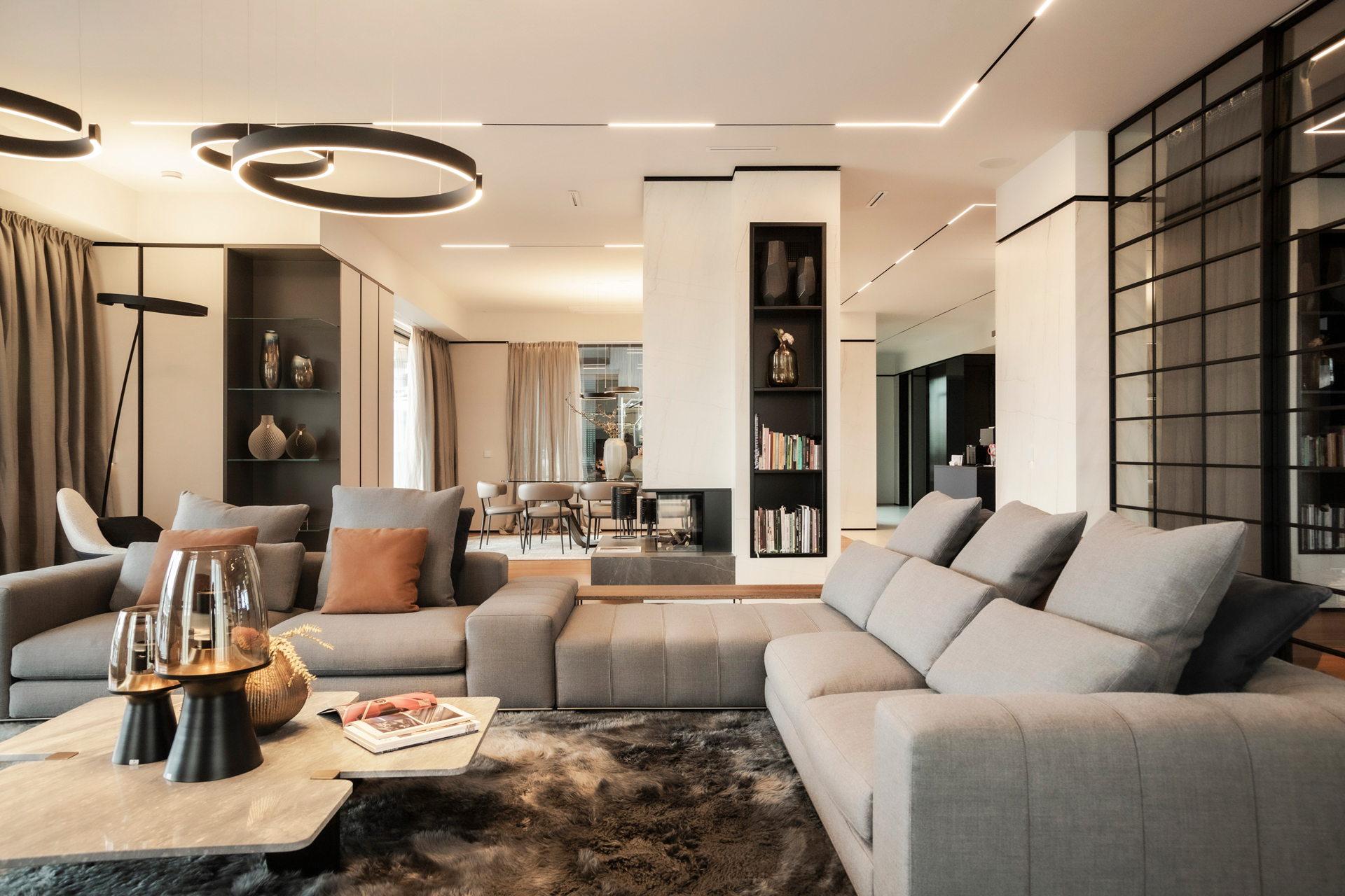 JD Apartment occupies the top two floors and merges three layouts into a single home with a private entrance. The social level includes a gaming area, TV lounge and bar-kitchen. The garage is visually connected , making the cars part of the interior identity. The upper level brings together the kitchen, dining and living areas around a central fireplace. The office is enclosed with sliding glass doors, while the night zone includes three bedrooms. The master suite features a walk-in closet, a partially open bathroom and direct access to the fitness room, which opens to the view in warmer months. The terrace offers a summer kitchen, fire feature and jacuzzi. Materials include natural wood, light stone, marble, black or brushed metal and extensive glazing. The project delivers clear spatial logic, functional precision and solutions designed for long-term value.