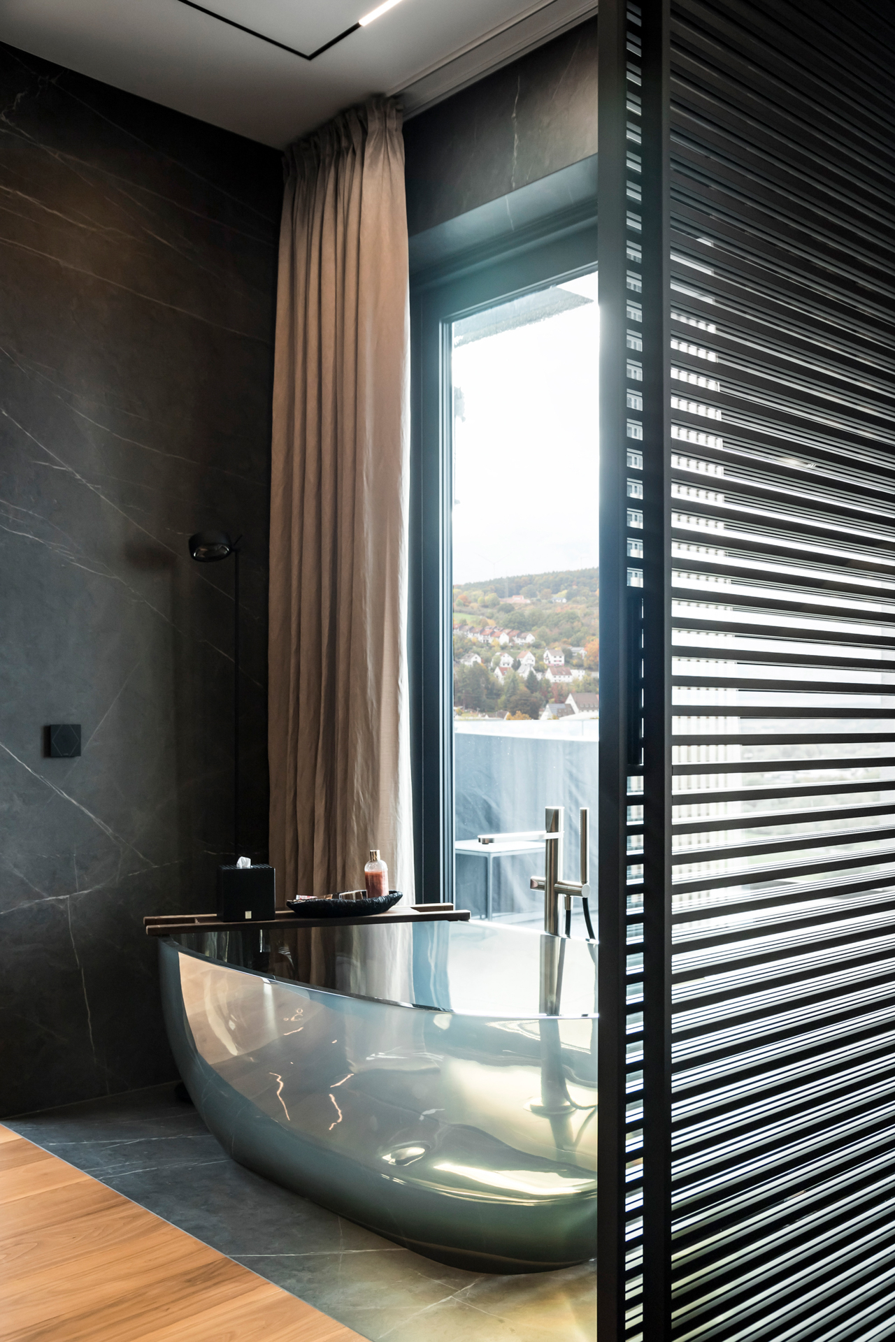 Апартамент JD заема последните два етажа и обединява три отделни планови решения в едно жилище със самостоятелен вход. Нивото за социална активност включва игрална зона, телевизионен кът и бар-кухня. Гаражът е интегриран към интериора, което превръща автомобилите в част от атмосферата. Горният етаж обединява кухня, трапезария и дневна около камина. Офисът се отделя с плъзгащи стъклени врати, а нощната зона разполага с три спални. Основната спалня има дрешник, частично отворена баня и директна връзка с фитнес, който през топлите месеци се отваря към гледката. Терасата предлага лятна кухня, огнище и джакузи. Материалите включват естествено дърво, светъл камък, мрамор, черен или бруширан метал и големи стъклени повърхности. Проектът залага на ясна логика, плавен преход между функции и решения, ориентирани към дългосрочно ползване.