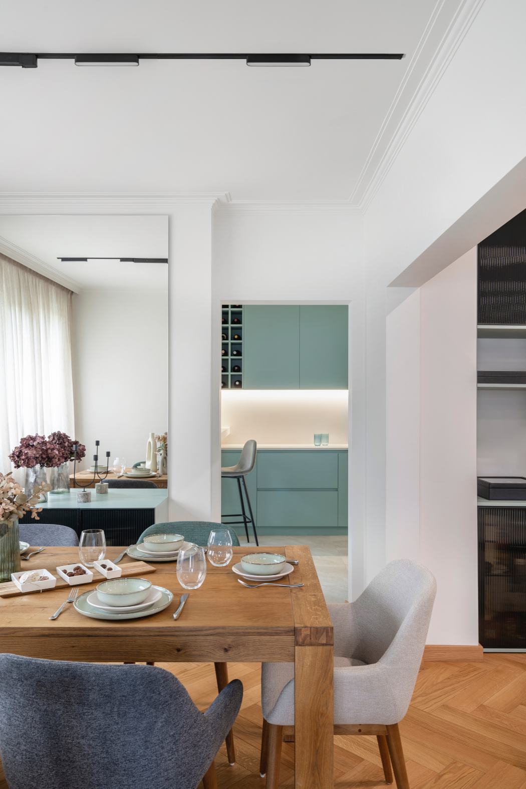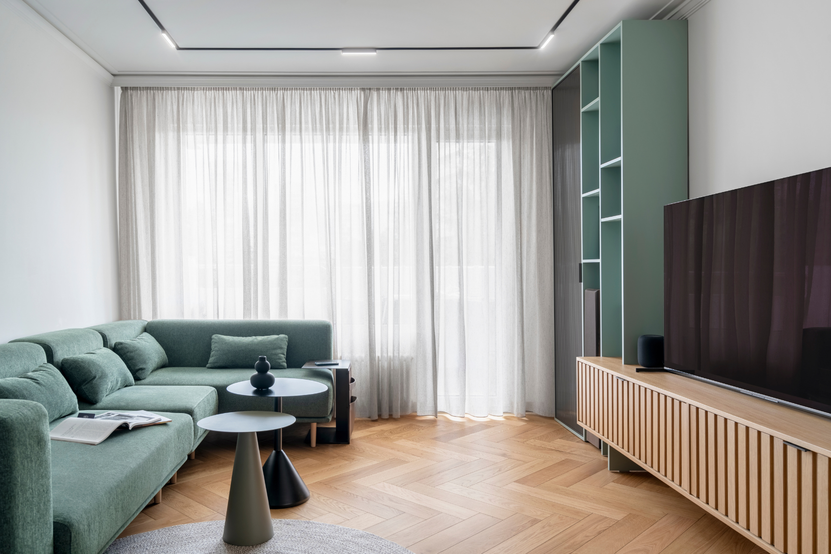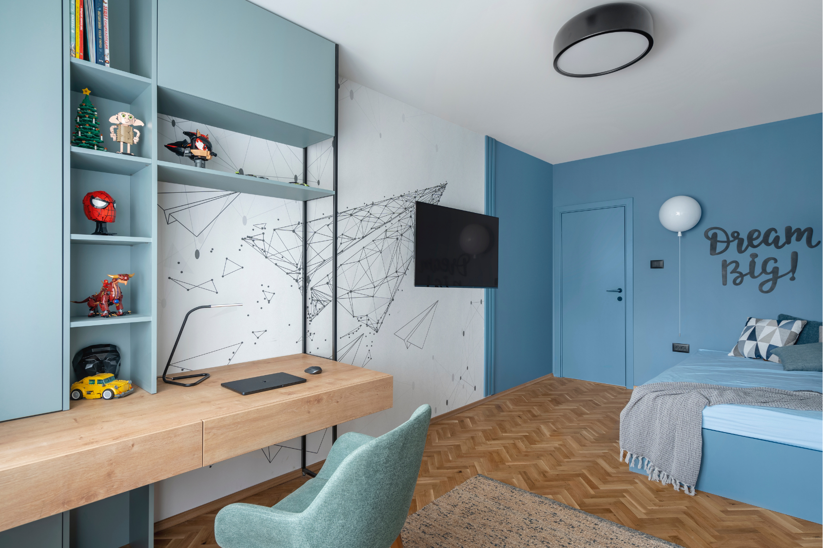 Дневната впечатлява с едромащабен естествен паркет тип „риба кост“, който напомня за реставрирания дървен под в останалите стаи и внася нотка на класическа елегантност. Детските стаи са оформени с внимание към всеки детайл, съчетавайки естетика и практичност – основен принцип в нашия подход към интериорния дизайн.