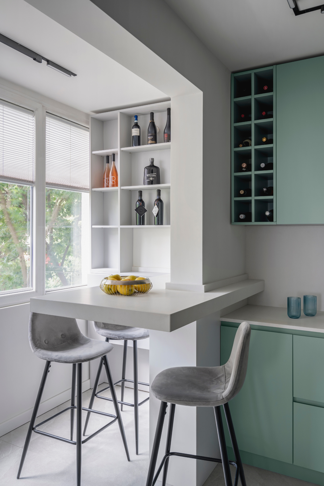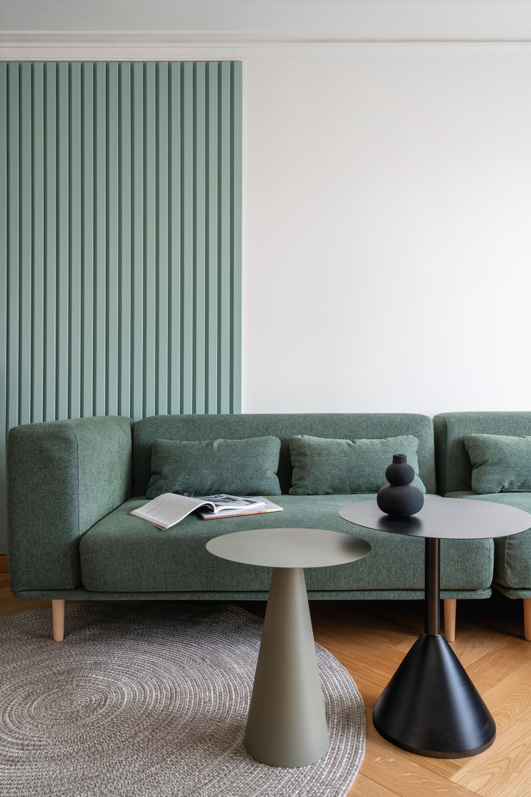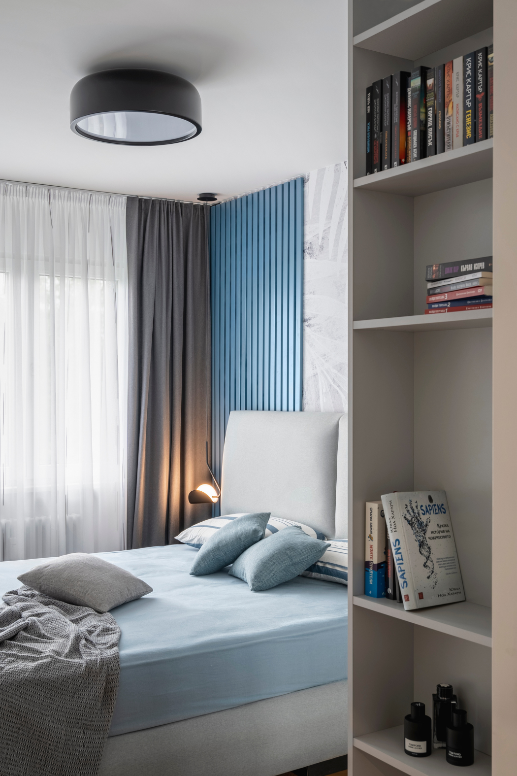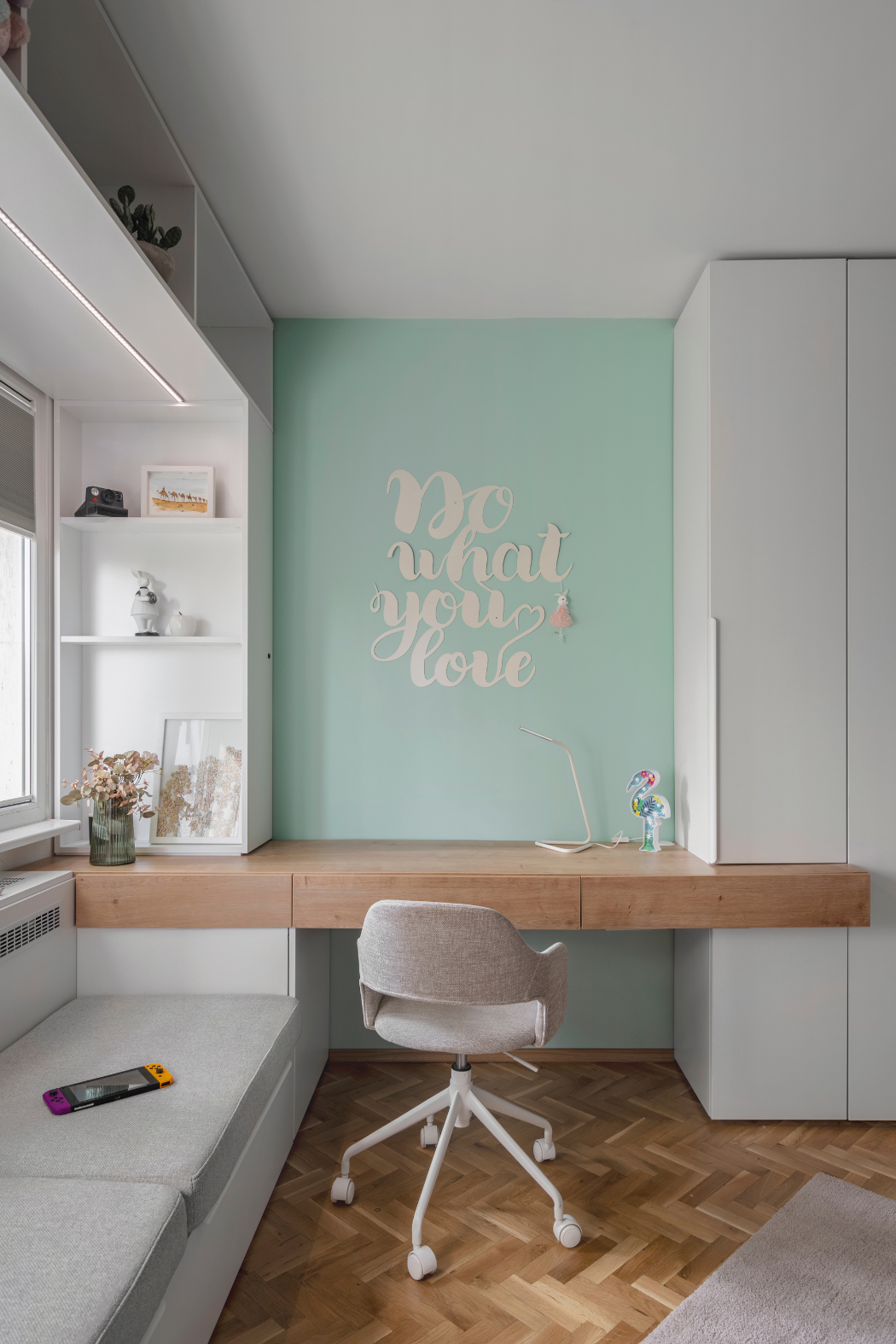 Дневната впечатлява с едромащабен естествен паркет тип „риба кост“, който напомня за реставрирания дървен под в останалите стаи и внася нотка на класическа елегантност. Детските стаи са оформени с внимание към всеки детайл, съчетавайки естетика и практичност – основен принцип в нашия подход към интериорния дизайн.