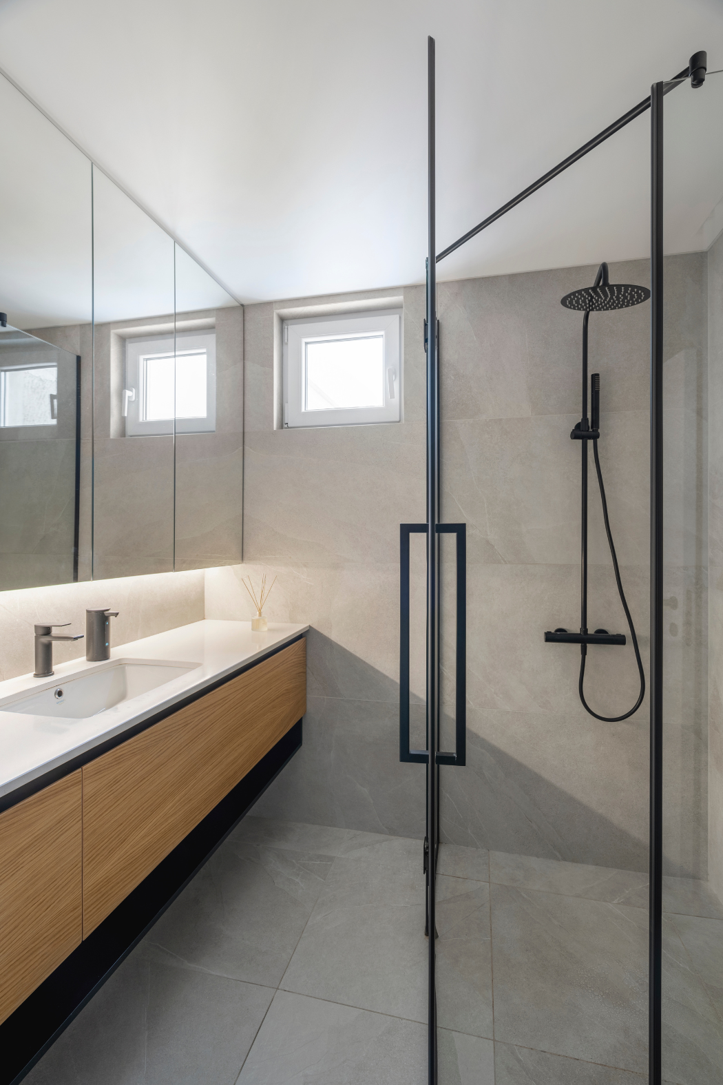 В баните опънатите тавани и комбинацията от дървесен и сив декор създават усещане за стил и комфорт. Резултатът е един различен, пълен с живот и характер дом, в който всеки елемент говори за вкус, баланс и индивидуалност.