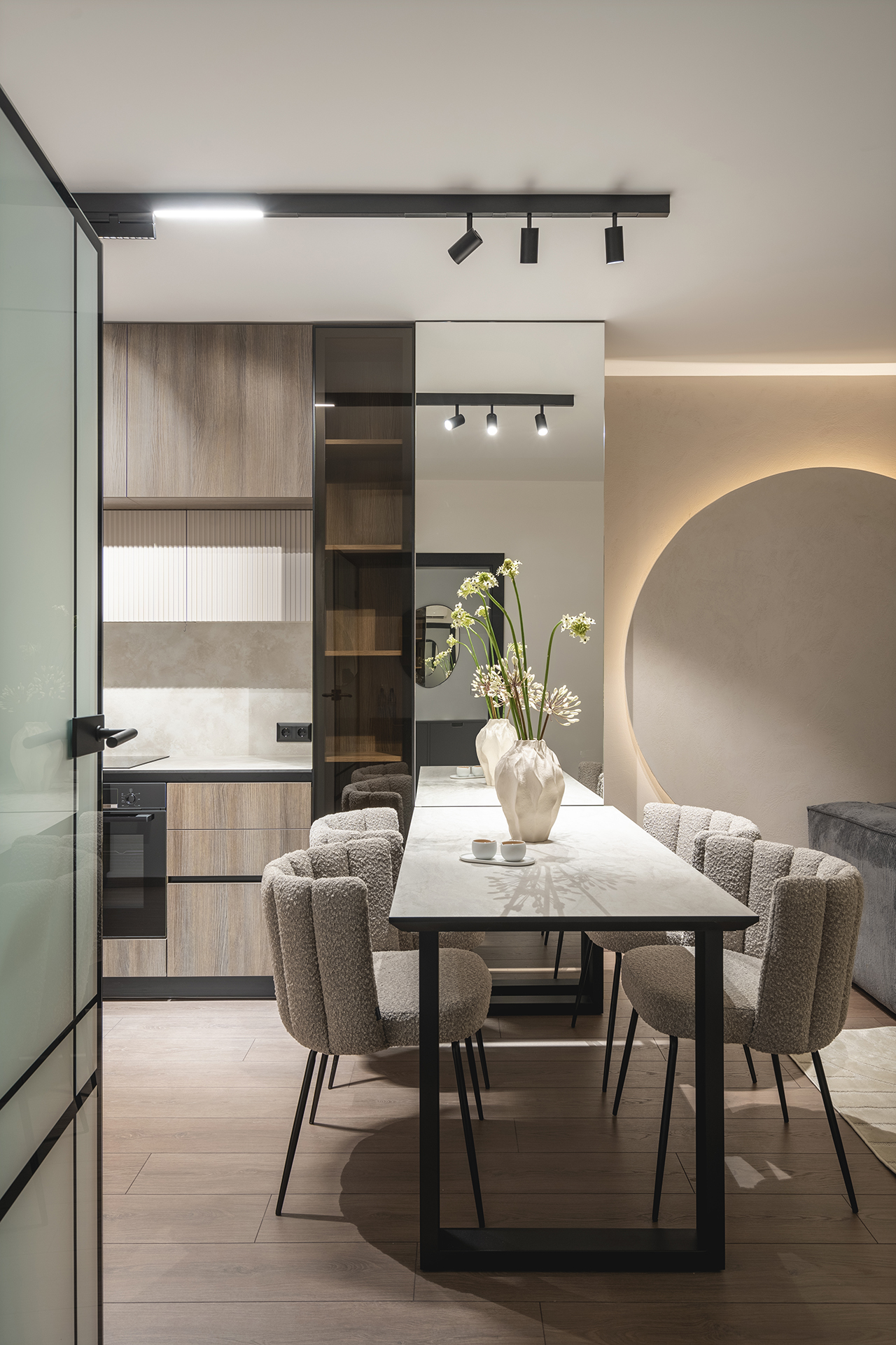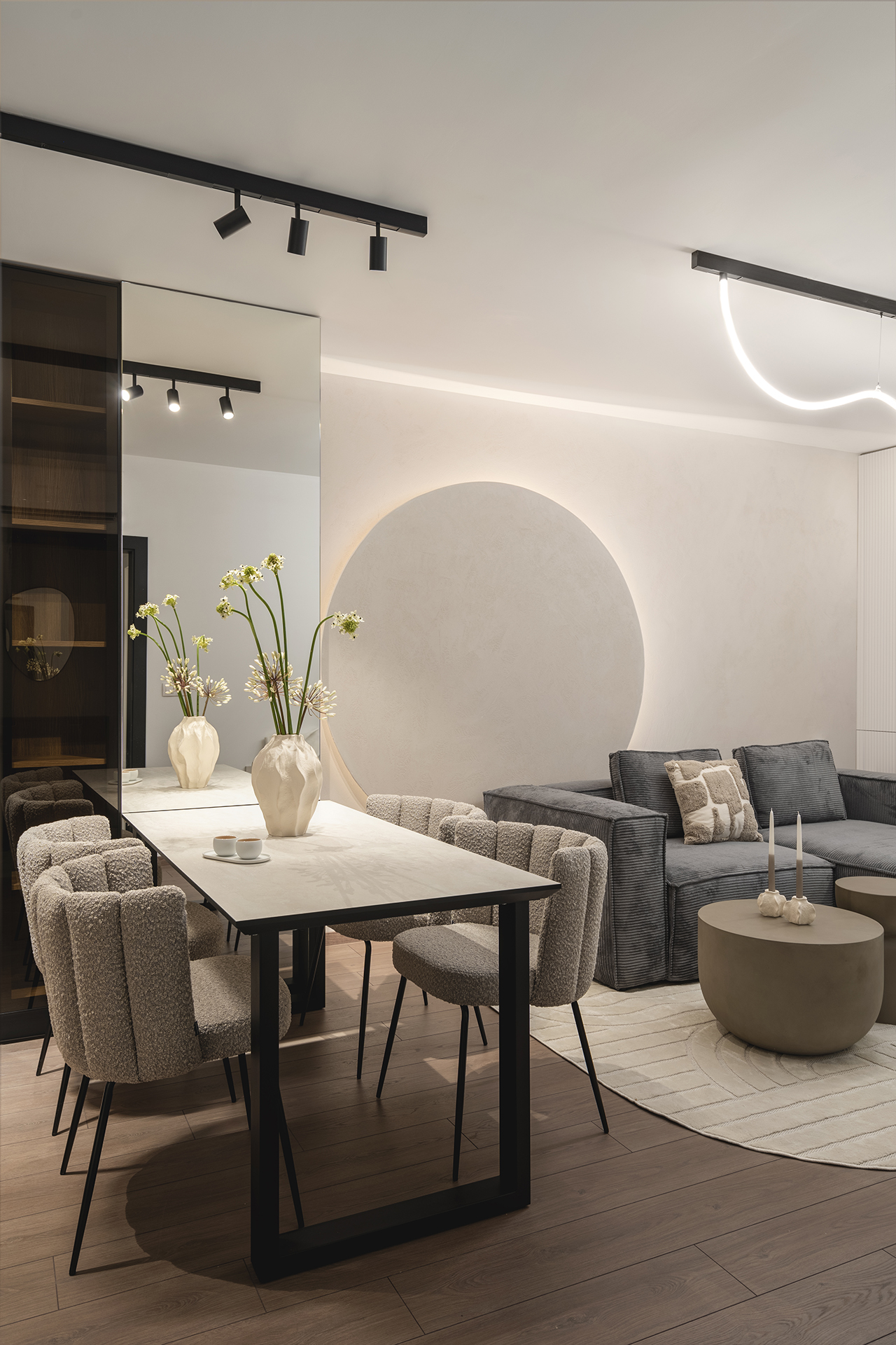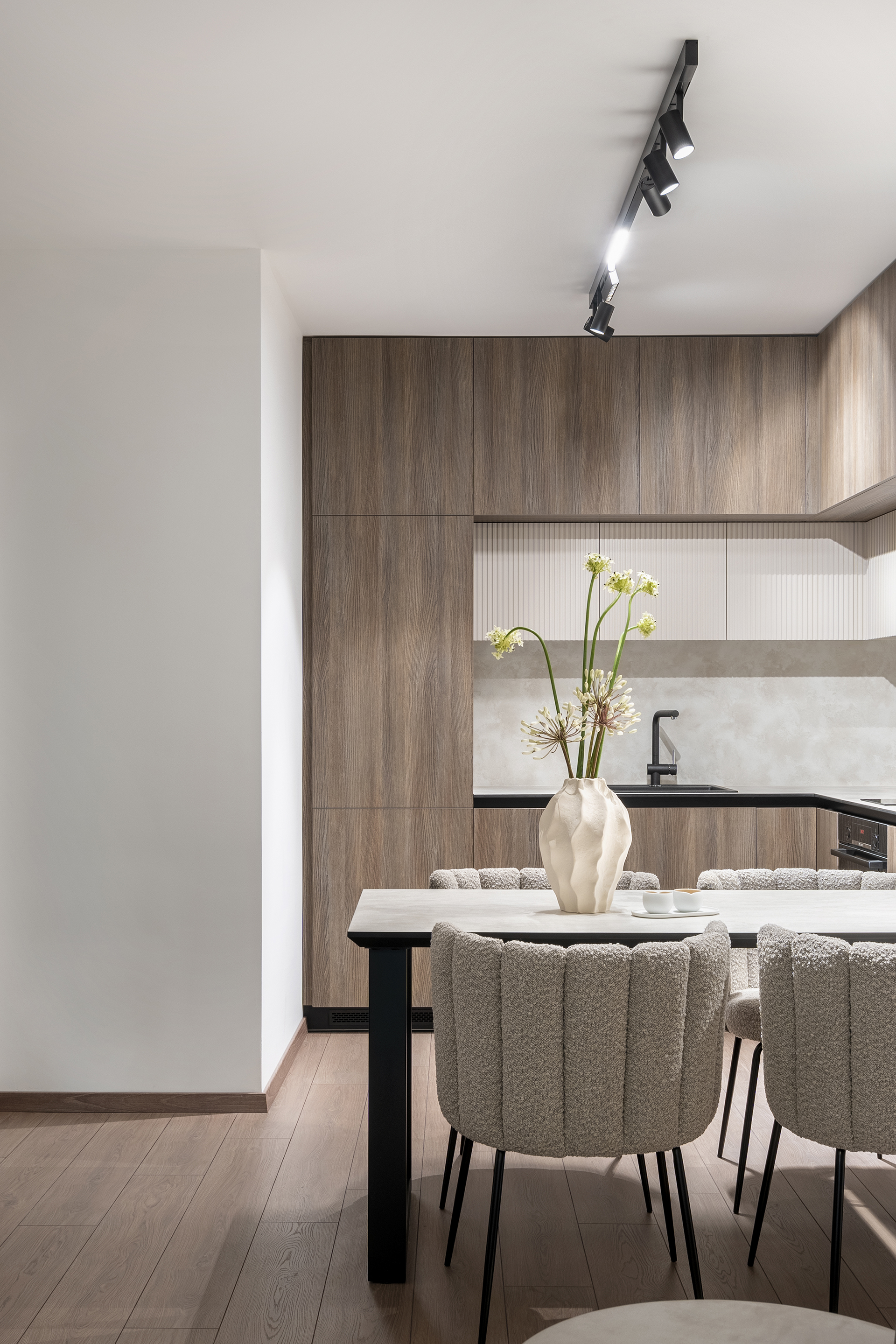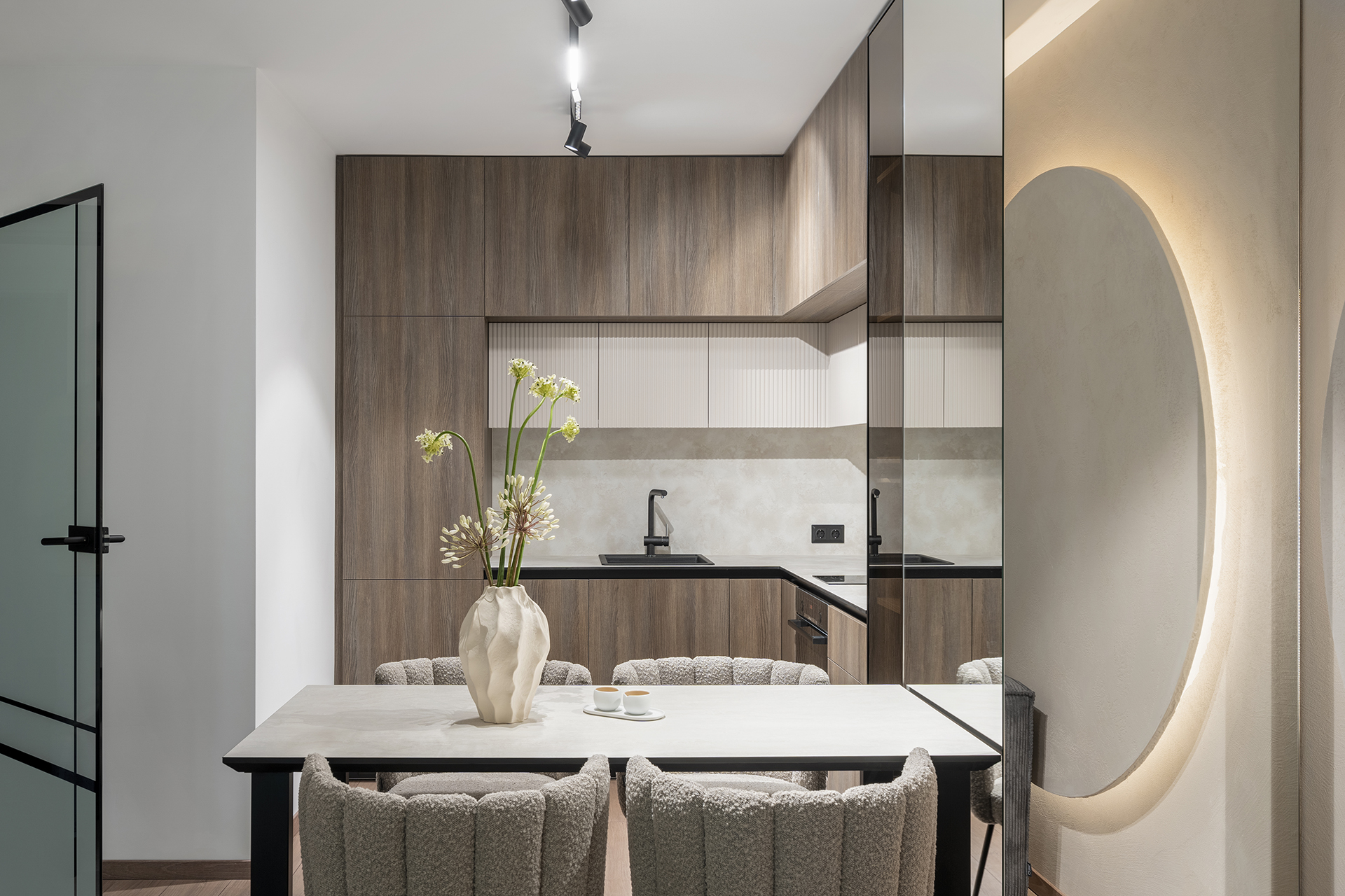 Дизайнът комбинира контрастни материали и богати текстури: топло дърво, структурни повърхности, камък и акцентни тъмни елементи. Тези композиции създават визуална дълбочина и характер, които придават на апартамента по-висока стойност въпреки компактната му квадратура. Осветлението е използвано като ключов инструмент – скритите линии и зоналното осветяване моделират пространството и подчертават архитектурните детайли.