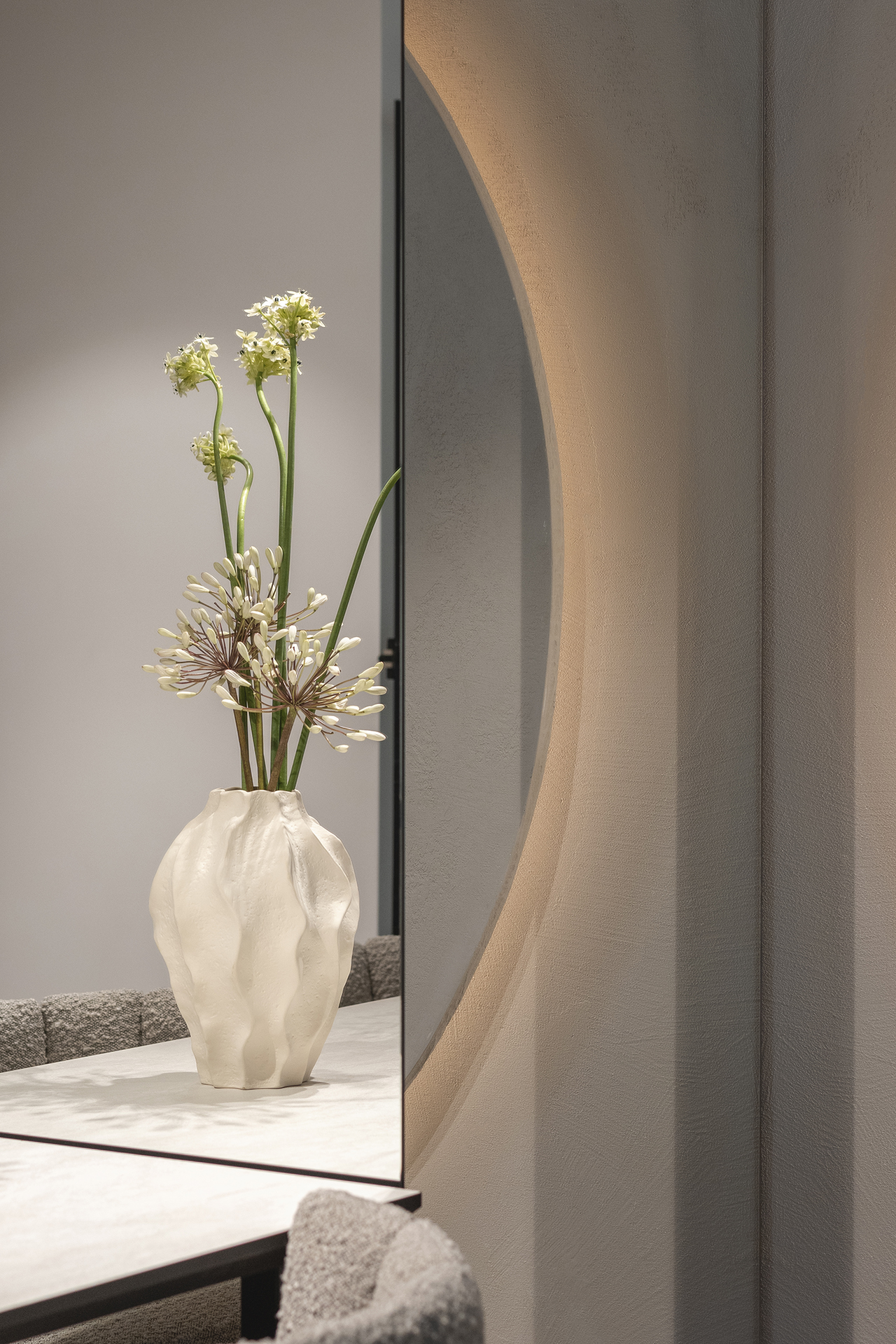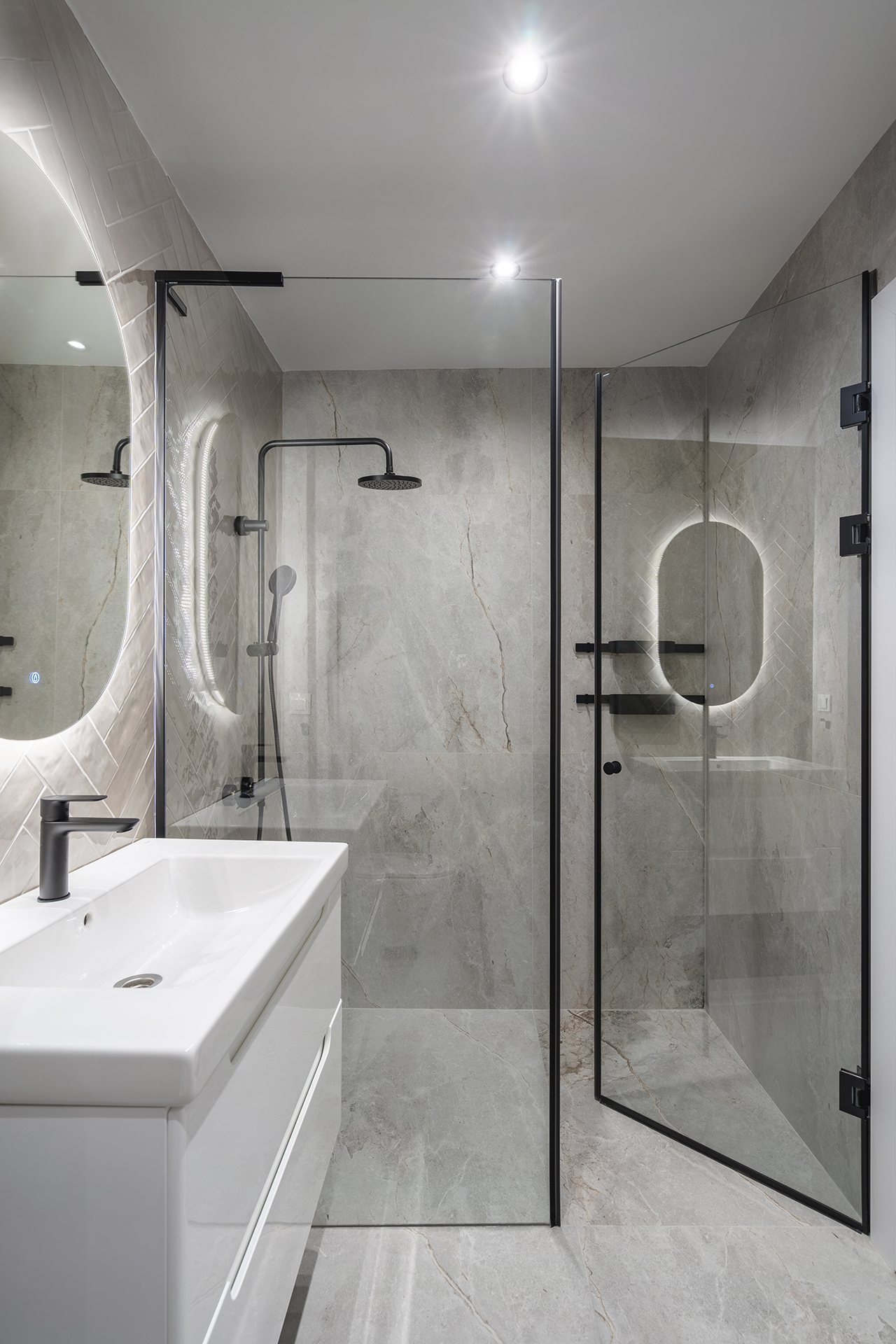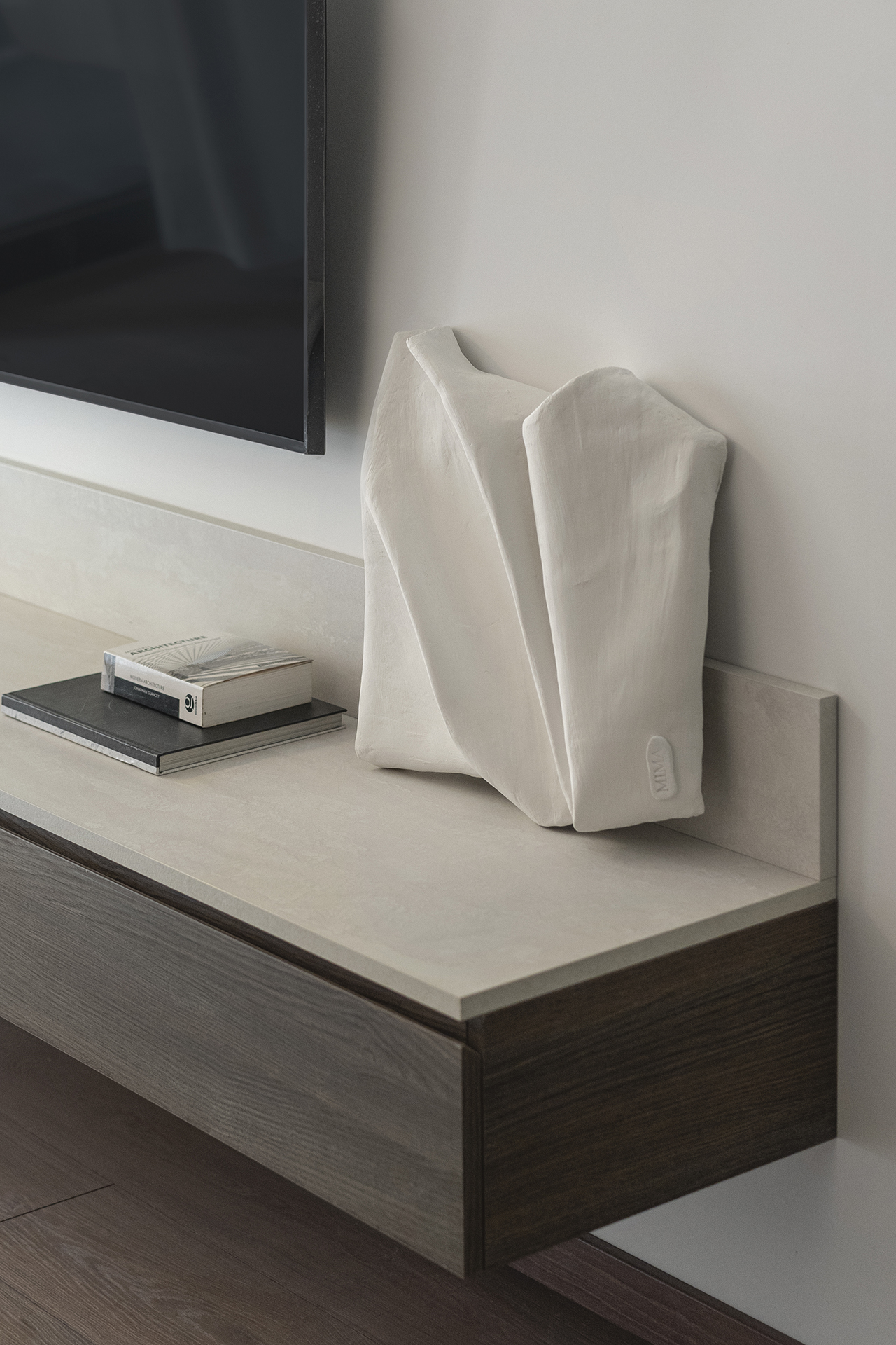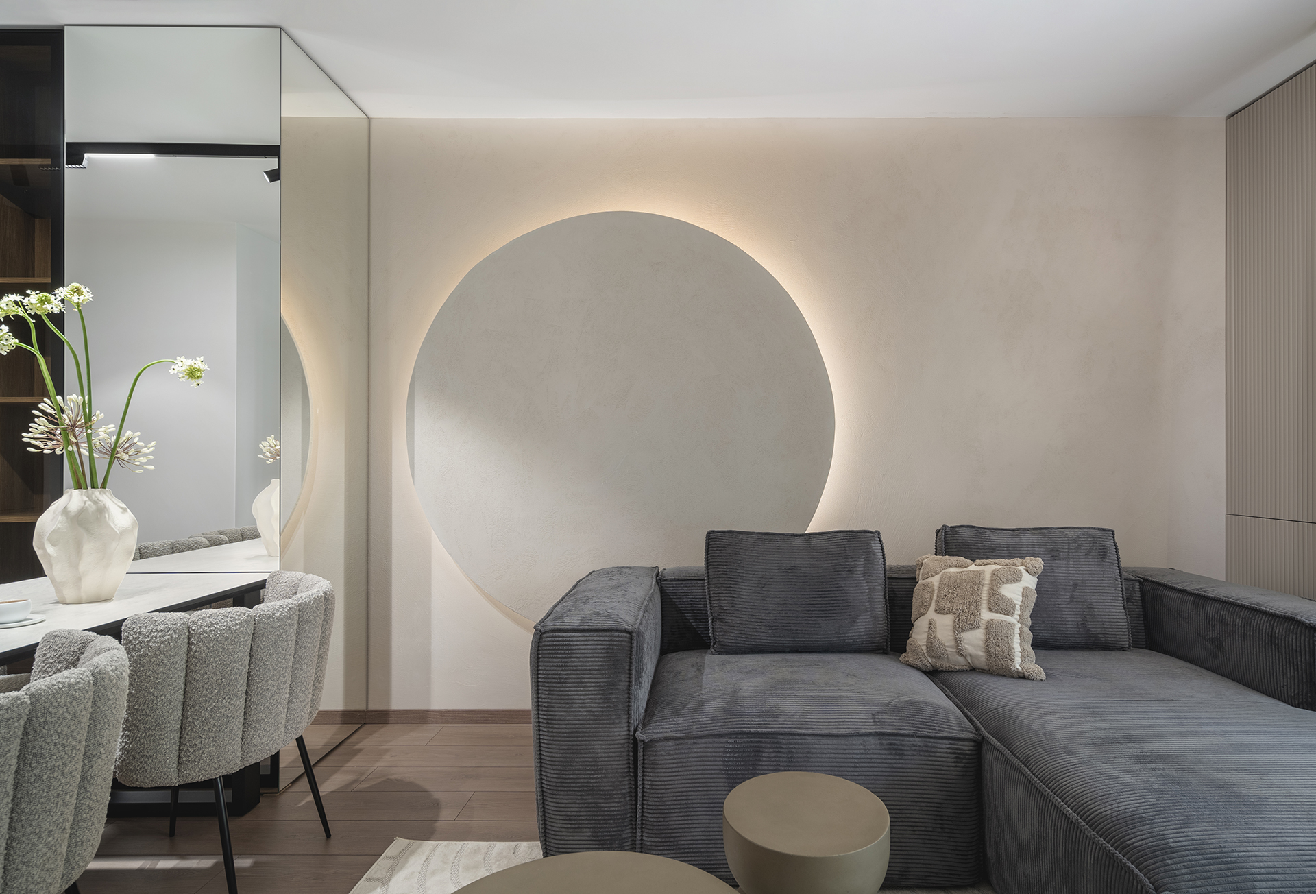 Дизайнът комбинира контрастни материали и богати текстури: топло дърво, структурни повърхности, камък и акцентни тъмни елементи. Тези композиции създават визуална дълбочина и характер, които придават на апартамента по-висока стойност въпреки компактната му квадратура. Осветлението е използвано като ключов инструмент – скритите линии и зоналното осветяване моделират пространството и подчертават архитектурните детайли.