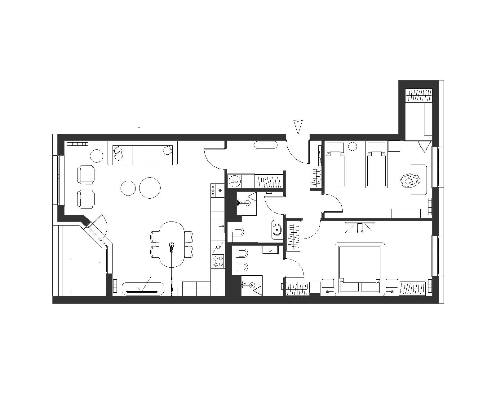 Жилището е с площ от 119 кв.м, с типичното разпределение на градско жилище, където се налага съвместяването на различни зони в едно пространство - най-голямото събира дневна, кухня и трапезария, а антрето приютява мокрото помещение.
