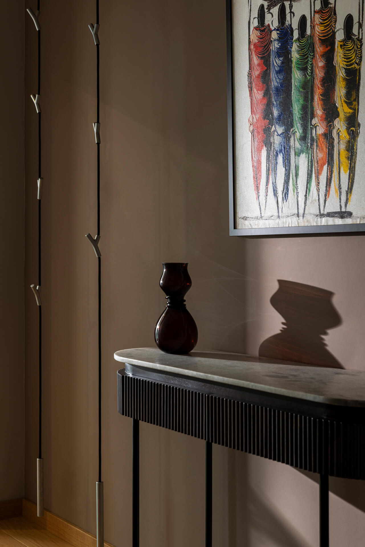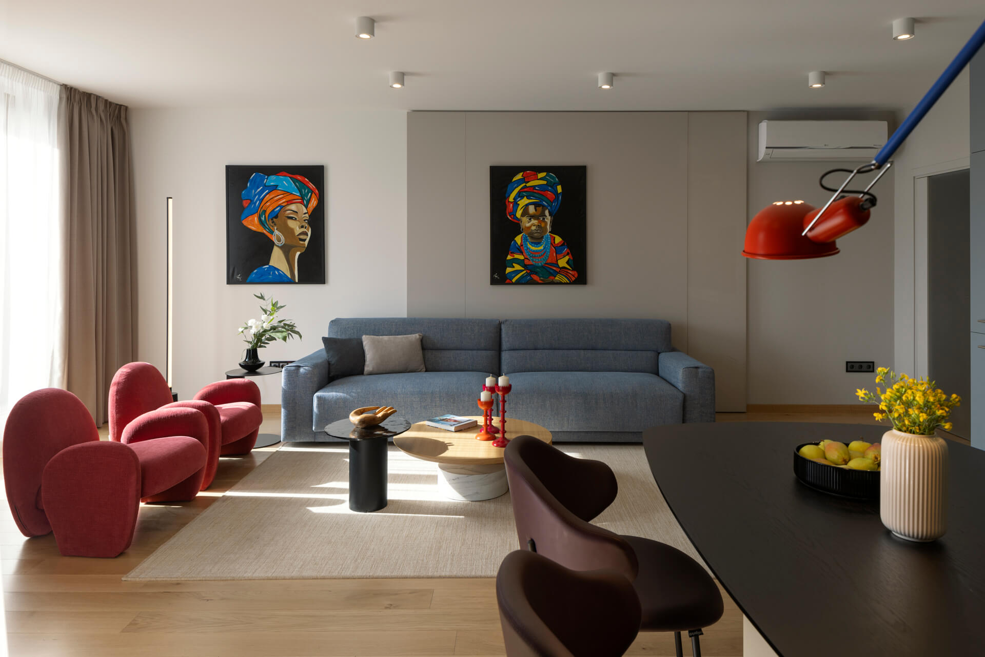 Located on the top floors of a newly built residential building in Sofia, this 119-square-metre apartment benefits from generous natural light and open city views. The project balances individuality with comfort and functionality, responding to the requirements of contemporary urban living. The layout follows a classic residential structure, with clearly defined zones unified within a cohesive whole. The main living area brings together the living room, kitchen and dining space, while the entrance hall also accommodates a utility room. The living area introduces the design concept — a refined interpretation of Africa’s vibrant, multi-layered aesthetic, inspired by the homeowners’ passion for travel. Colour and texture play a central role throughout, appearing in custom cabinetry, upholstered furniture, kitchen wall panelling and accent lighting to create a dynamic yet well-ordered space. The same concept extends into the private areas of the home. In the master bedroom and children’s room, it is expressed through a softer colour palette, creating a calmer atmosphere. Here, textiles take precedence, with upholstery, curtains, wallpapers and carefully integrated lighting enhancing comfort for both adults and children. The two bathrooms, located within the apartment’s night zone, are designed in darker tones with subtle accent lighting. References remain understated and intuitive, contributing to a cohesive overall mood. This project demonstrates how bold colour can be applied with restraint and elegance, resulting in an interior that is both expressive and highly functional.