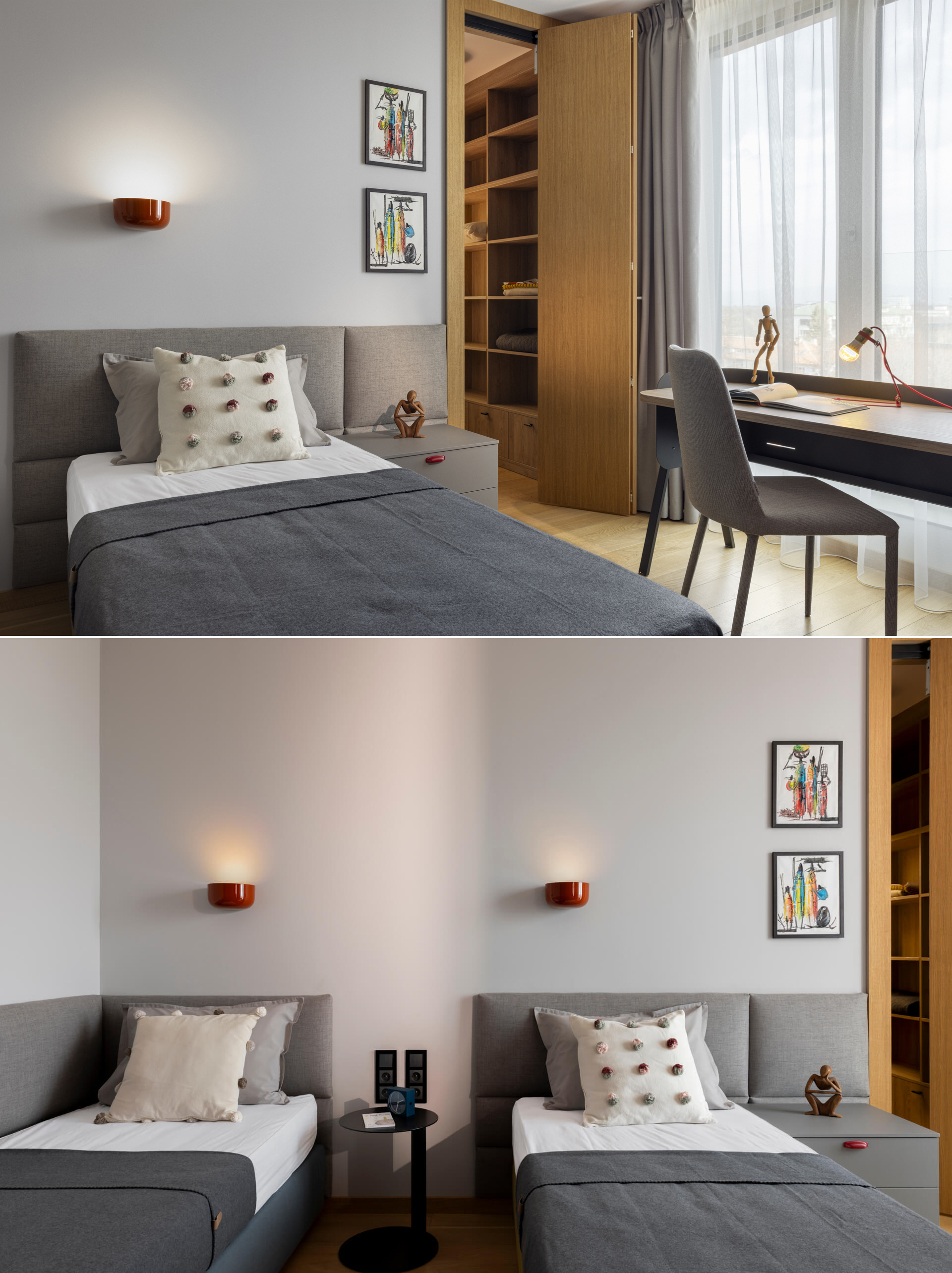 Зададената тема, макар и с по-дискретни цветови комбинации с цел да създадат по-спокойни пространства, продължава и в родителската спалнята и детската стая. Тук доминира текстилът – в дамаските, в завесите и в тапетите, засилвайки усещането за комфорт в тези лични пространства – на родители и деца. Двете бани на жилището, разположени в „нощната зона“, са решени в тъмни цветове и с меко акцентно осветление, препратките и тук са по-скоро интуитивни, отколкото буквални.