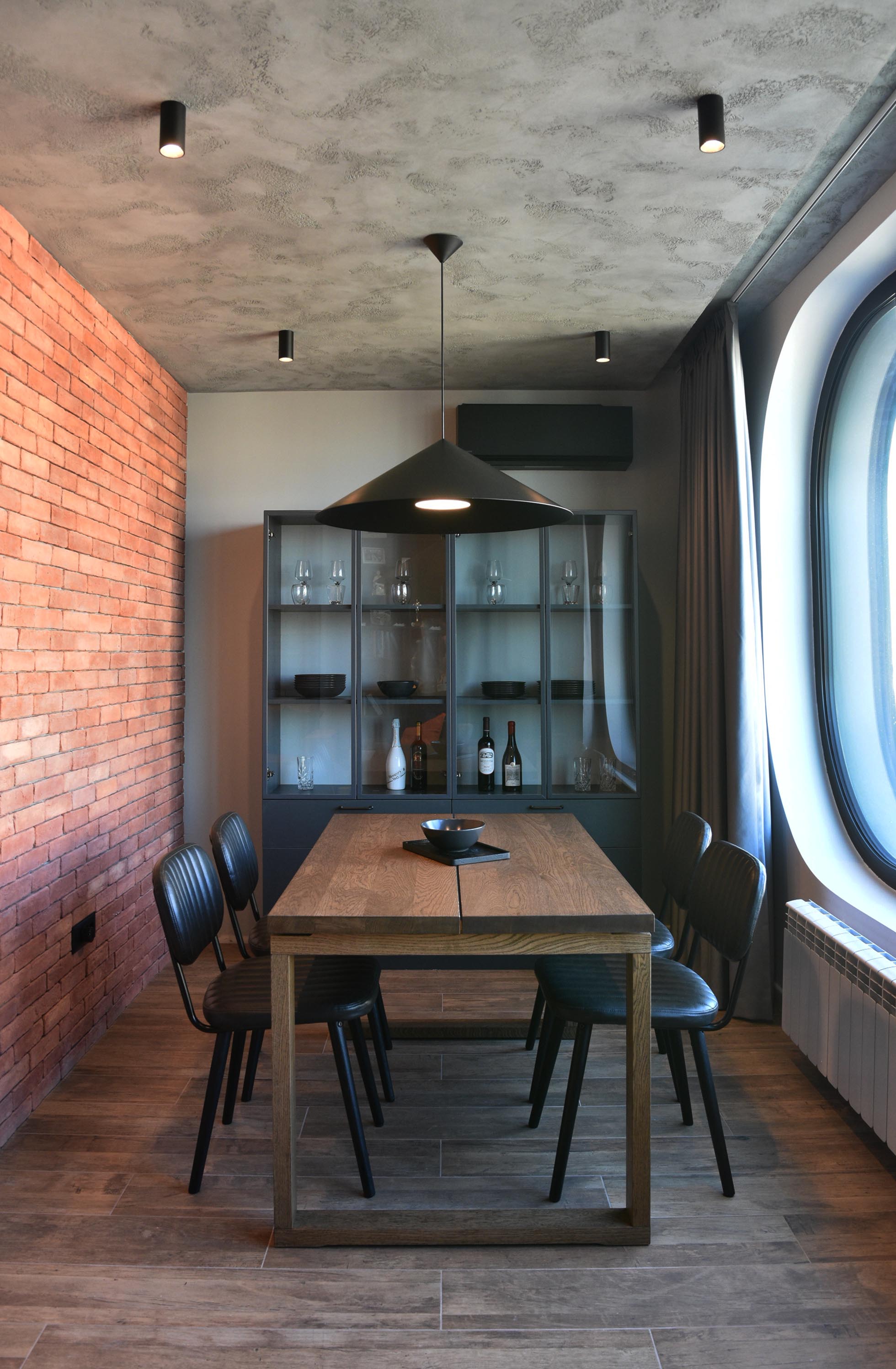 Its design shows a contrast between the Industrial style (displayed through dark tones, black metals, and concrete effect) and the warmer colors of the brick, wood elements, and leather. The dark built-in furniture visually defines the boundaries of different areas in the overall space, while the general color style emulates the industrial exterior of the modern building, thus bringing the outside in.