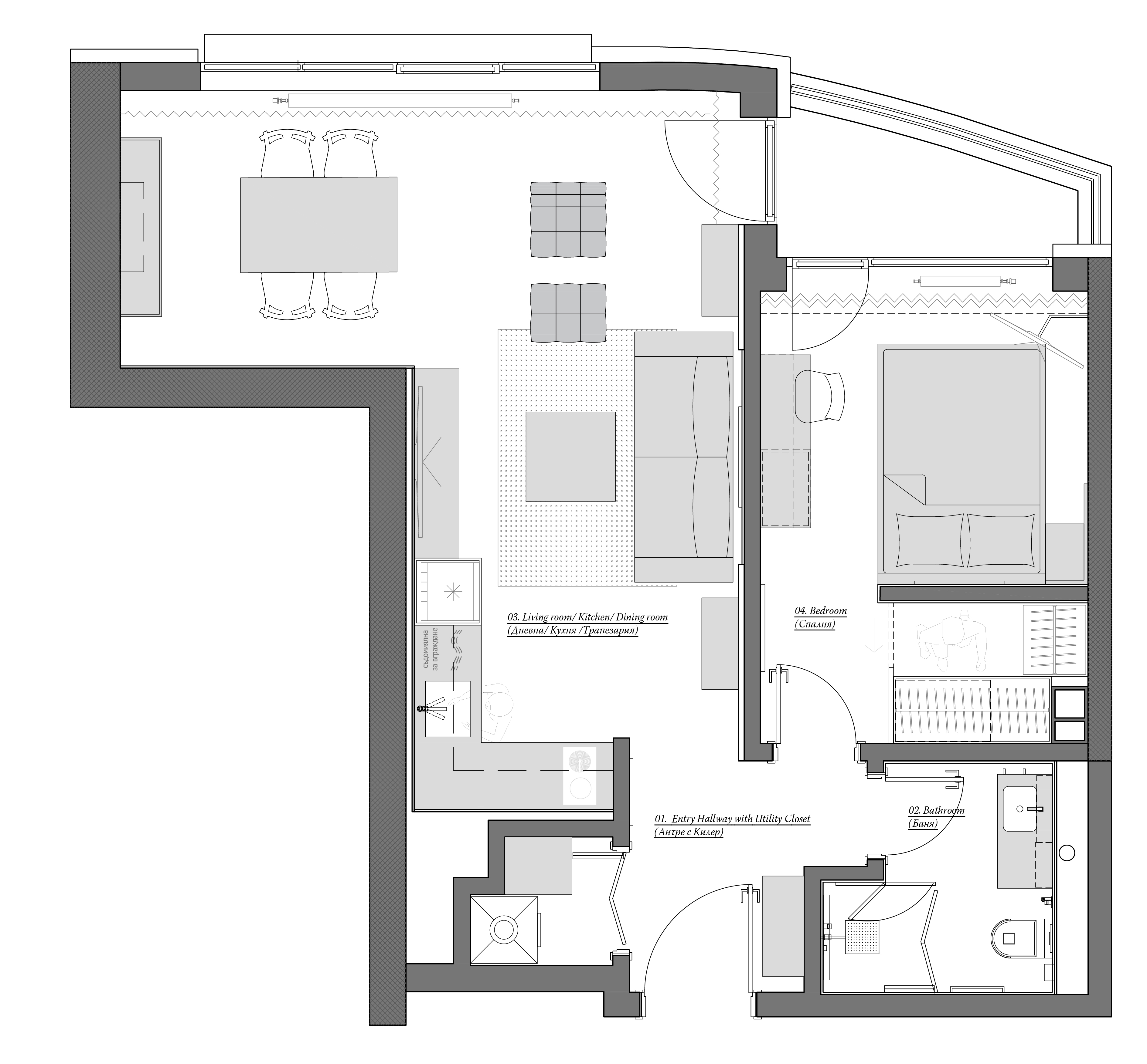 The layout proposed by the builder was dysfunctional and generic. In the new layout a simple and ergonomic scheme allows for practical grouping of uses within the larger space, while also creating new, flexible areas for more functionality. As you enter there is a place for storage of shoes and jackets. A small Utility Closet combines a general storage, mechanical and laundry area, hidden behind a folding door. The kitchen and living room are combined as the most utilized areas of a home, and just around the corner, a dinning area is visually separated for gatherings. The Bathroom has a shower with glass folding doors, which open up or enclose the space, according to the needs. In the bedroom, a dividing wall creates a walk-in closet behind the bed, rarely seen in a small bedroom.