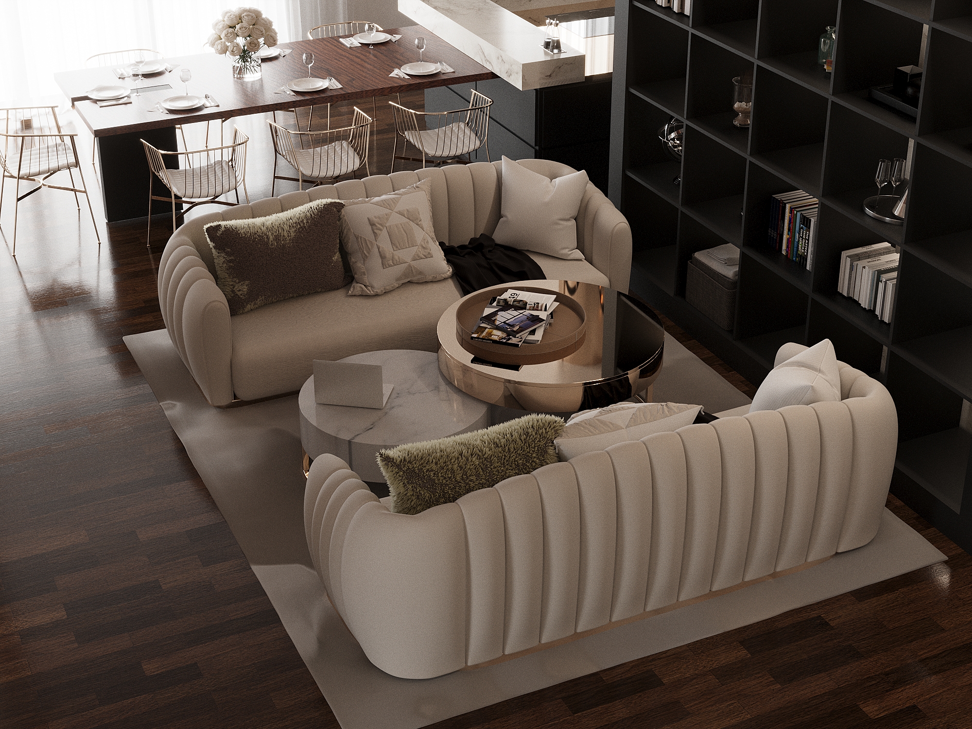 Дизайнът в основното помещение разчита на ясно обособени зони, които предлагат удобство и функционалност.