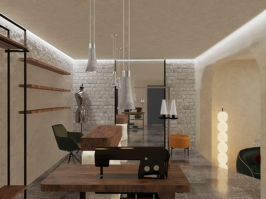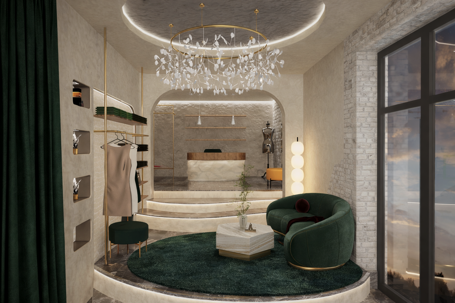 Преградните стени са проектирани с органични кривини и меки преходи между вертикални и хоризонтални повърхности. Използвана е гипсокартонена конструкция с прецизно оформени радиуси, позволяваща интеграция на скрито осветление в пода и тавана.