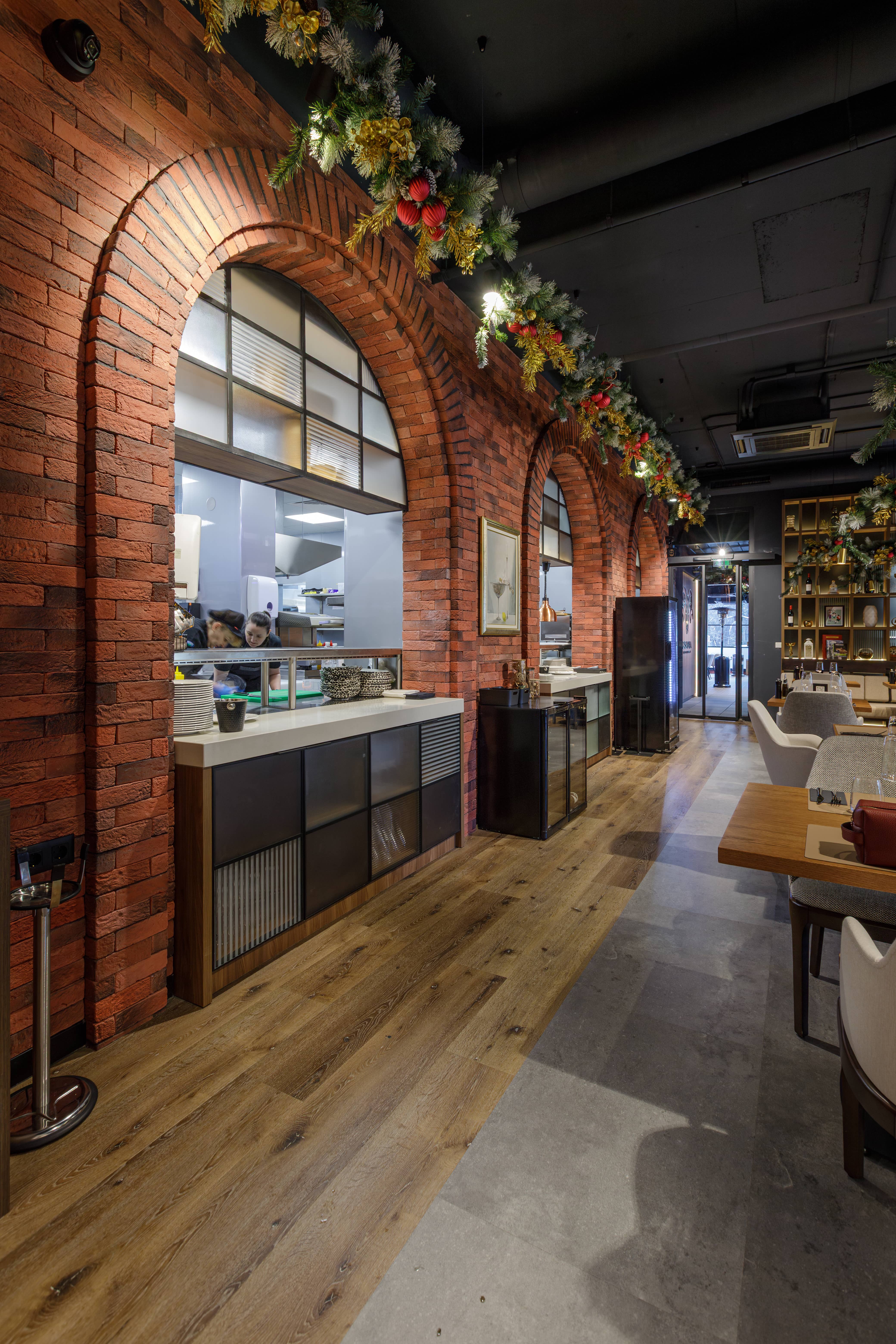Архитектурният език използва тухлата като основен наративен елемент, който препраща към здравите основи на миналото и сигурността на изграденото настояще. Тя не е търсен ефект, а символ на фундамента, на здравата основа и на автентичната личност, чиято история разказва ресторантът.
