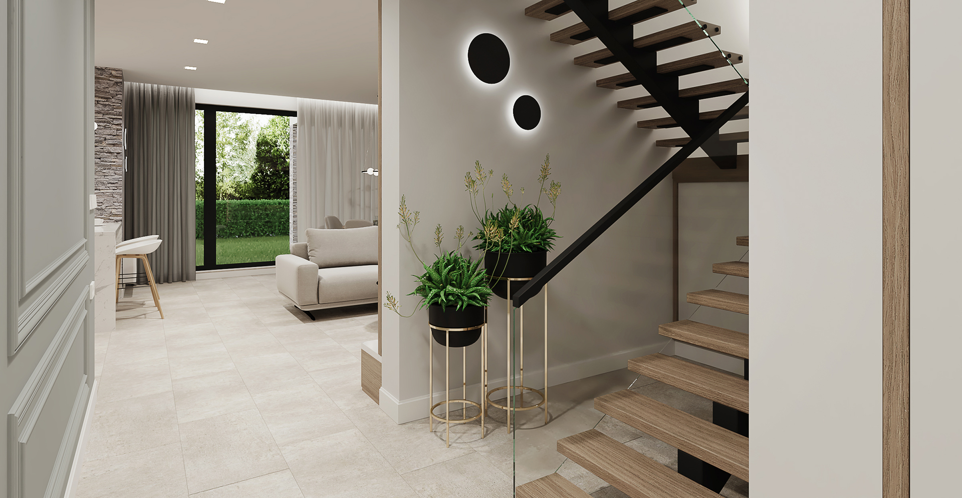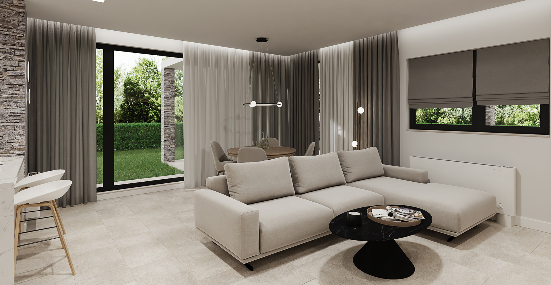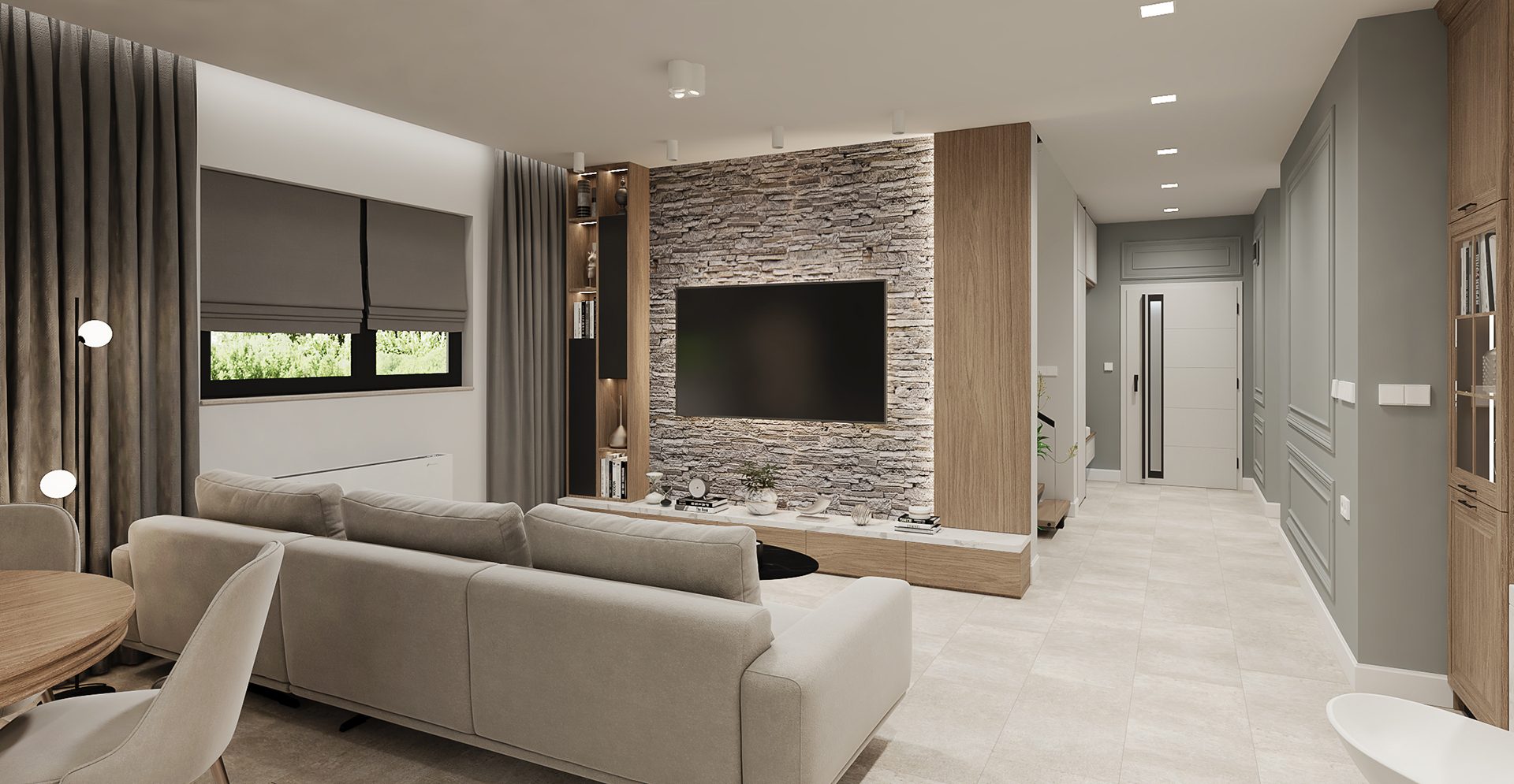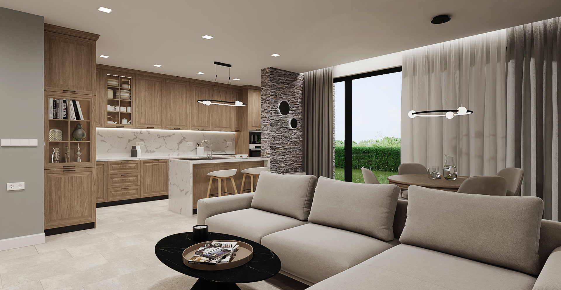 Дневна с кухня в частна къща. Използвахме камък и дърво (собствениците са производители на каменни облицовки и настилки), за създаване на уютна обстановка без да надделява единия материал над другият. Като материали са използвани камък за под и две стени и масивно дърво за мебелите. Предизвикателството в случая е, че Ел-а. ОВК-то и ВиК-то бяха изпълнени преди възлагане на интериора.