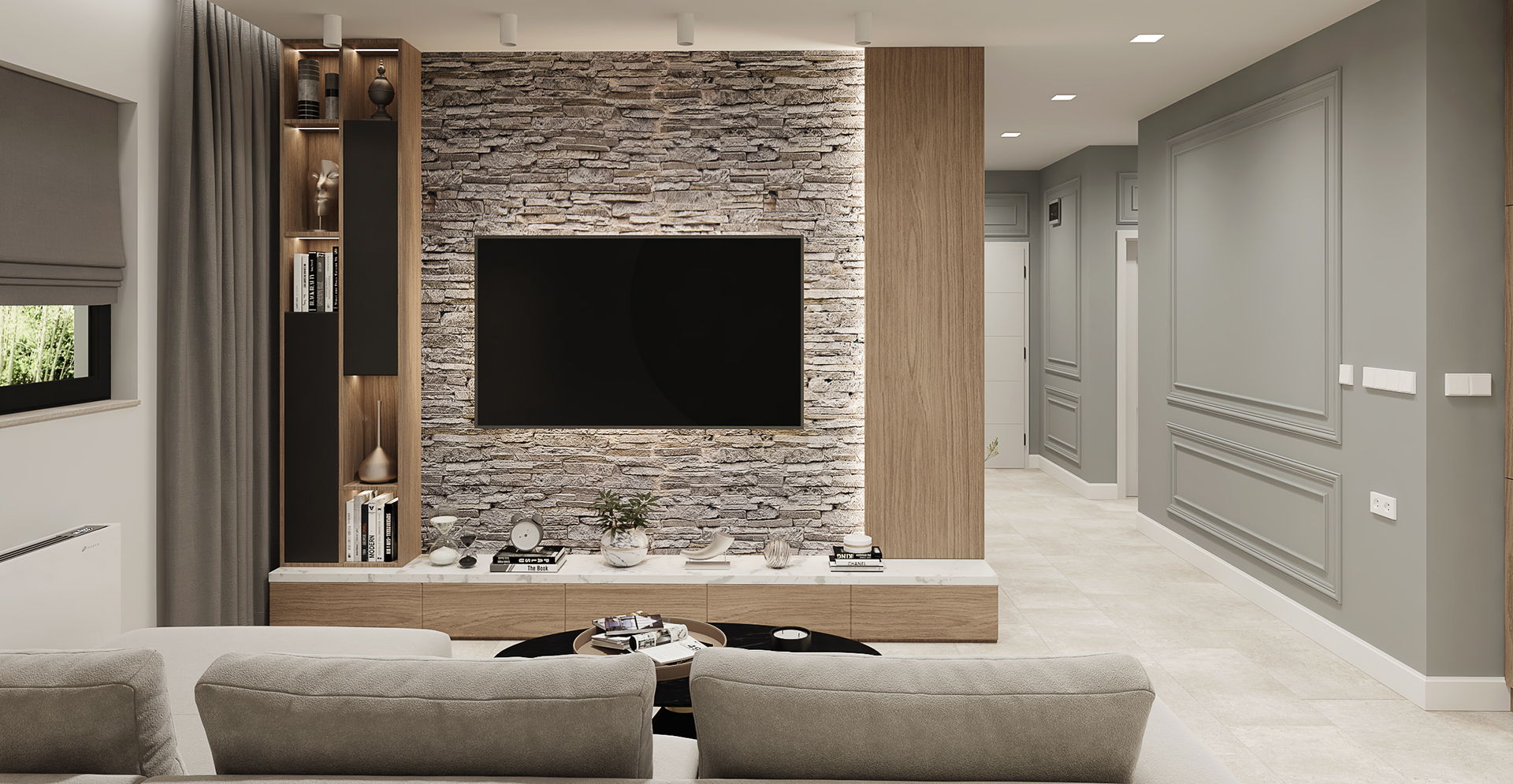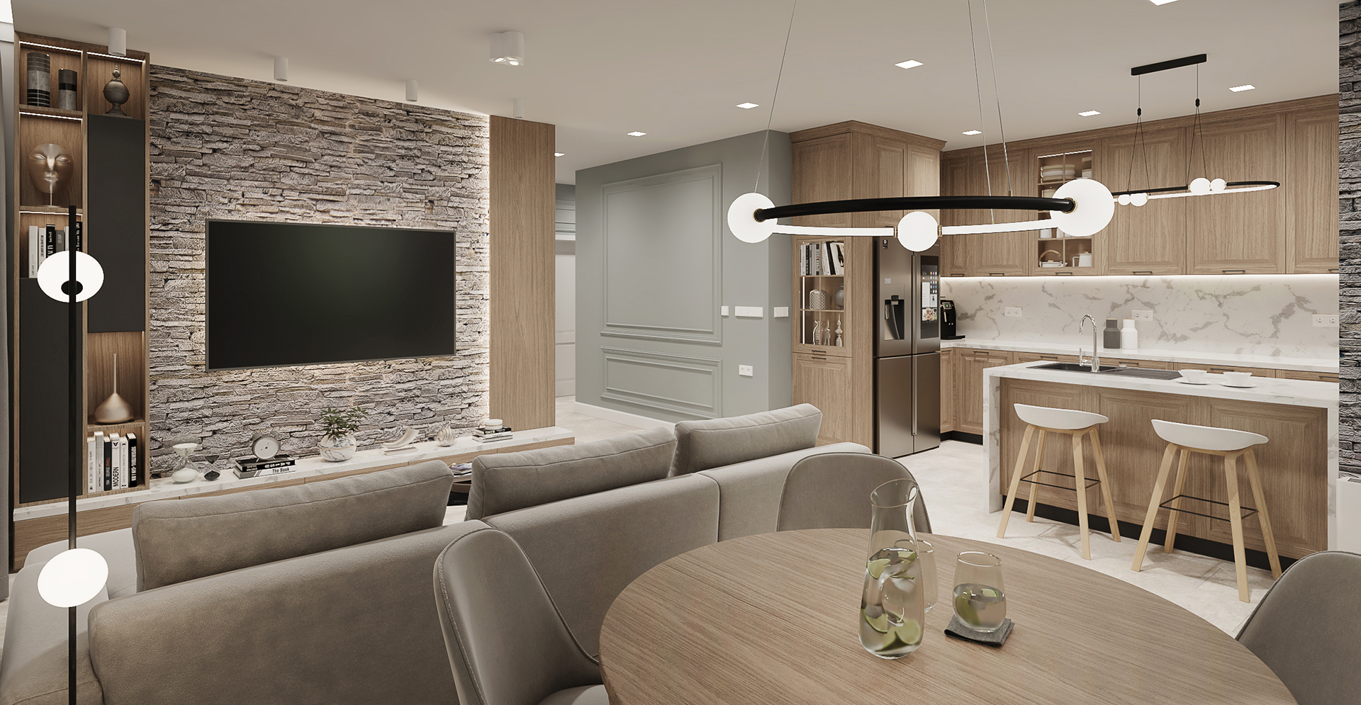 Дневна с кухня в камък и дърво