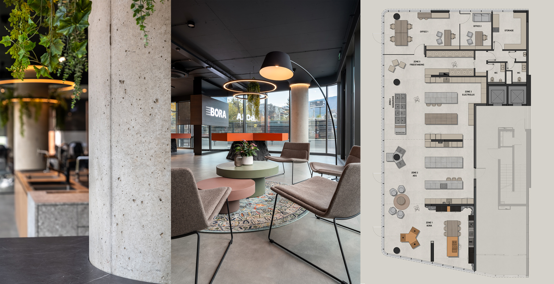 Шоурумът е организиран в четири основни експозиционни зони, предназначени за различни брандове. Всяка от тях носи индивидуална цветова идентичност, отговаряща на визуалния език на марката, но всички заедно са подчинени на общия стремеж към спокойна и уютна атмосфера – близка до домашната.