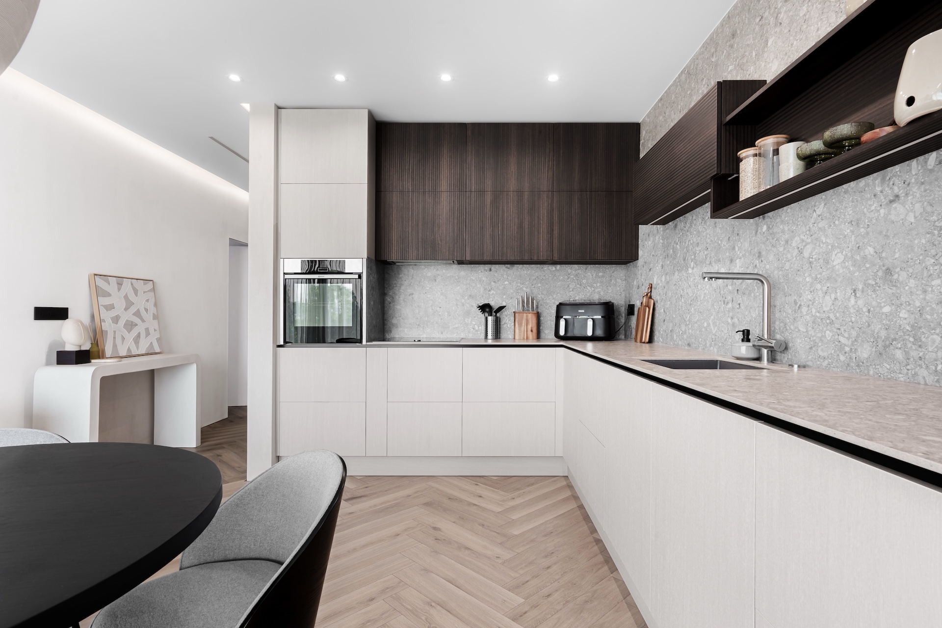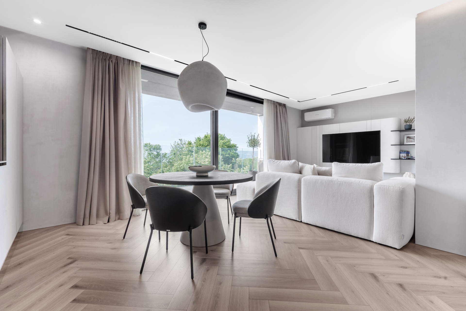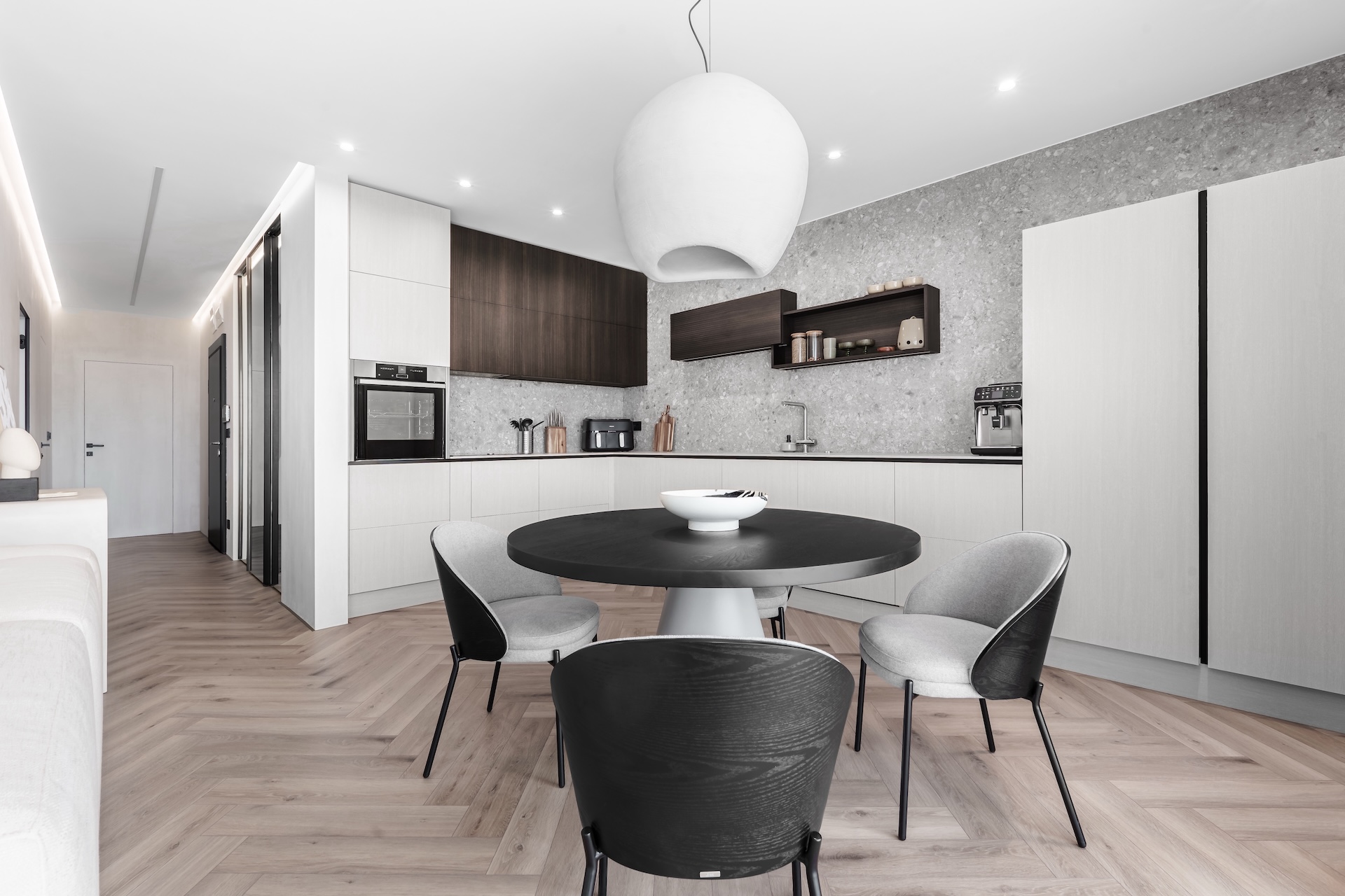 Кухнята и дневната зона се сливат в едно непрекъснато пространство, което диша. Облицовки от камък и дърво, кръгли форми и меки текстили създават усещане за съвременен уют, далеч от модните крайности, но изключително актуален в детайл.